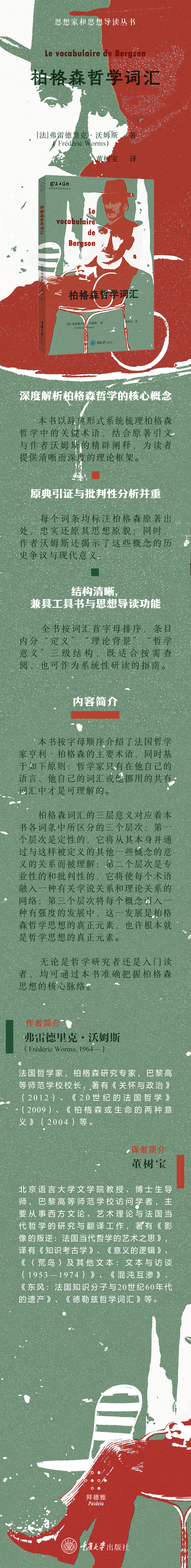 本书以辞典形式系统梳理柏格森哲学中的关键术语,结合原著引文与作者沃姆斯的精辟阐释,为读者提供清晰而深度的理论框架。
