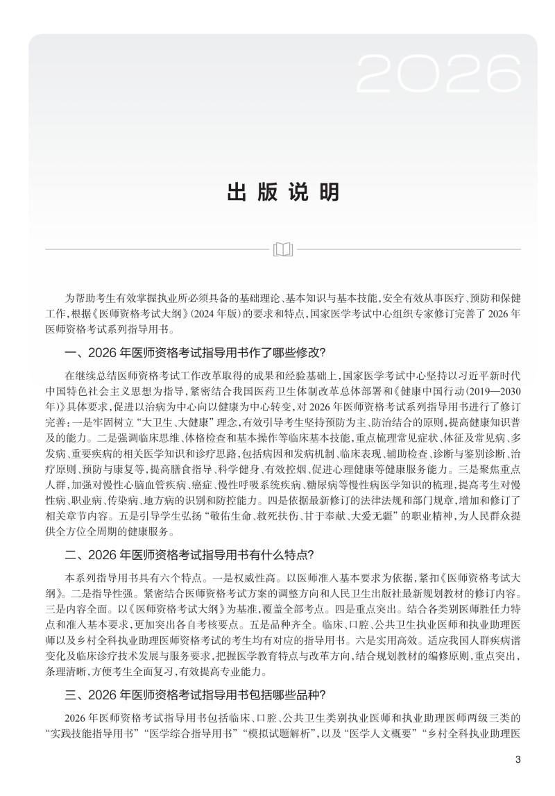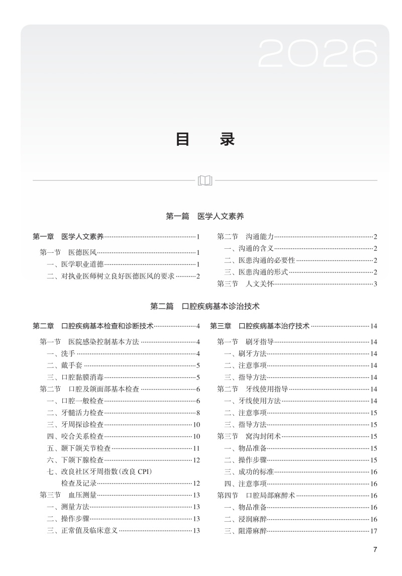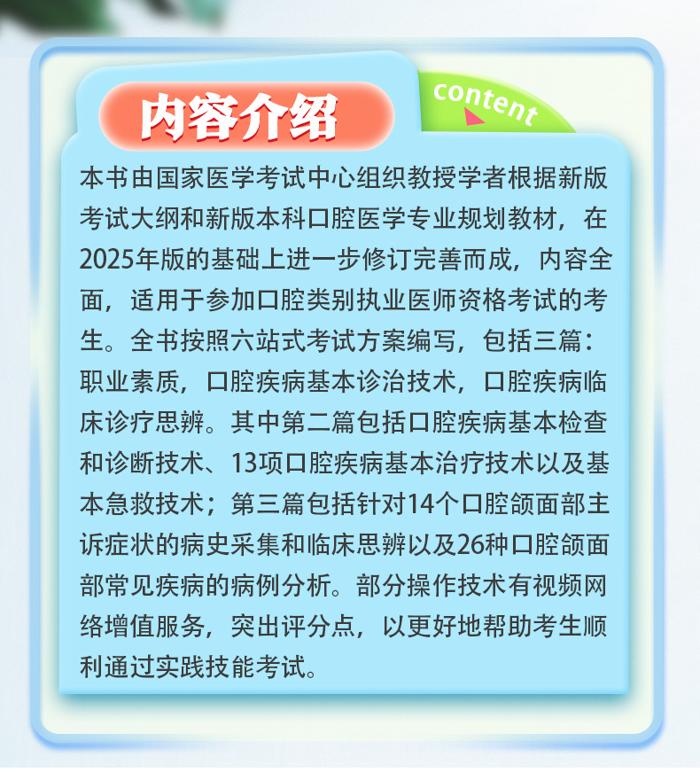 本书由国家医学考试中心组织教授学者根据新版考试大纲和新版本科口腔医学专业规划教材,在2025年版的基础上进一步修订完善而成,内容全面,适用于参加口腔类别执业医师资格考试的考生。全书按照六站式考试方案编写,包括三篇:职业素质,口腔疾病基本诊治技术,口腔疾病临床诊疗思辨。其中第二篇包括口腔疾病基本检查和诊断技术、13项口腔疾病基本治疗技术以及基本急救技术;第三篇包括针对14个口腔颌面部主诉症状的病史采集和临床思辨以及26种口腔颌面部常见疾病的病例分析。部分操作技术有视频网络增值服务,突出评分点,以更好地帮助考生顺利通过实践技能考试。