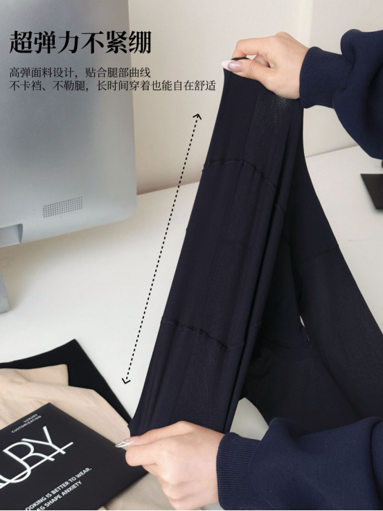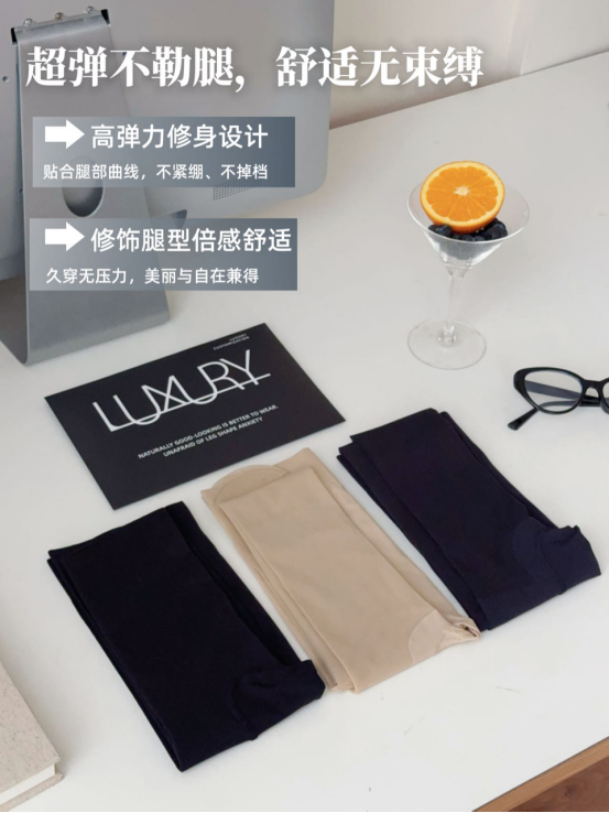 高弹贴合,不勒腿不下滑! 很多丝袜要么太紧,勒得腿部不舒服 要么太松,走两步就滑下来 而这款袜子采用360°高弹包裹设计 既能紧贴腿部曲线 又不勒肉,全天穿着都很自在!