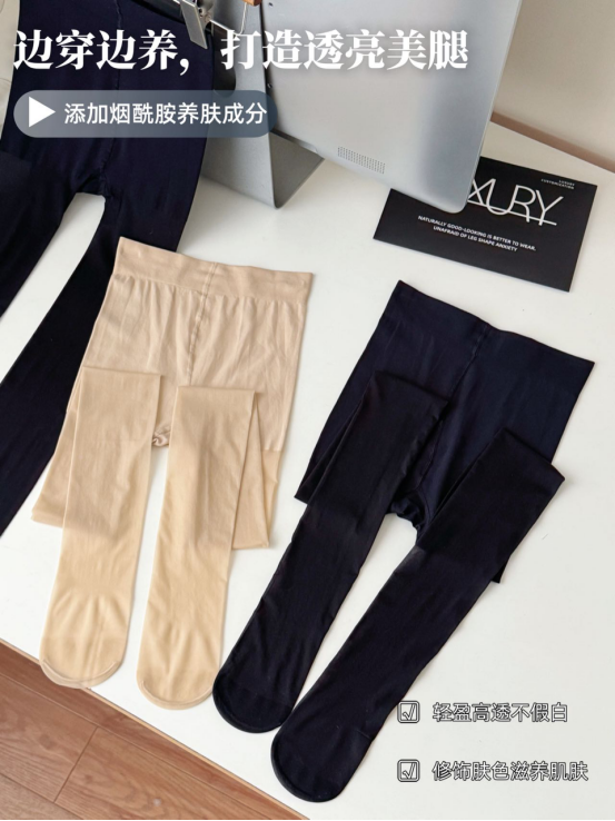 添加烟酰胺,边穿边养肤! 传统丝袜 vs. 烟酰胺美肤袜的最大区别 就是这双袜子能“护肤”! 不仅是简单的遮盖瑕疵 而是真正改善腿部肤色 让你的双腿“穿得更健康”!