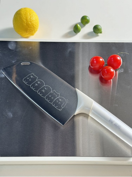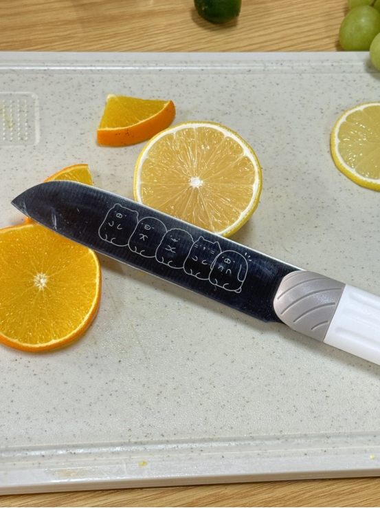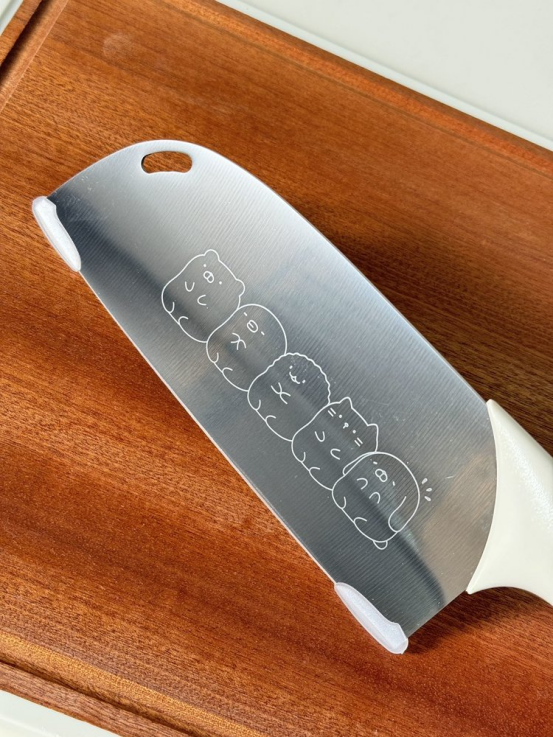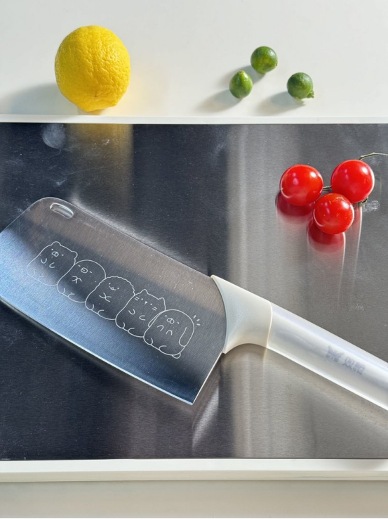 而且弧形刀还有一个优点 就是不伤菜板 传统的直刃刀 遇到使用年限较久的菜板难切断 弧形刀适配各种菜板! ✅论颜值 主打一个简约可爱风格 刀身上还有可爱的卡通图案呢 萌宠在手,得心应手 颜值在线 家里想要套刀具 但又觉得市面上的好刀太贵了 劝你们赶紧入手这款双枪彩妆刀试试