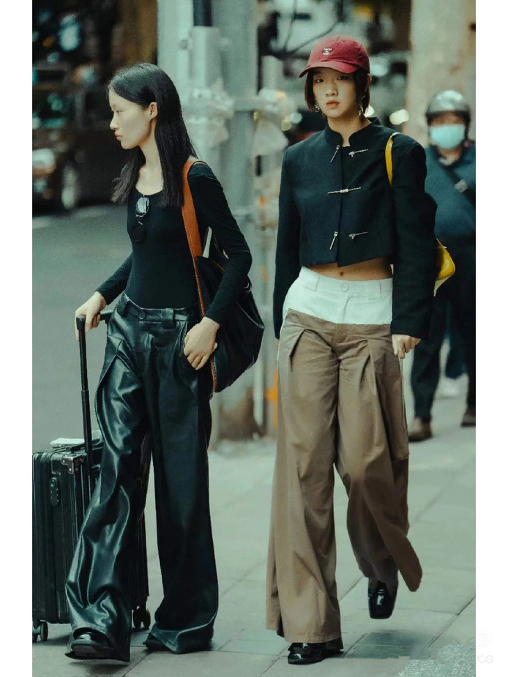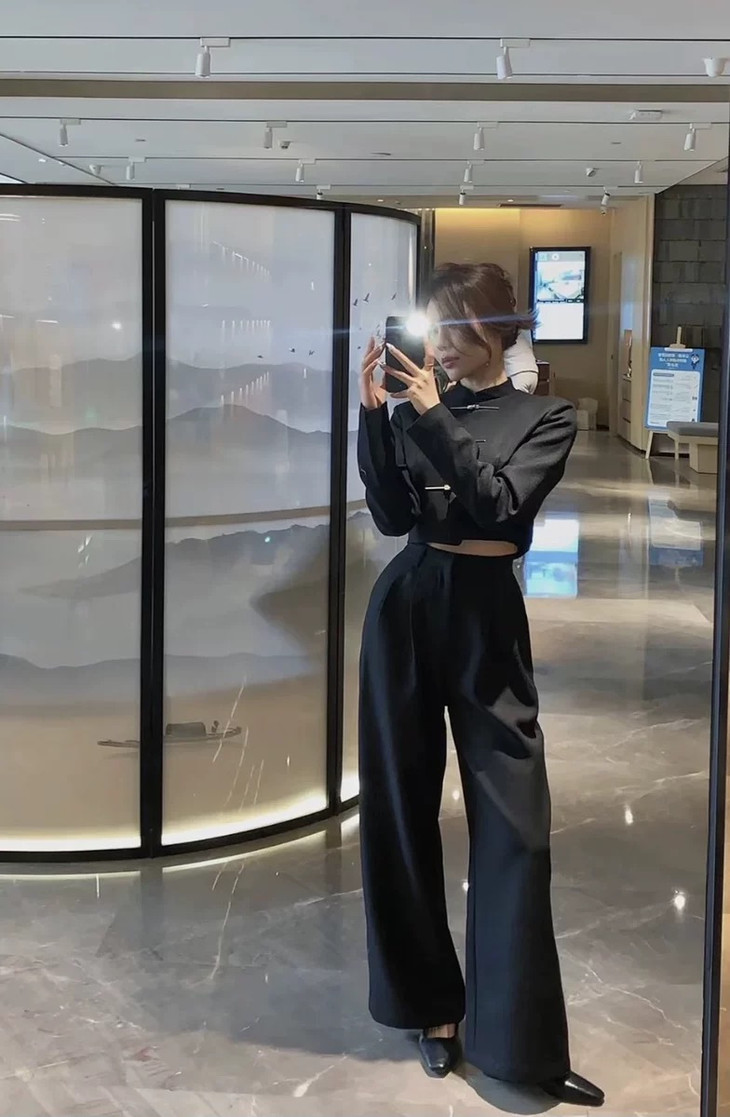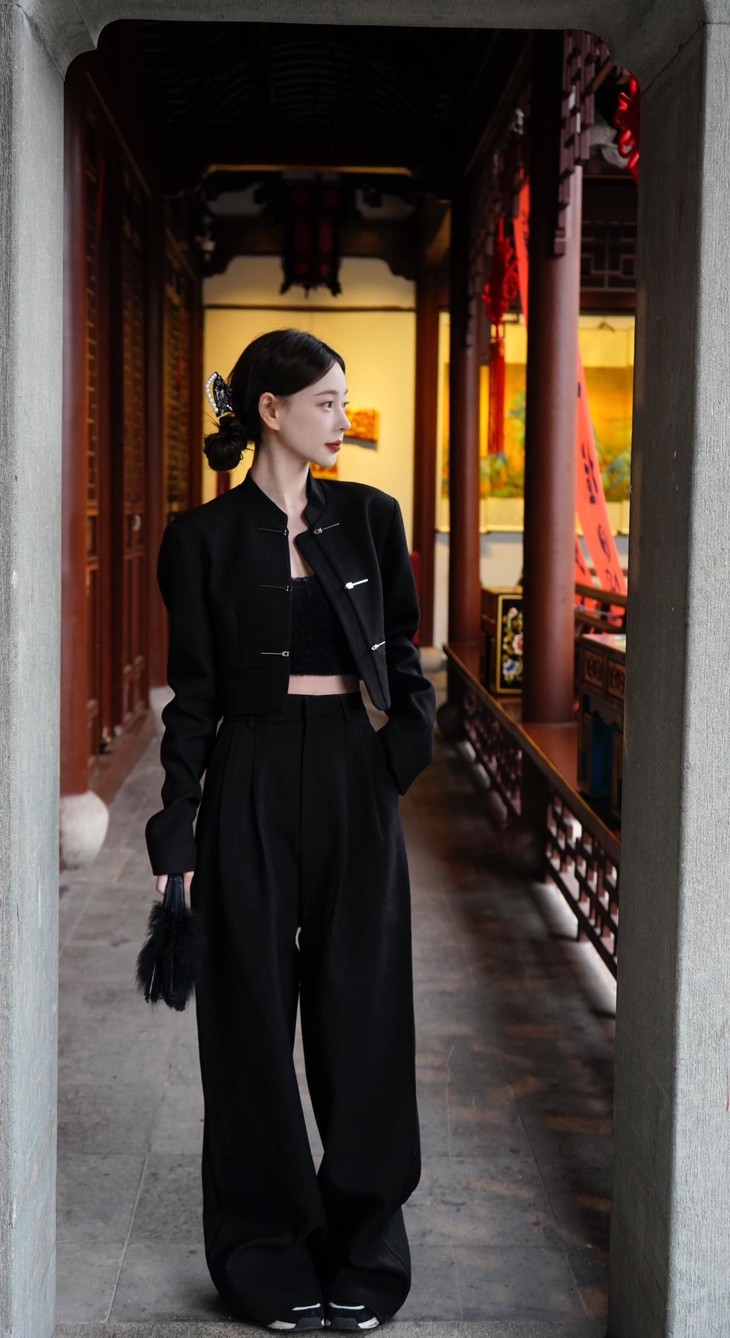 这套新中式套装穿搭采用三七分!! 阔腿裤的版型,对各种身材都十分友好, 无论是纤细的双腿,还是略有肉肉的腿型,都能轻松驾驭。 它的宽松设计,走起路来随风飘动,尽显潇洒随性。 与汉服上衣搭配在一起,动静相宜, 既有着汉服的端庄典雅,又有着阔腿裤的时尚大气。 阔腿裤的长度恰到好处,微微拖地的设计, 为整个穿搭增添了一丝慵懒的氛围,不经意间流露出时尚感。