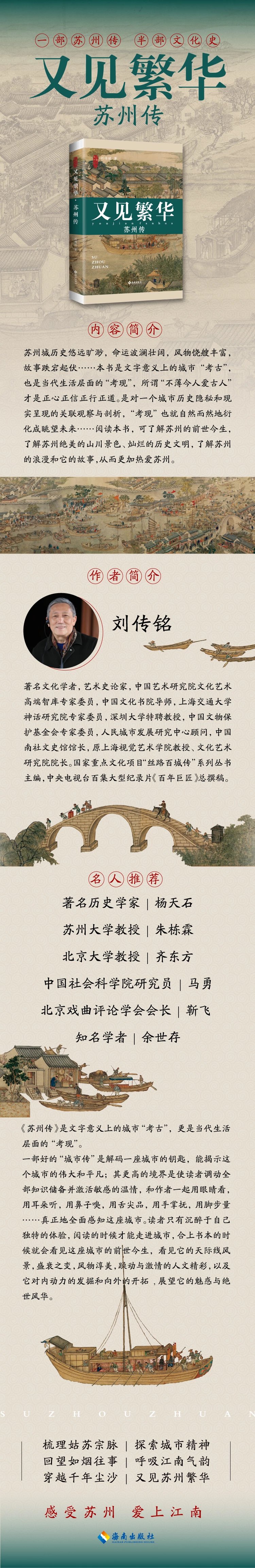 苏州城历史悠远旷渺,命运波澜壮阔,风物饶艘丰富,故事跌宕 起伏……关于苏州,“东方威尼斯”一类蹩脚的比喻和“上有天堂, 下有苏杭”的泛泛而论,一直无法满足人们对它的真爱与追问。