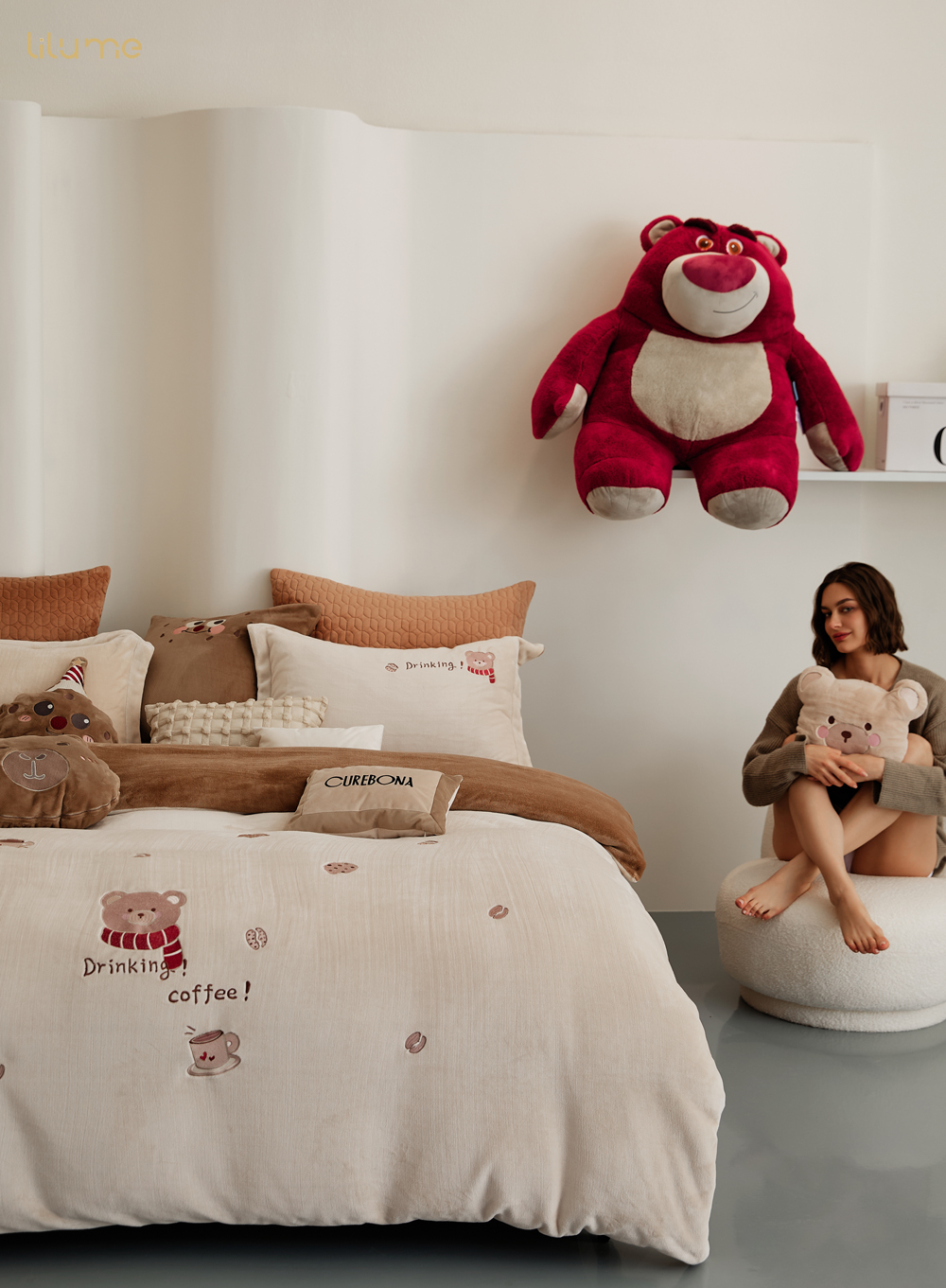 利路米秋季新款超细牛奶绒保暖四件套茶杯熊