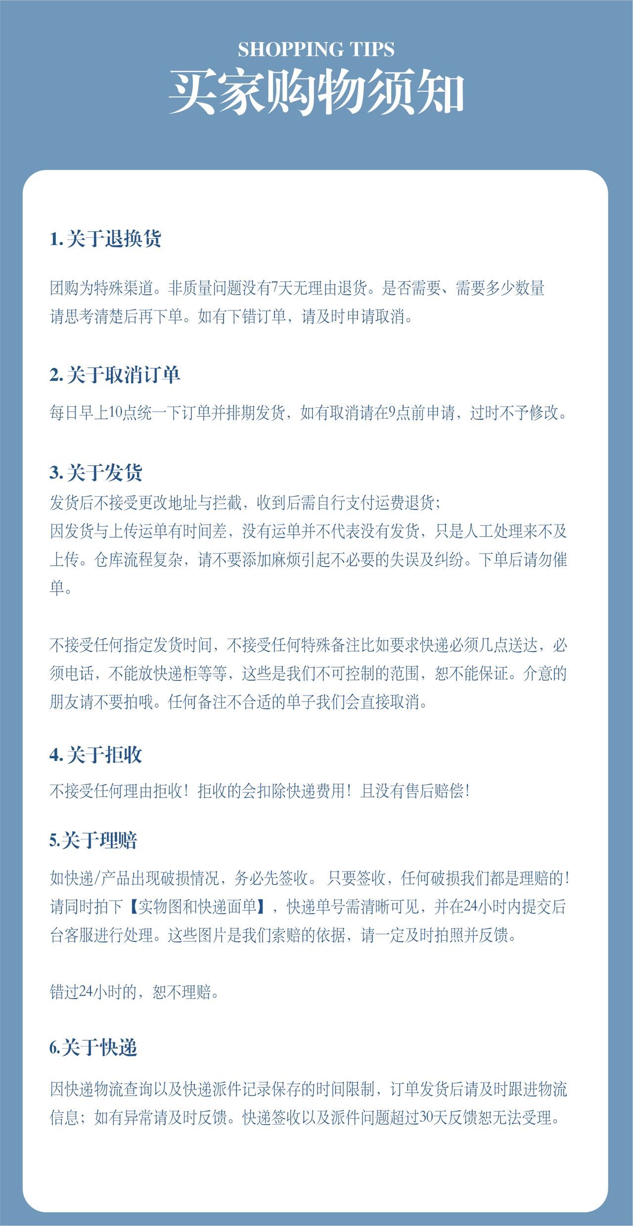 3、拒收不售后,质量问题可售后,售后时效为签收后24h。