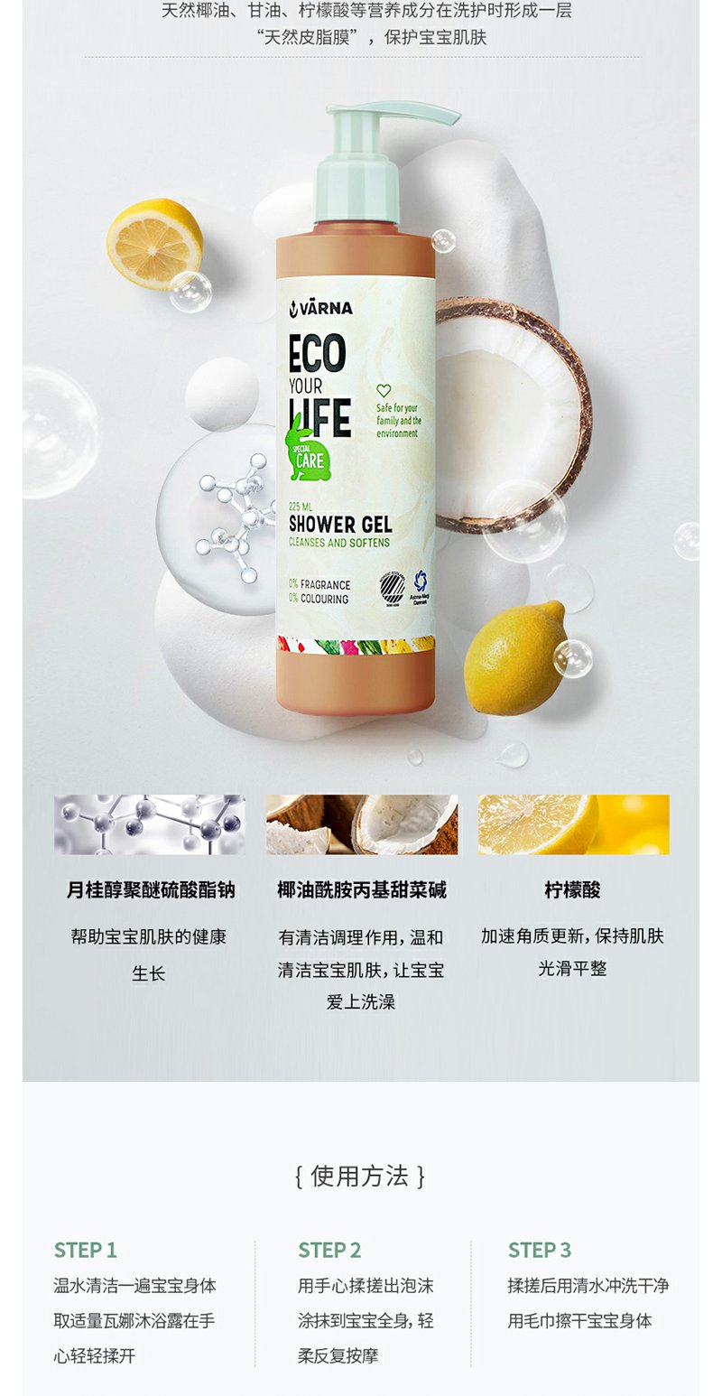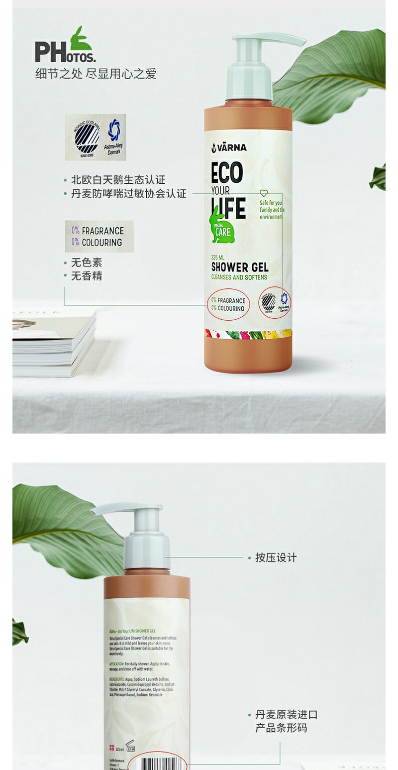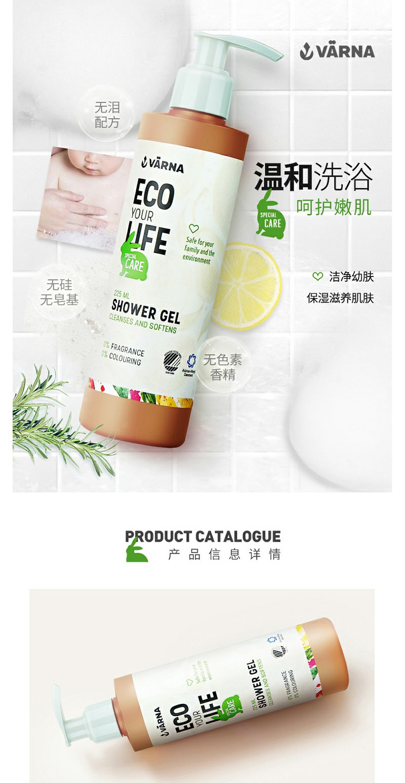 丹麦原装 VARNA/瓦娜 特护系列 沐浴露225ml滋润保湿 孕妇可以用