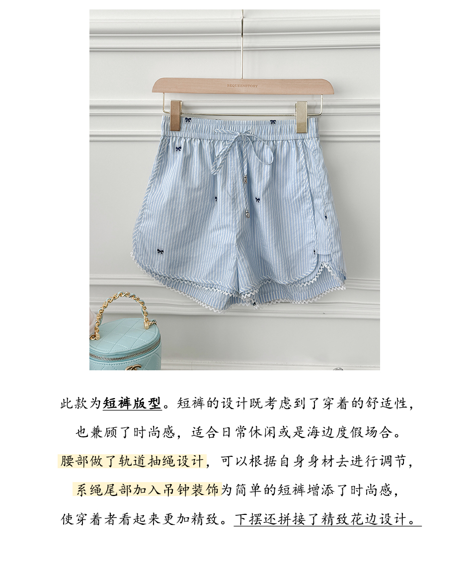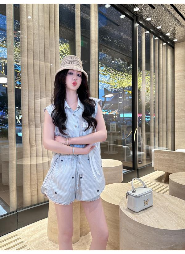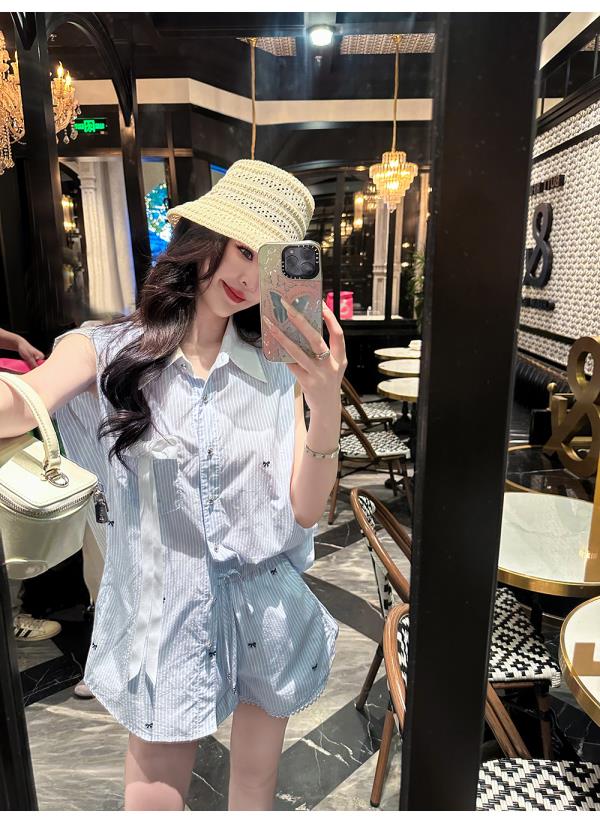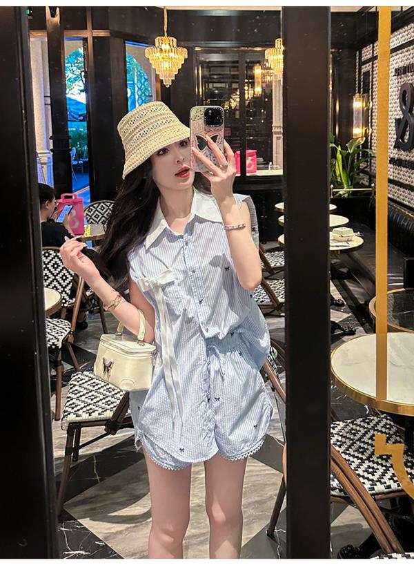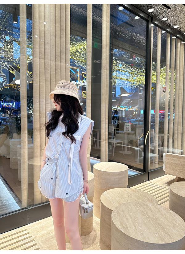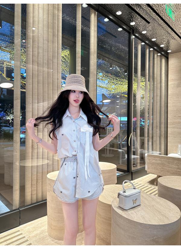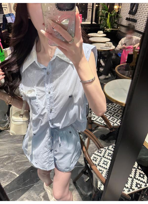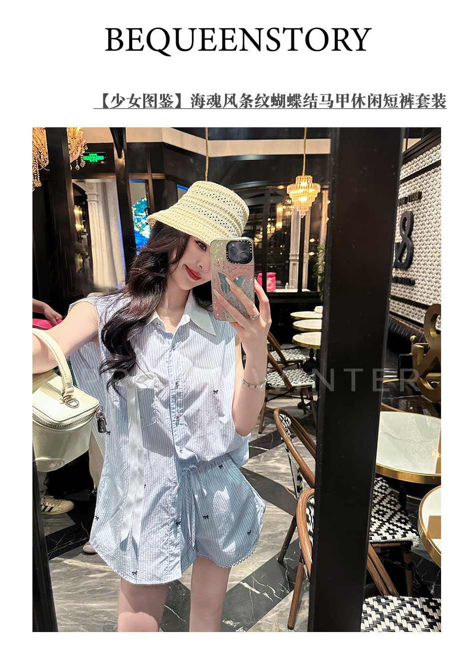 BeQueenStory【少女图鉴】海魂风条纹设计感蝴蝶结马甲休闲短裤套装