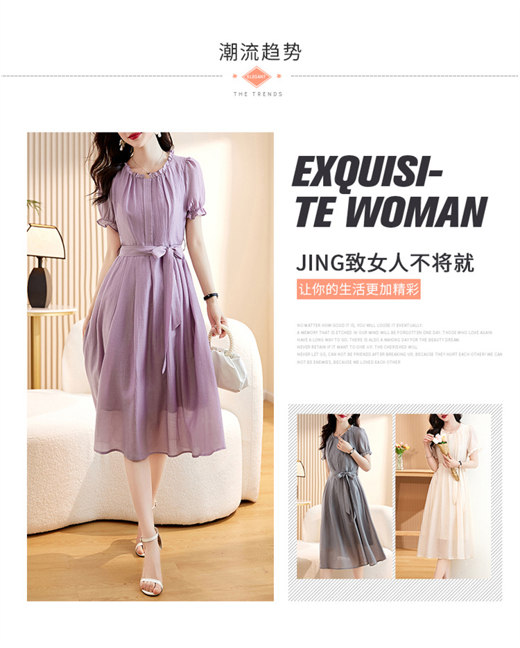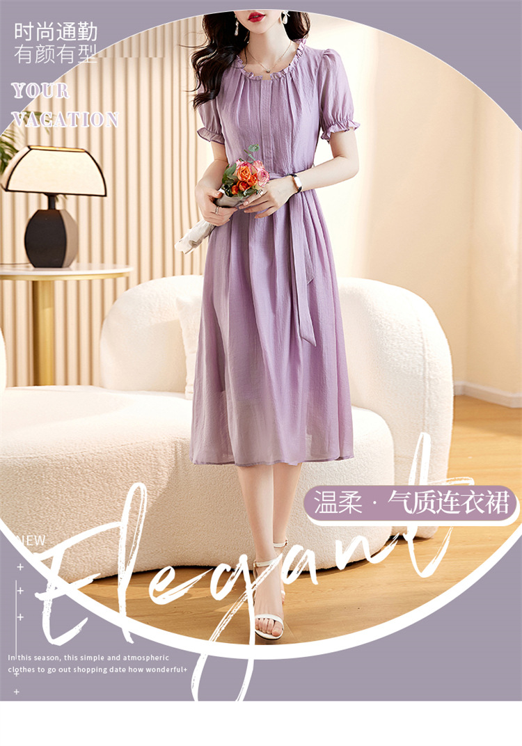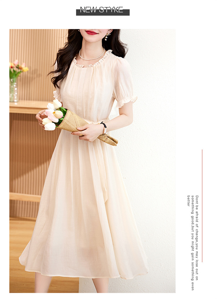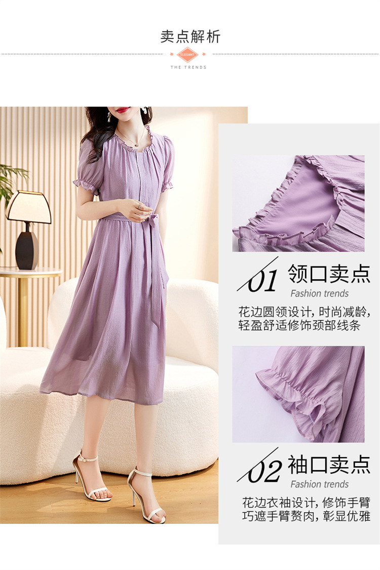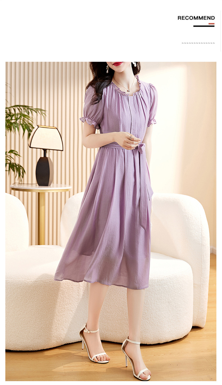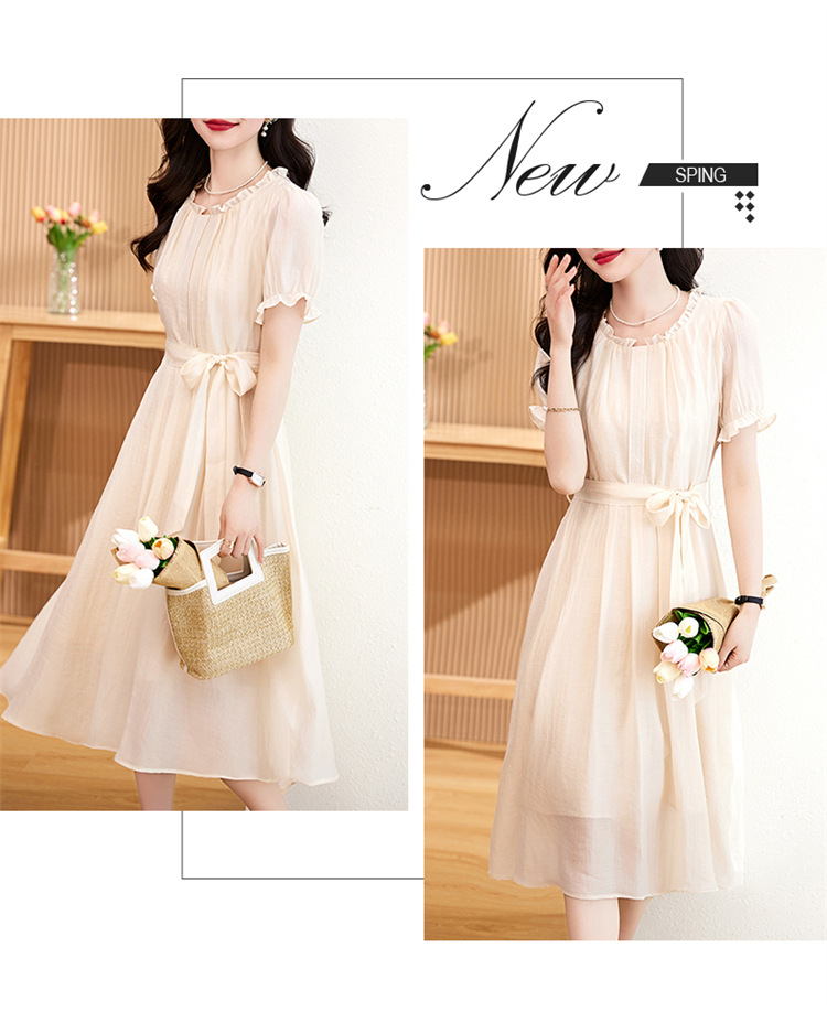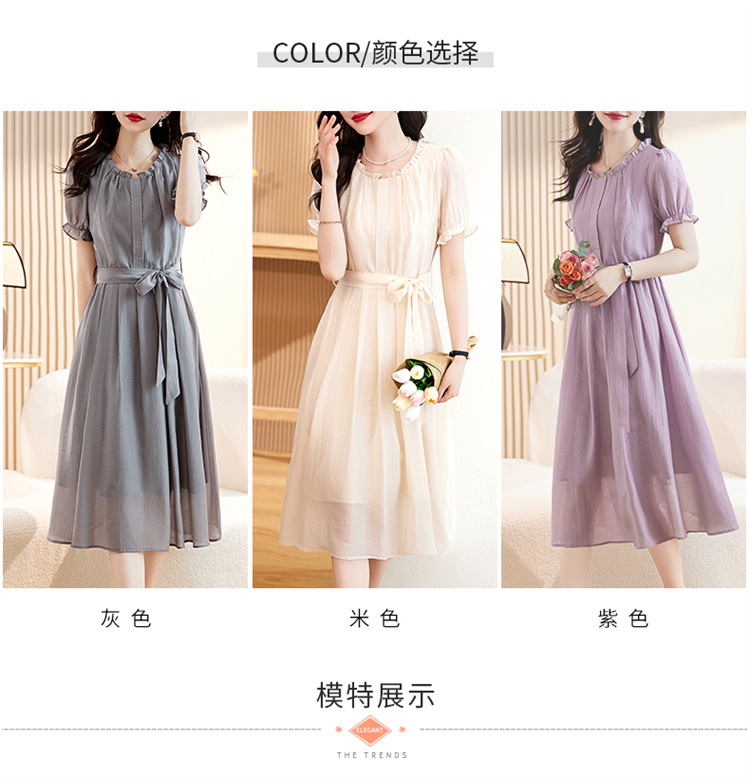 气质花边圆领天丝裙优雅透气纯色中长款裙HR-WW23189