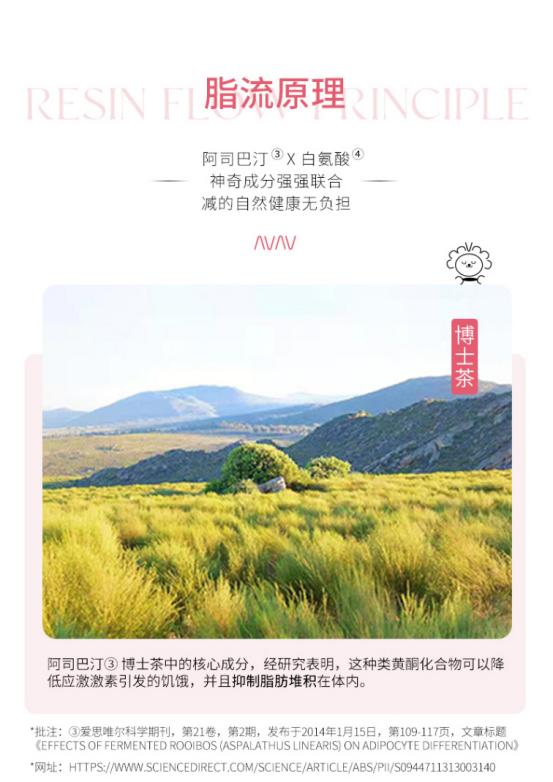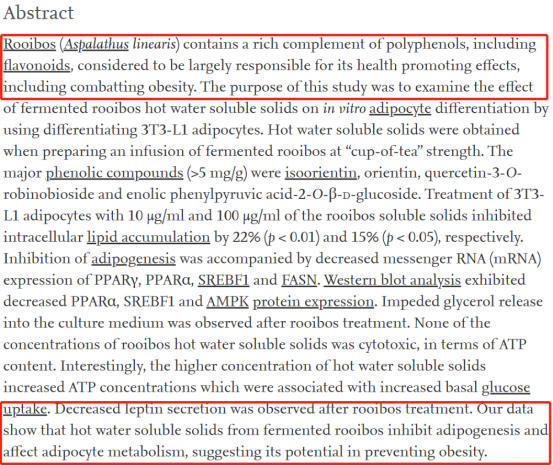 1⃣️线叶金雀花中内含阿斯巴汀类黄酮成分 可以辅助肌肉更快更好地消耗葡萄糖‼️ 减少脂肪的存留,丰富的SOD(抗氧化消除自由基)和类黄酮成分对人体大有裨益 📒📒博士茶含有丰富的多酚类物质,包括黄酮类化合物。其阿司巴汀成分可以降低应激激素引发的饥饿,并且抑制脂肪堆积在体内。 ✅研究结果表明,饮用博士茶后,瘦素分泌能明显的减少,还可以抑制脂肪生成并影响脂肪细胞的新陈代谢,具有抑制肥胖的潜力。 以上在排脂方面的功效已有医学研究结果证实。 以下是来自英国权威科学论坛【爱思唯尔】发布的博士茶减脂方面相关文献期刊: 文章链接:https://www.sciencedirect.com/science/article/abs/pii/S0944711313003140