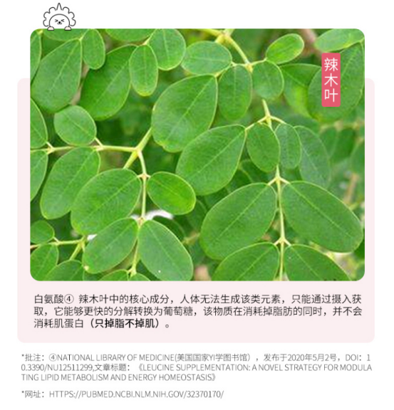 2⃣️辣木叶:取自非洲,被称之为“奇迹之树” 非洲奇迹之树”辣木叶含大量“亮氨酸”‼️ 是唯一可以有效分解脂肪的氨基酸 即使是内脏中的脂肪也能触达 寻常的节食和运动无法做到这一点 亮氨酸专注溶解其他脂肪 不消解真肌中脂肪的神奇功效 完全不会影响到辛苦健身保留的肌肉💪