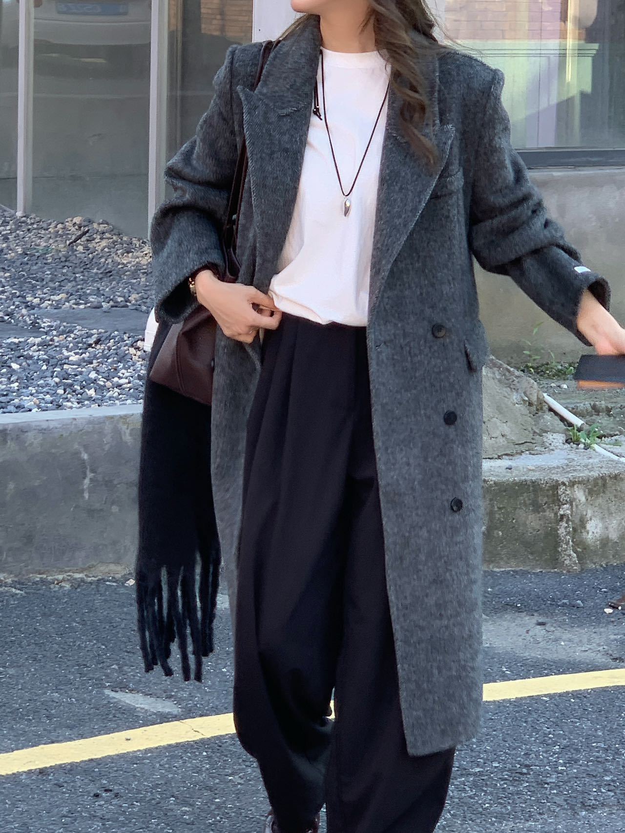【YW】无忧购韩版人字纹西装领双排扣过膝长款正肩双面羊毛大衣外套9818(截单后7天发货)25年清仓捡漏