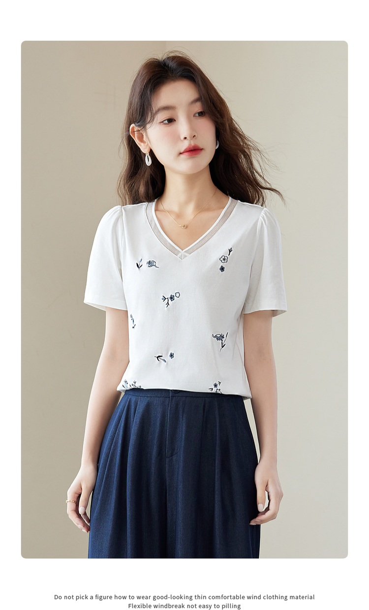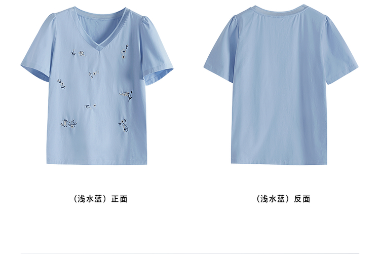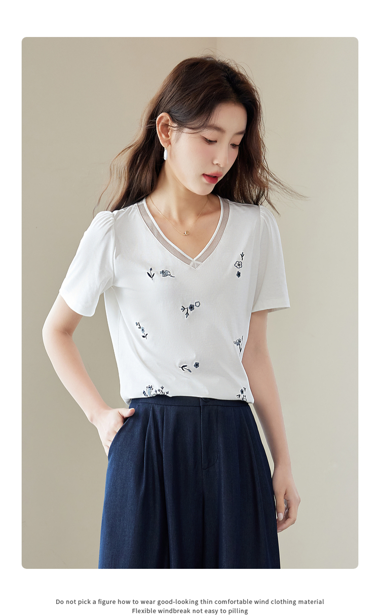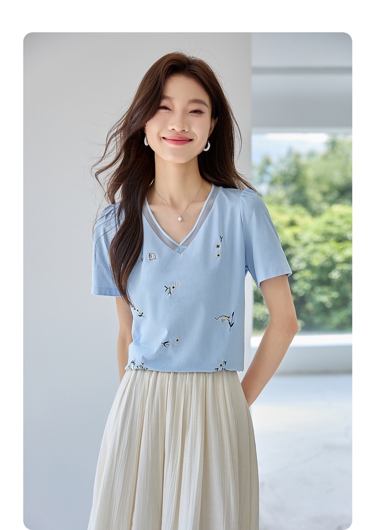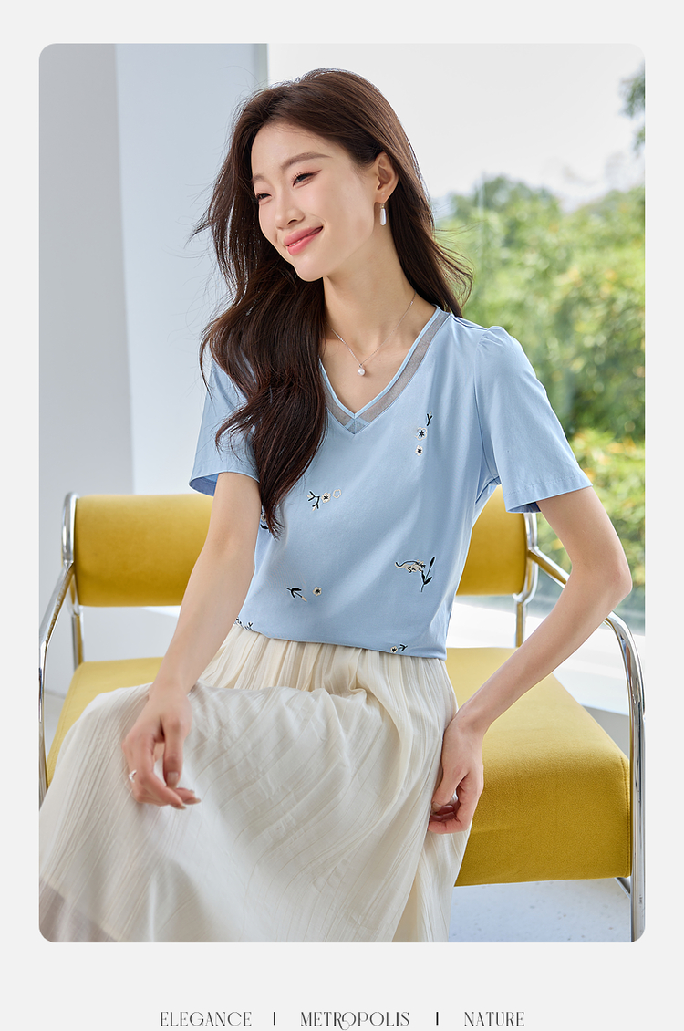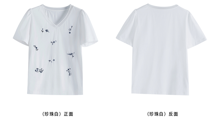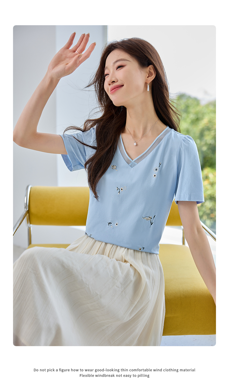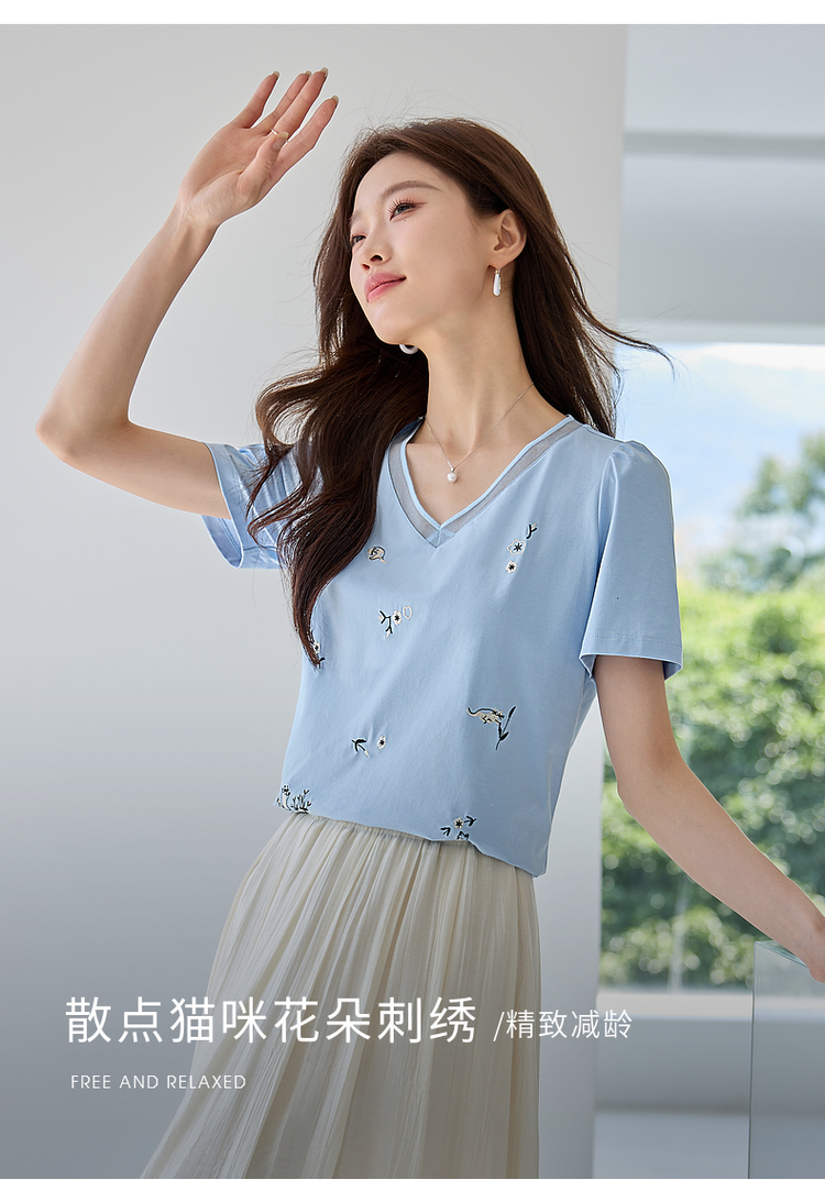 【专属特价】熙世界欧根纱V领短袖T恤2025夏季新款宽松休闲减龄刺绣凉感上衣