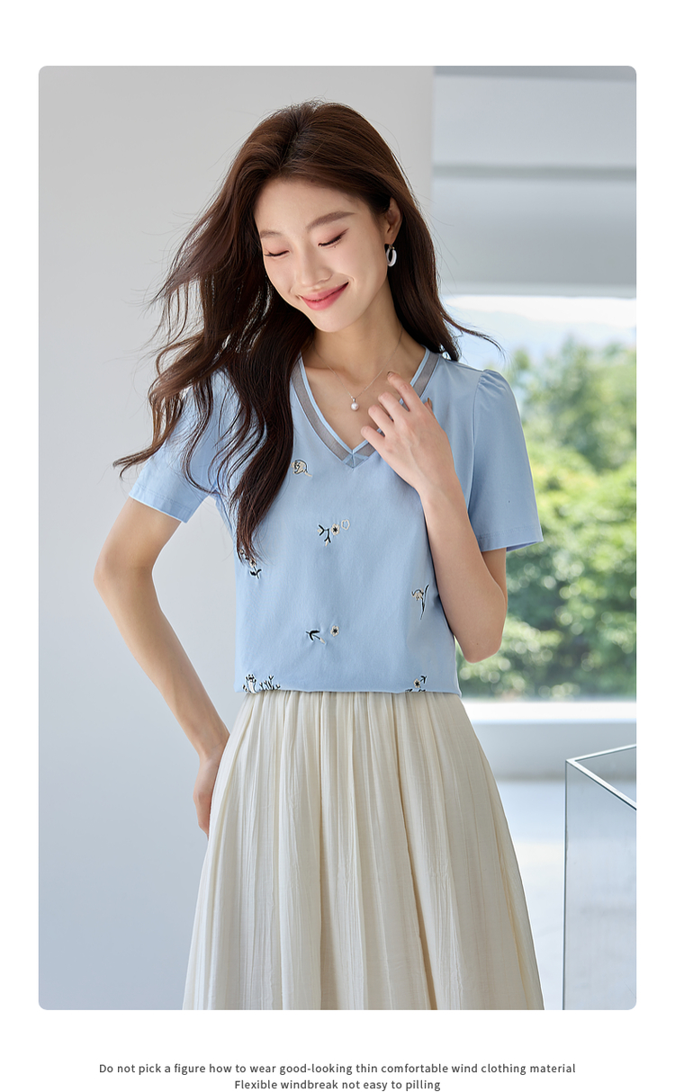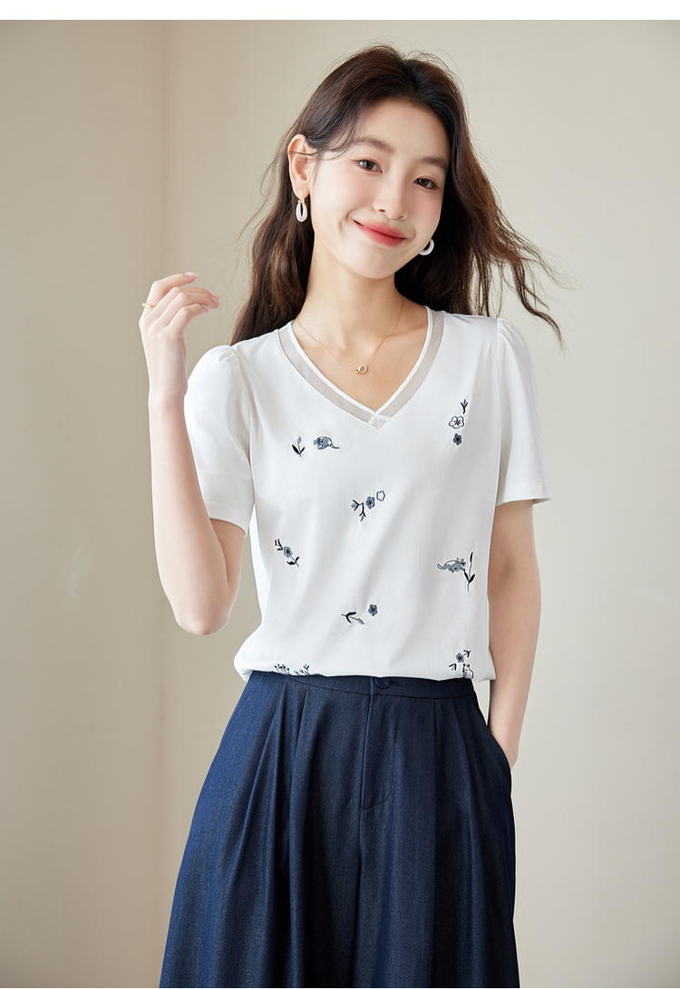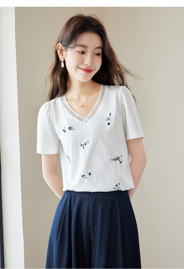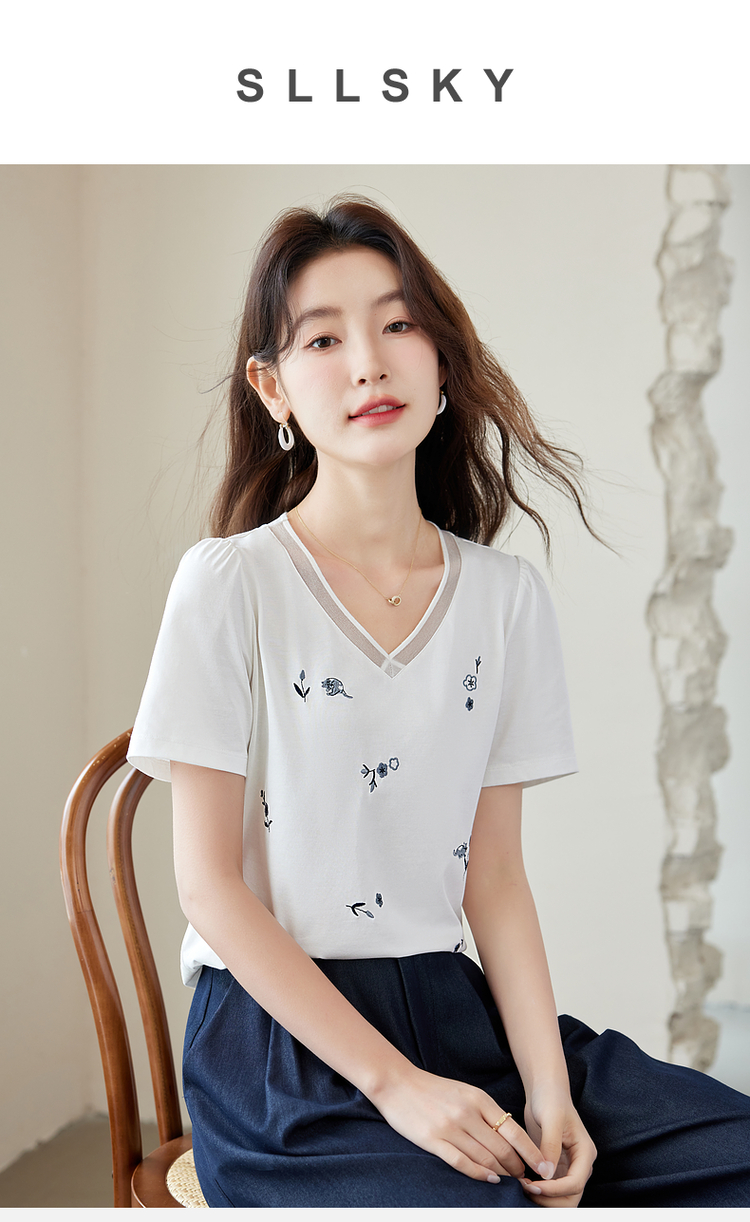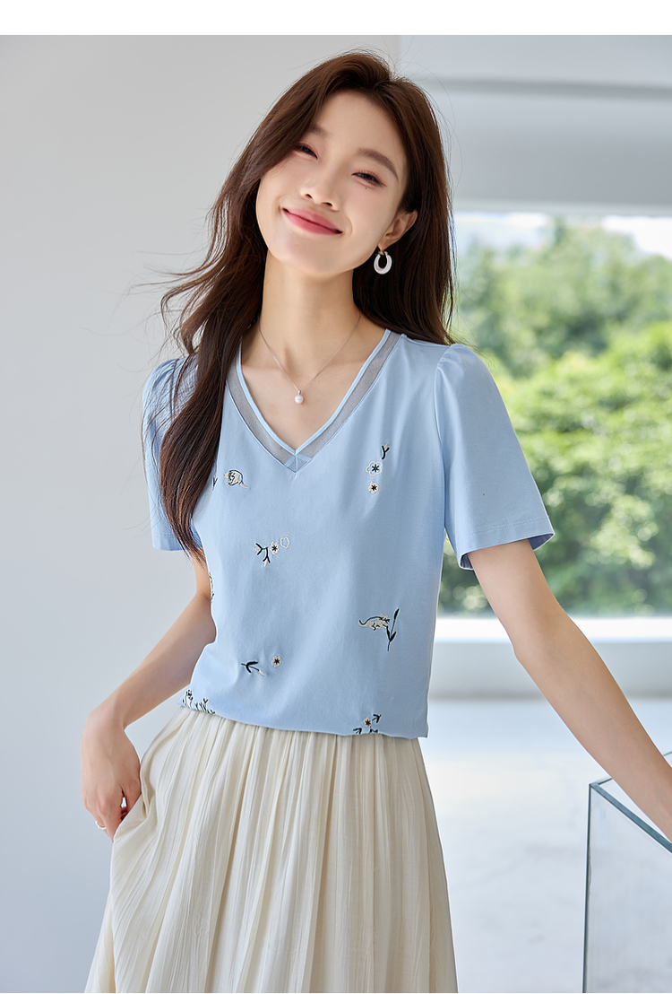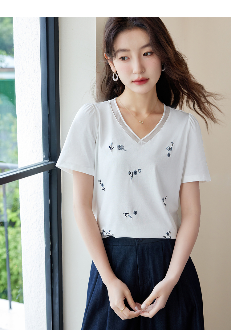【专属特价】熙世界欧根纱V领短袖T恤2025夏季新款宽松休闲减龄刺绣凉感上衣