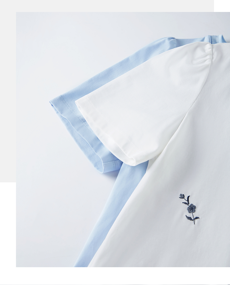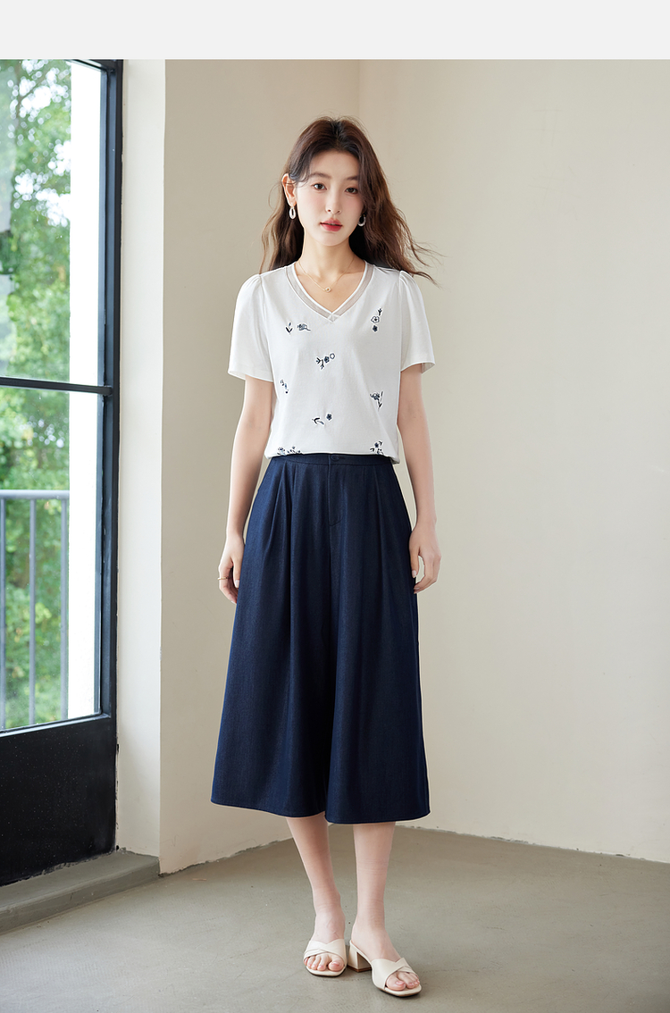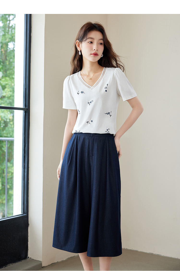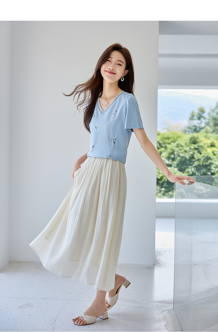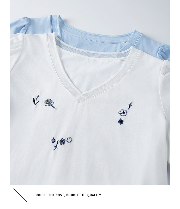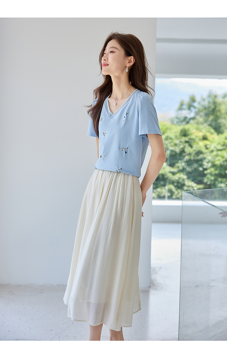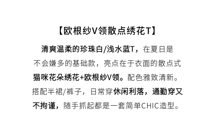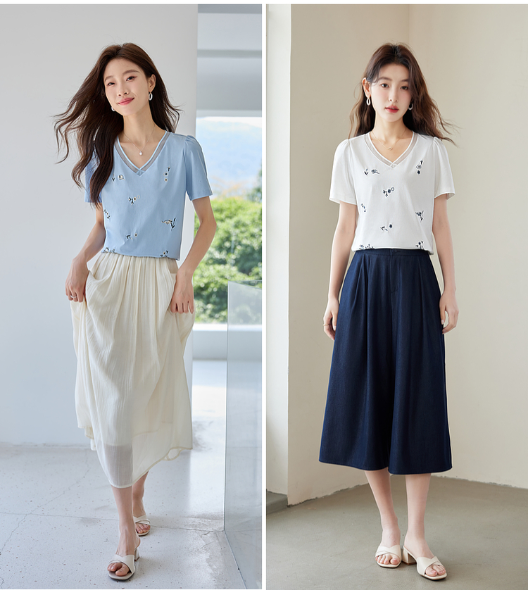 【专属特价】熙世界欧根纱V领短袖T恤2025夏季新款宽松休闲减龄刺绣凉感上衣