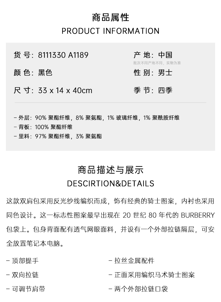 BURBERRY 巴宝莉 男士马术骑士印章刺绣奥克尼双肩背包 黑色 8111330 A1189