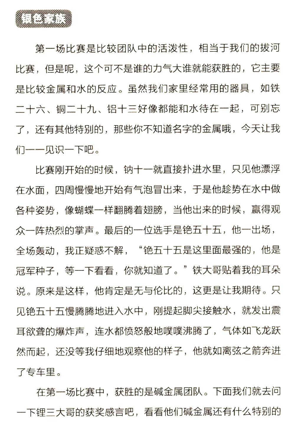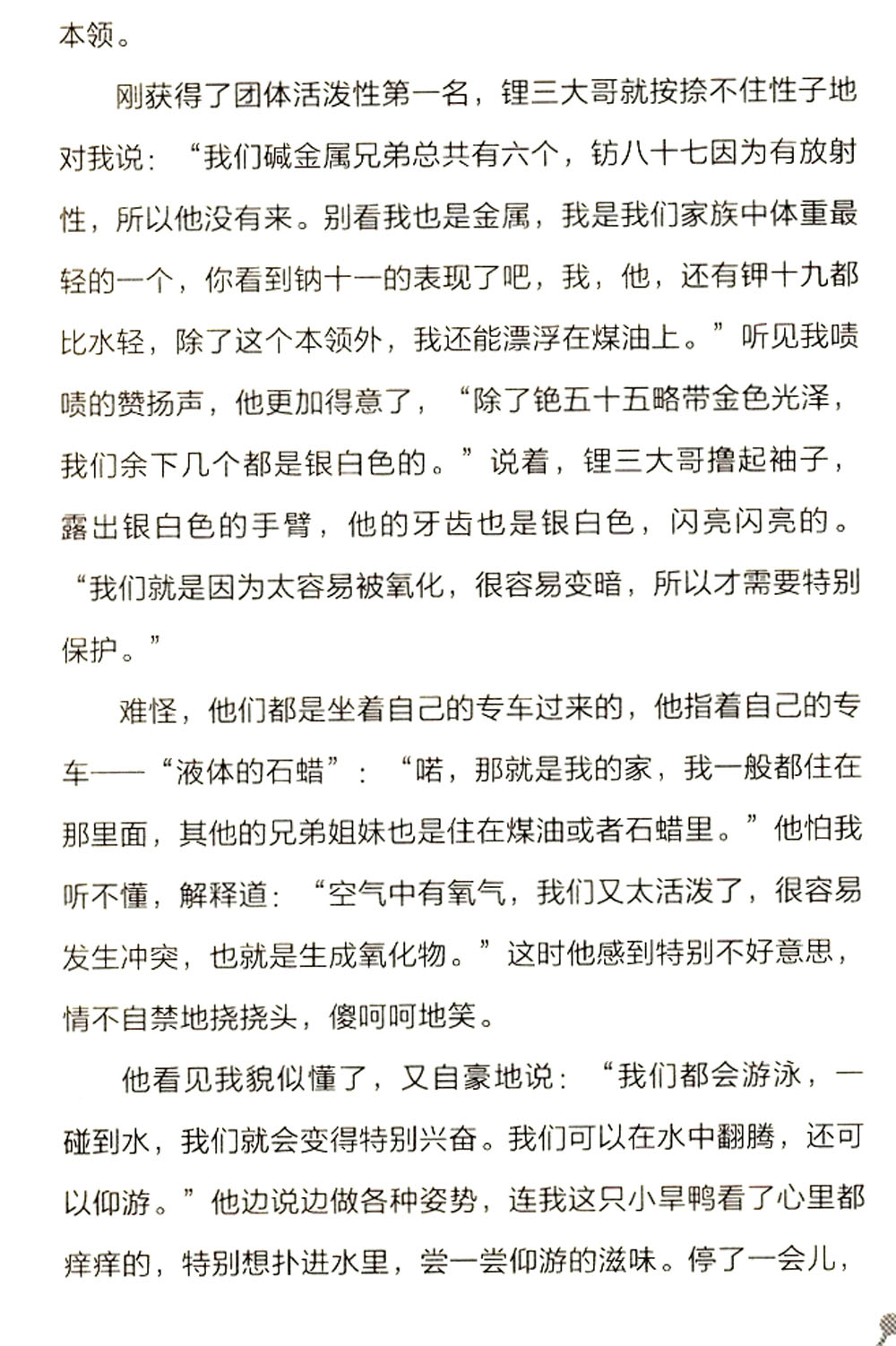 这次,轮到铂七十八小姐展示了。只见她优雅从容地上场,台下立刻一片惊叹声,混合着鼓掌声。一看她就是姿色非凡,容颜焕发,名副其实的高贵优雅的代名词。“铂族金属色泽向来都是非常美丽的,纯净的铂呈银白色,具有金属光泽,那种光泽是自然天成的,历久不衰的。”铁大哥在旁边解释道。紧接着又有很多金属小姐上场:穿着紫色丝绸的铜二十九小姐、蓝灰色的铅八十二、“粉红女郎”铋八十三,还有穿着深灰大衣的钴二十七、灰色的镉四十八,余下的几乎都是穿着银白色的金属小姐,比如铝十三、镁十二……