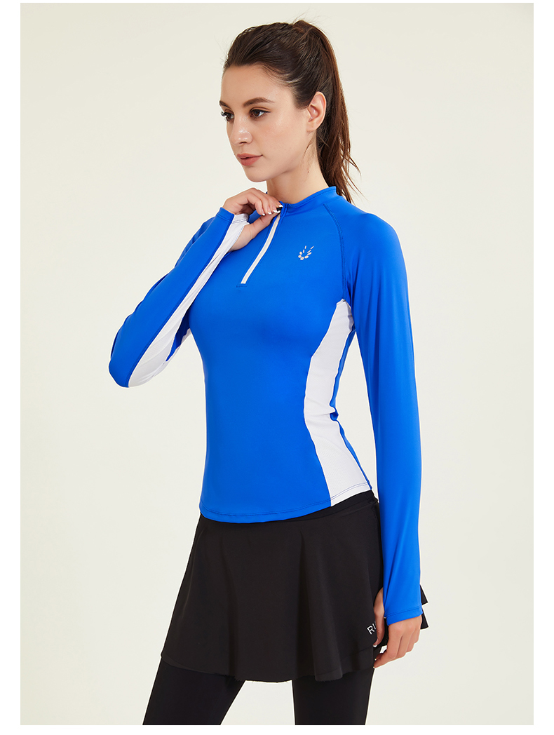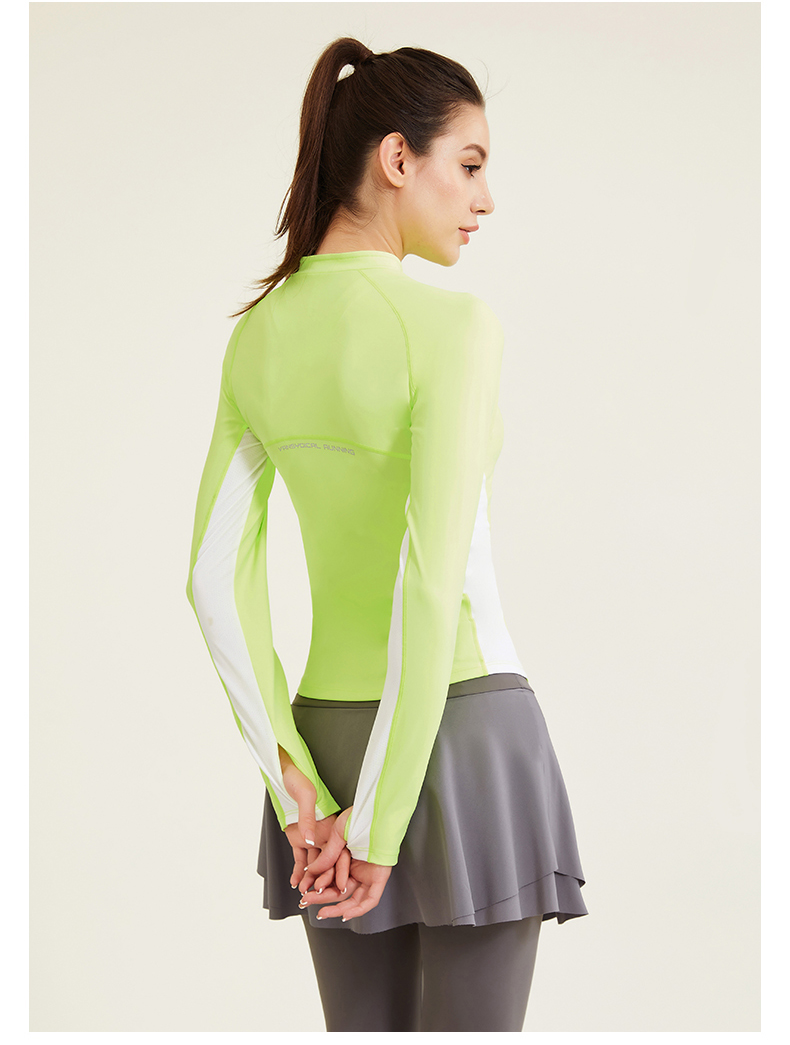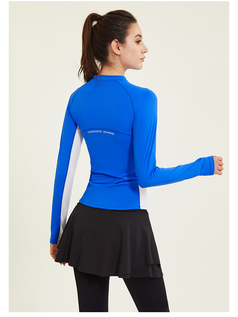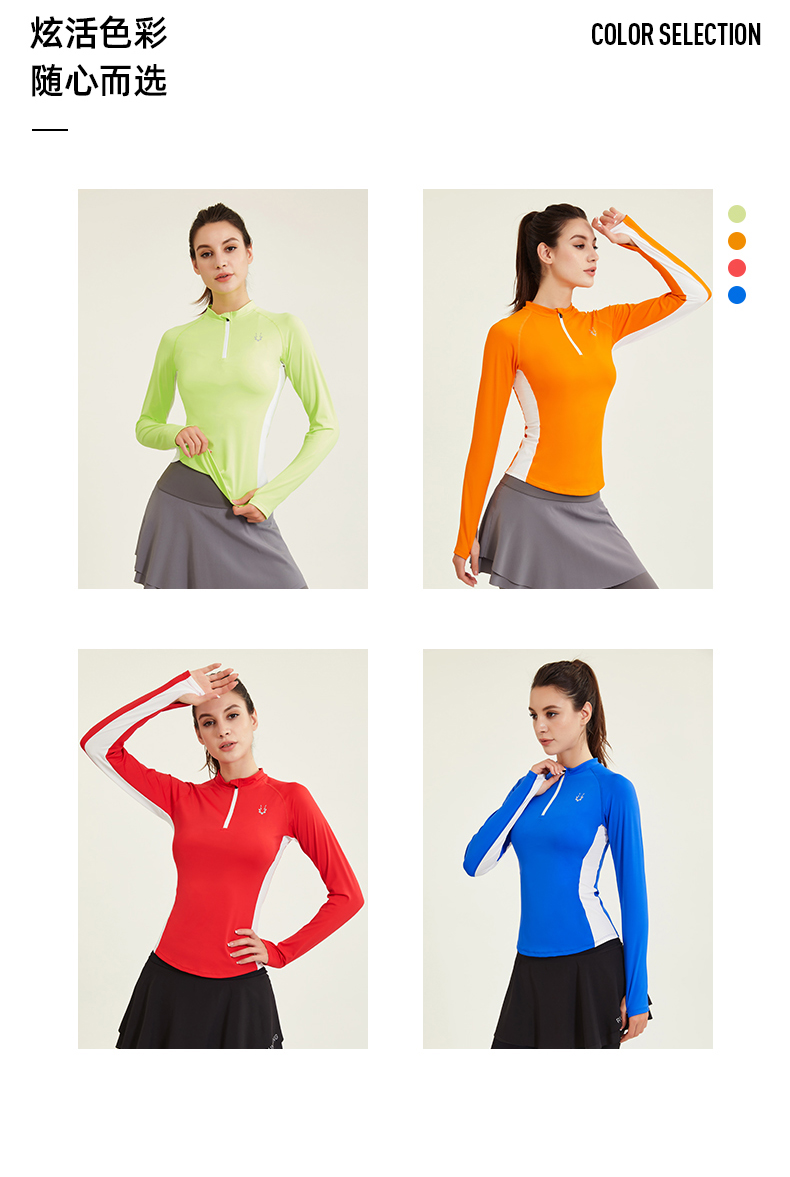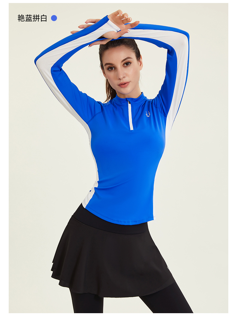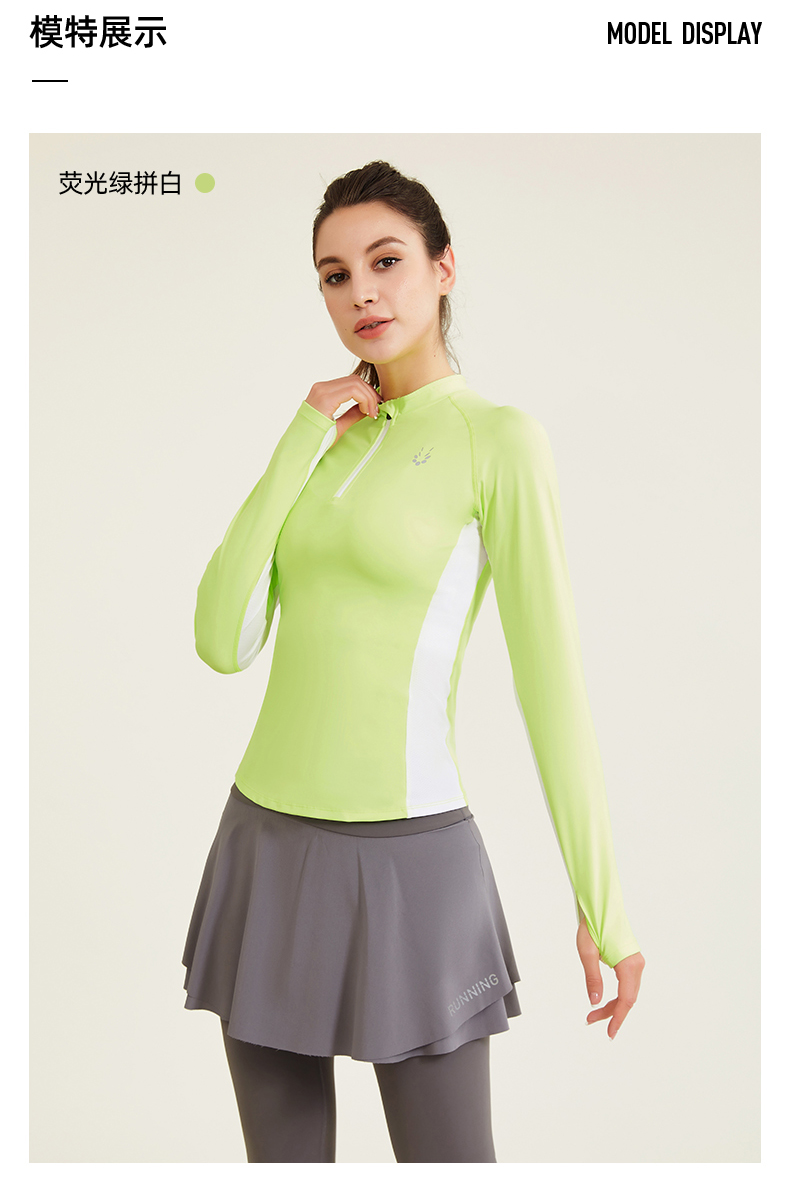 立领拼色抓绒T恤女长袖健身衣运动速干跑步长袖