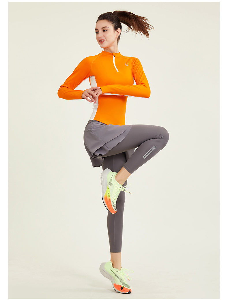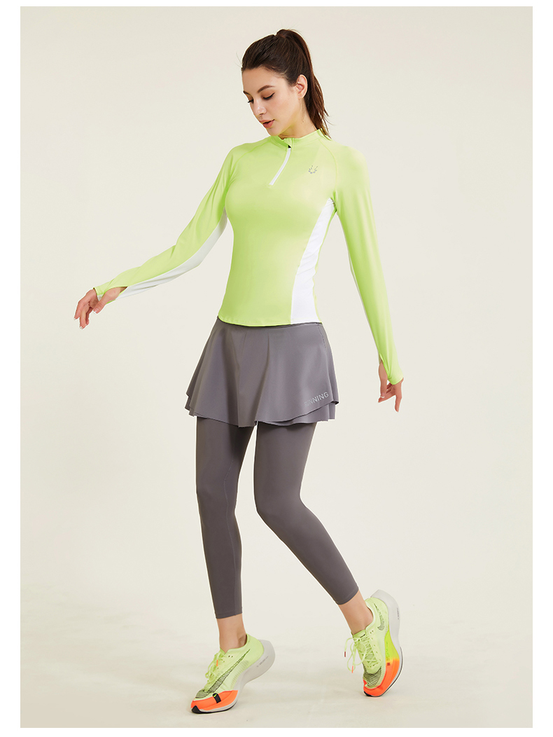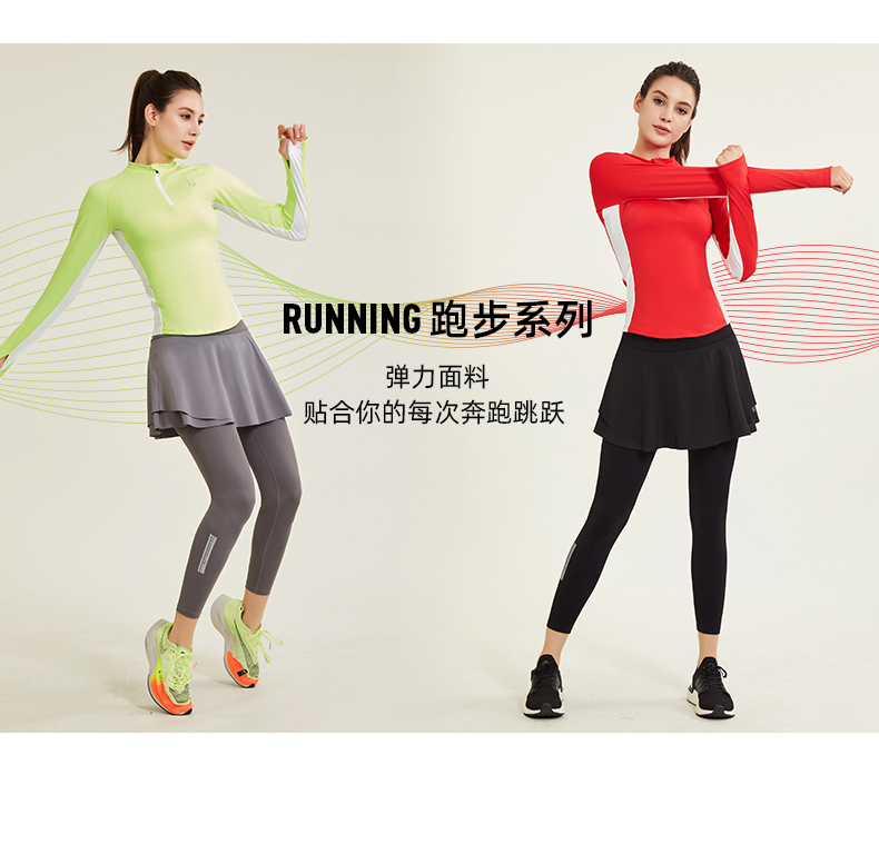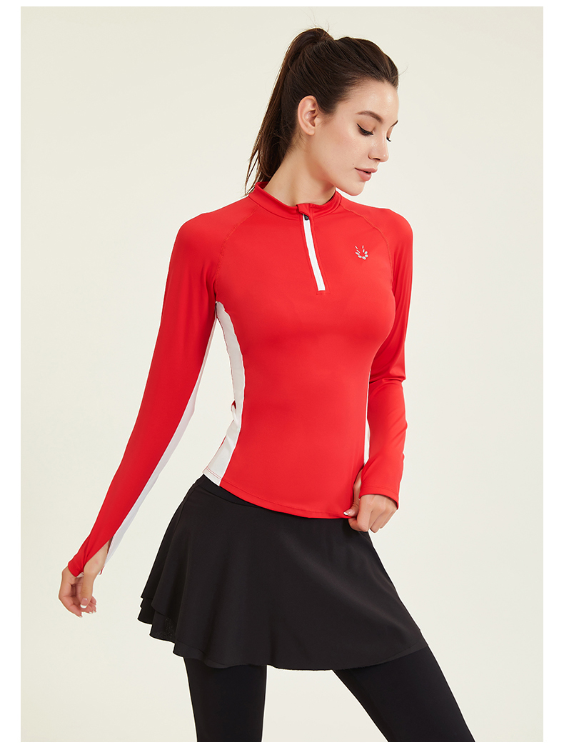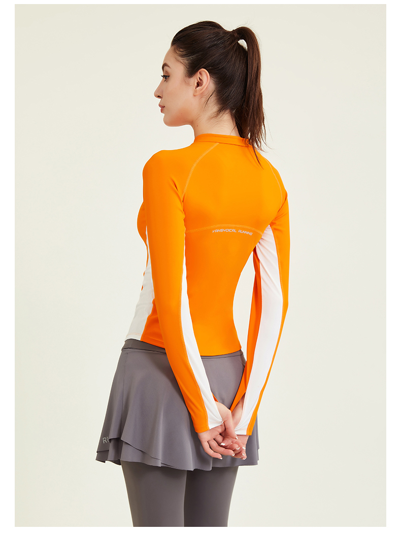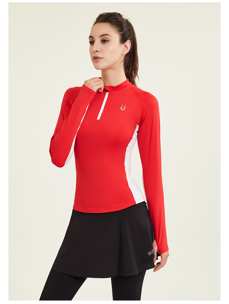 立领拼色抓绒T恤女长袖健身衣运动速干跑步长袖