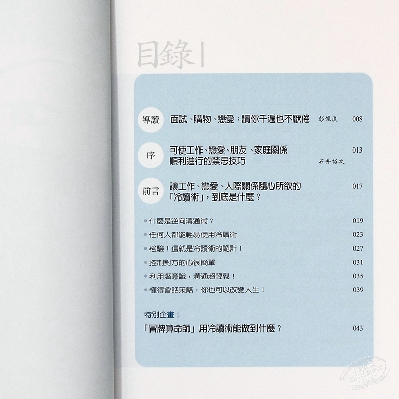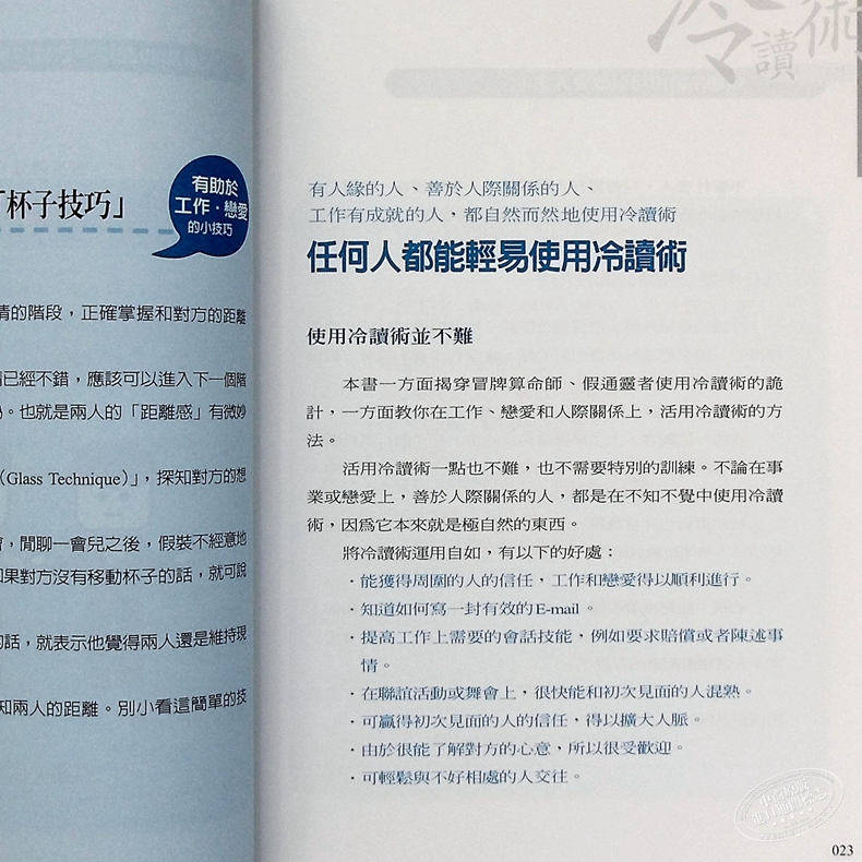 本書介紹的冷讀術,是一種「了解對方心意」與「建立信任關係」的技巧,使用得當,能在瞬間就贏得陌生者信任。