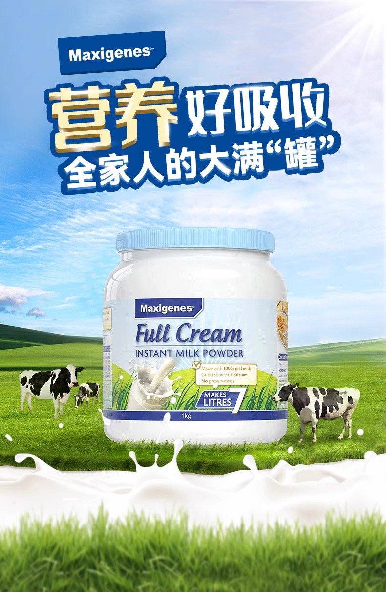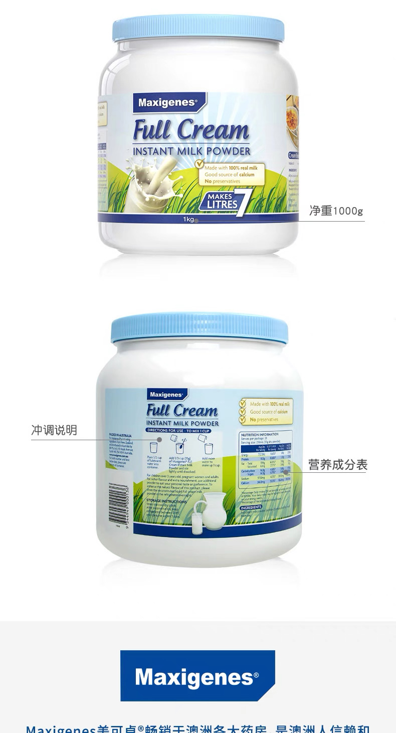 美可卓Maxigenes蓝胖子全脂高钙奶粉1kg