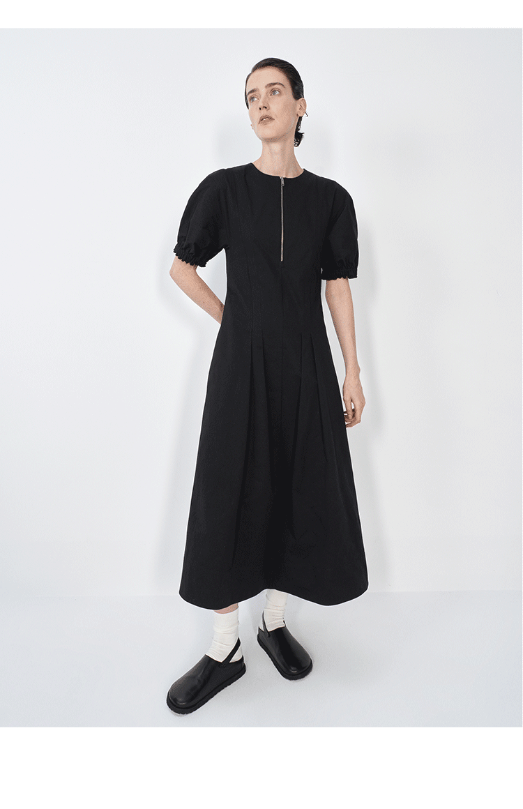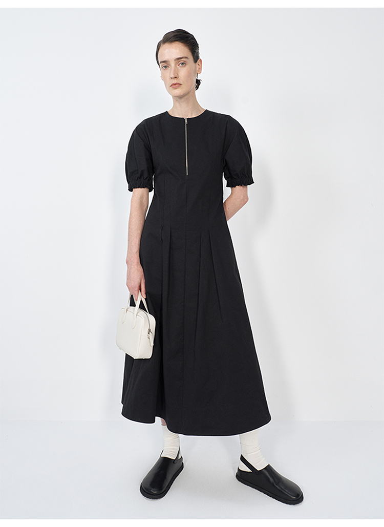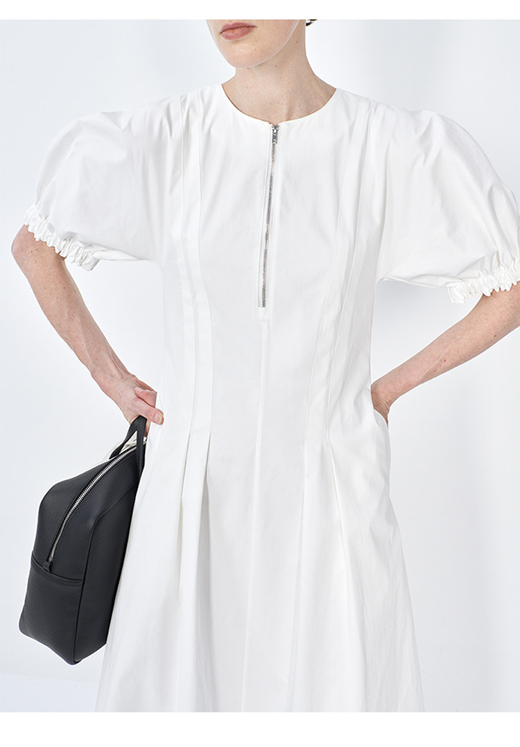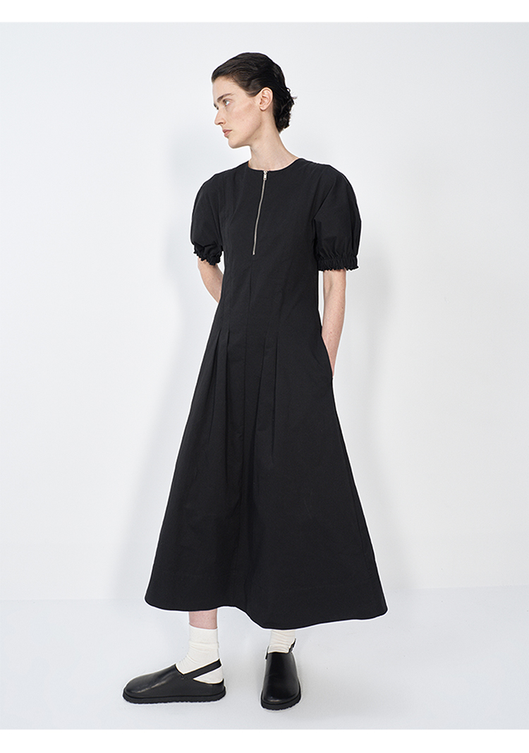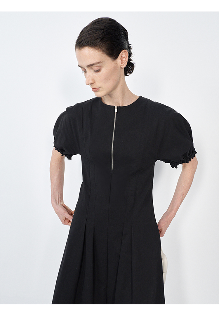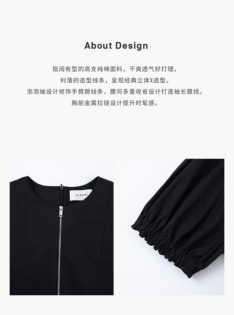 HIDEMI 极简显瘦小圆领立体收腰拉链泡泡袖连衣裙