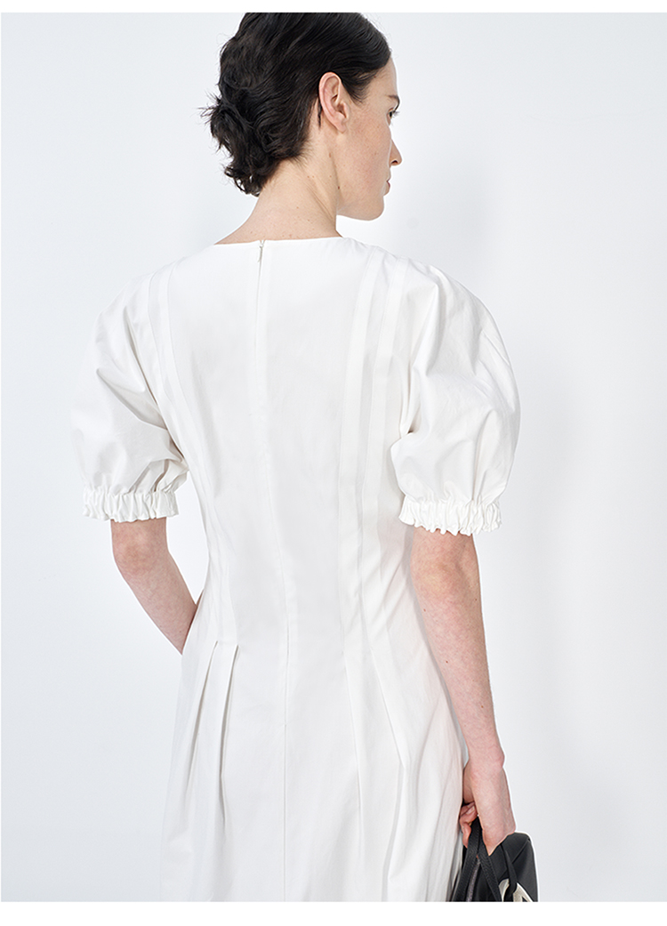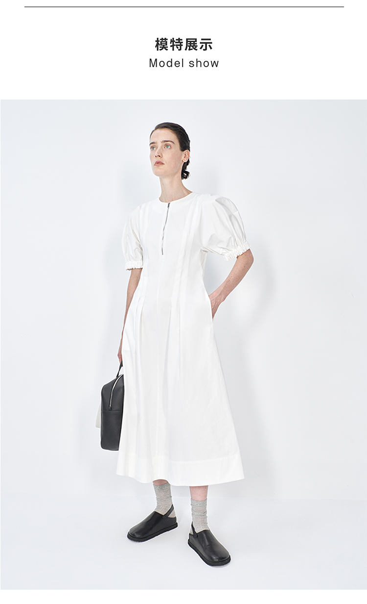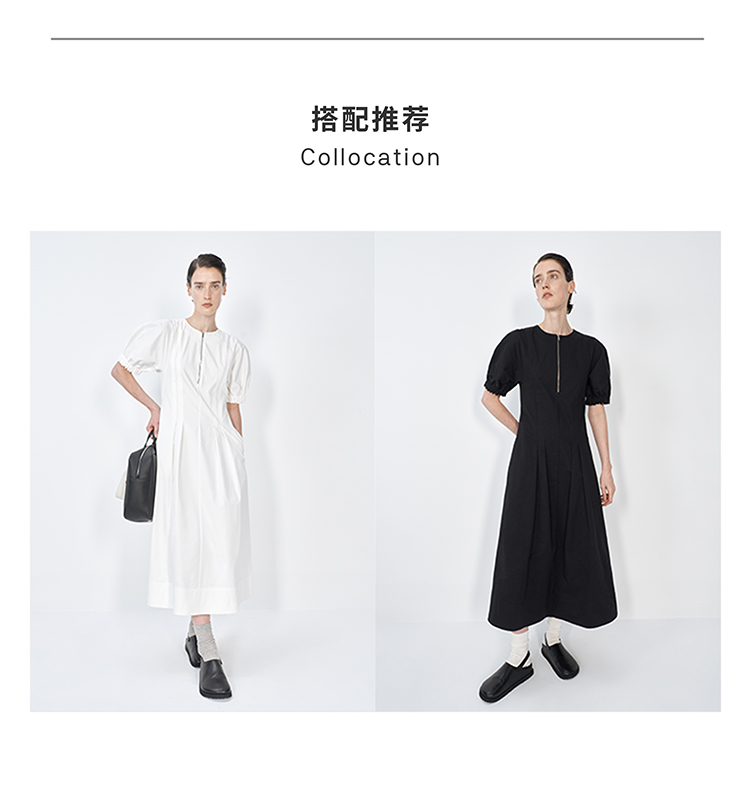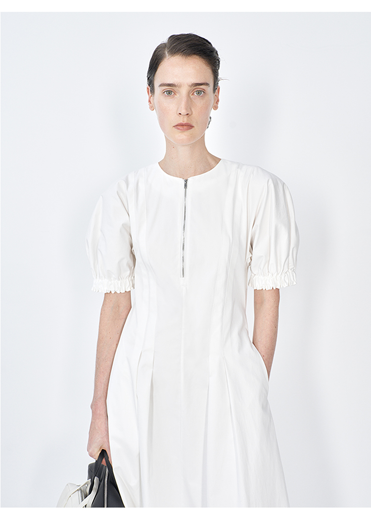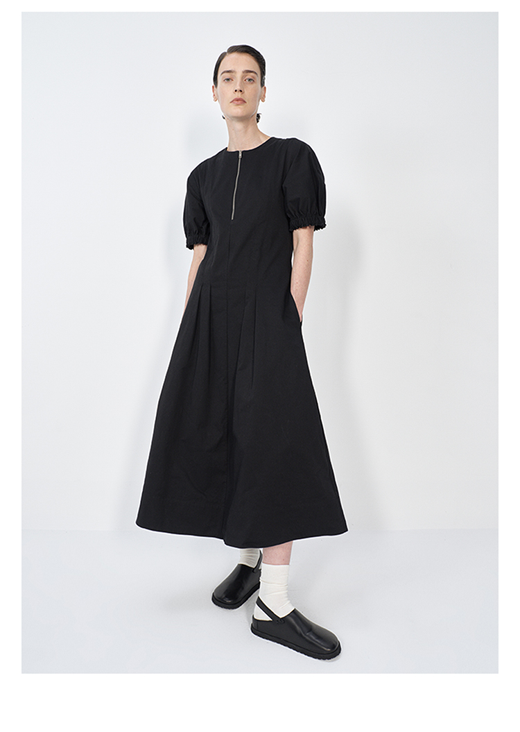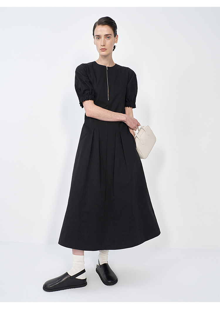 HIDEMI 极简显瘦小圆领立体收腰拉链泡泡袖连衣裙