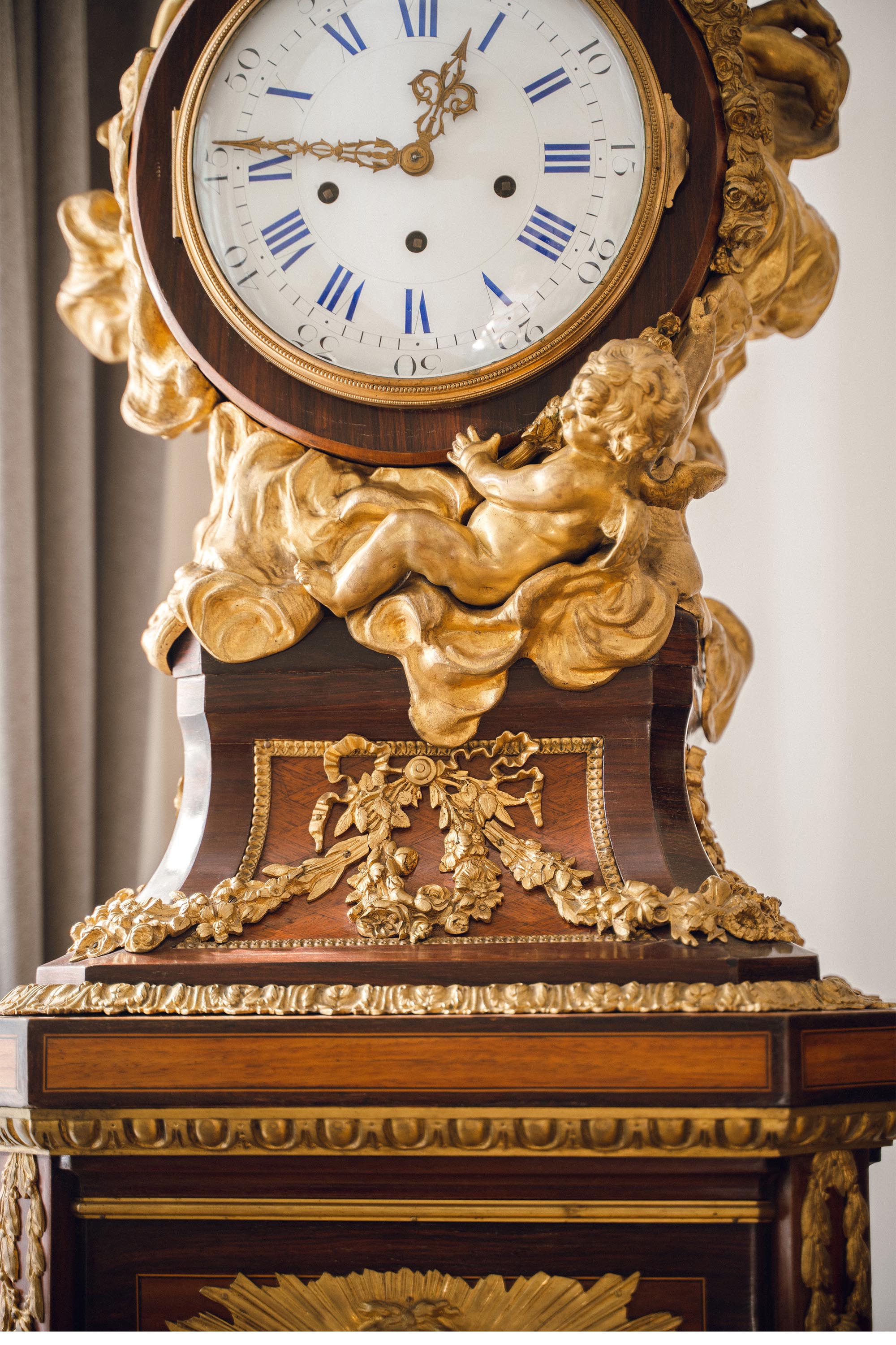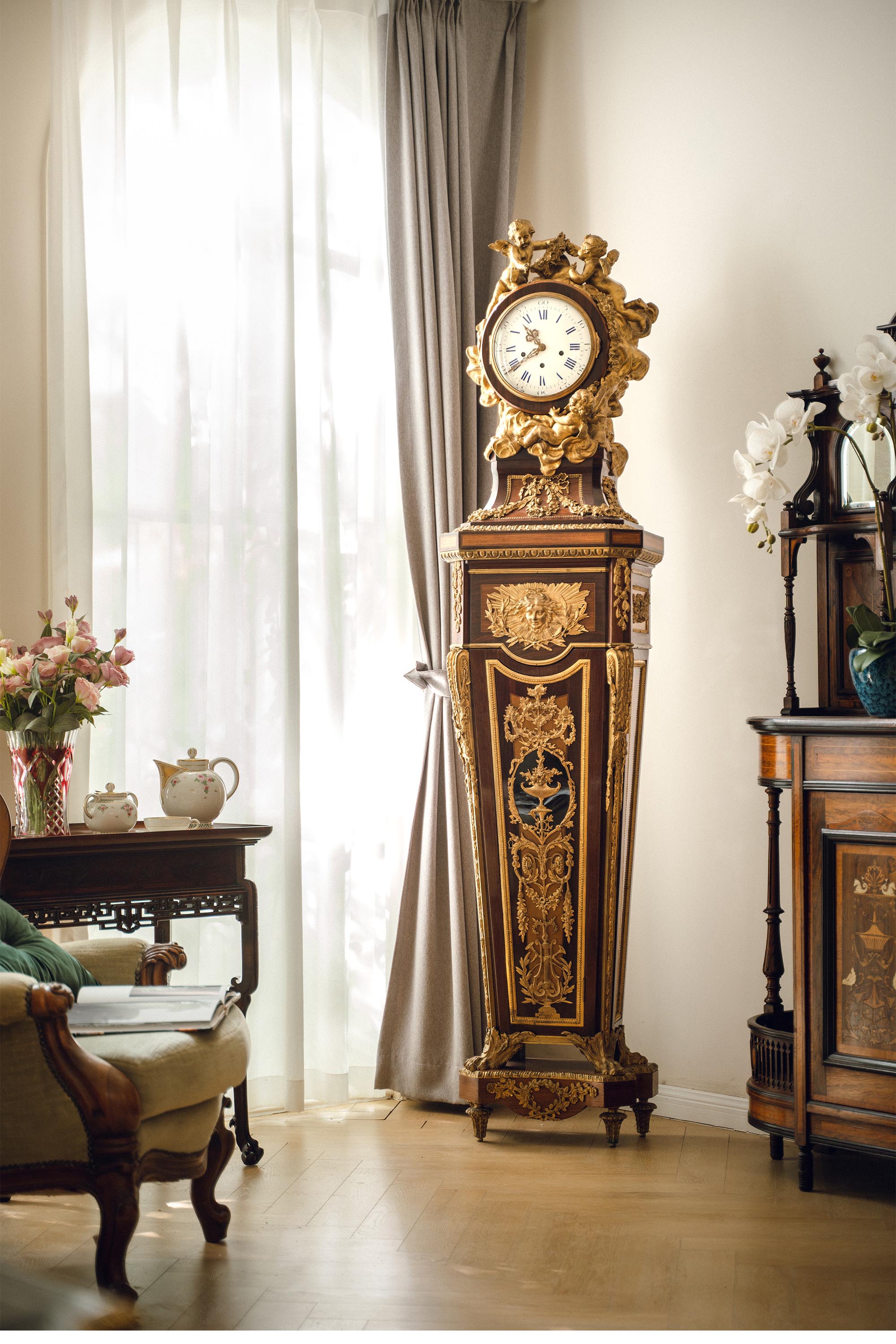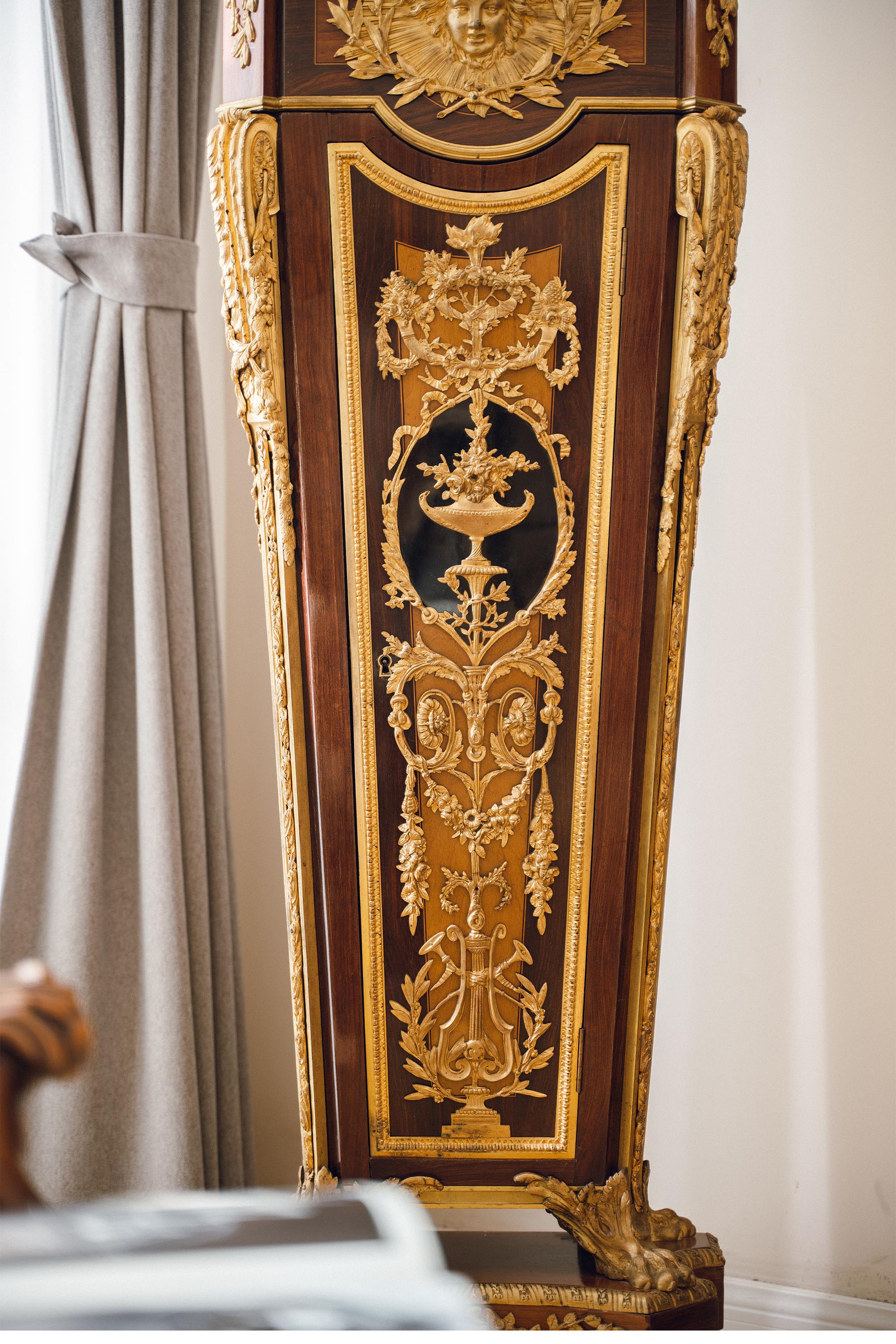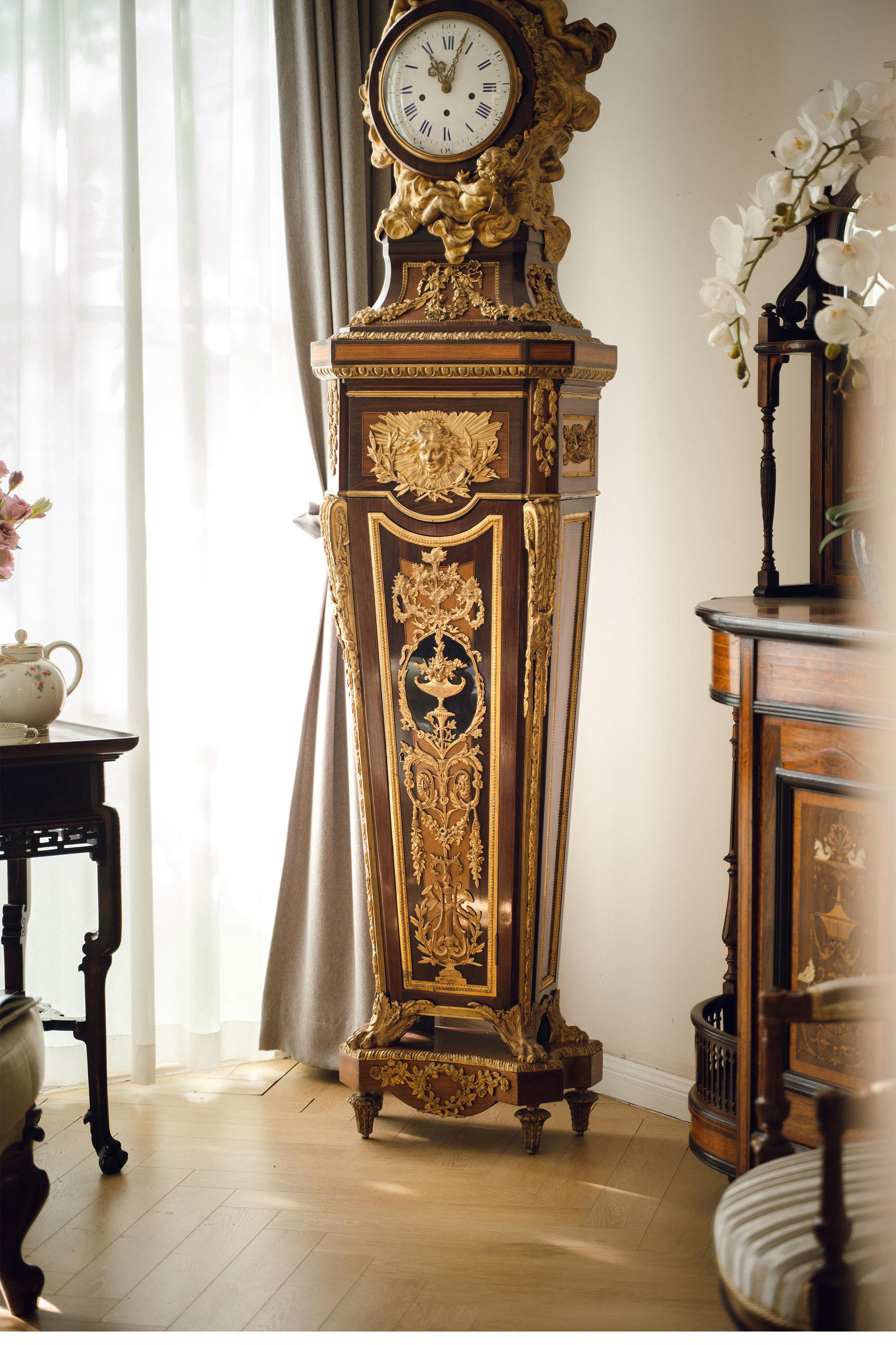 19世纪法国出品路易十五风格铜鎏金精雕装饰硬木镶嵌大型落地钟
