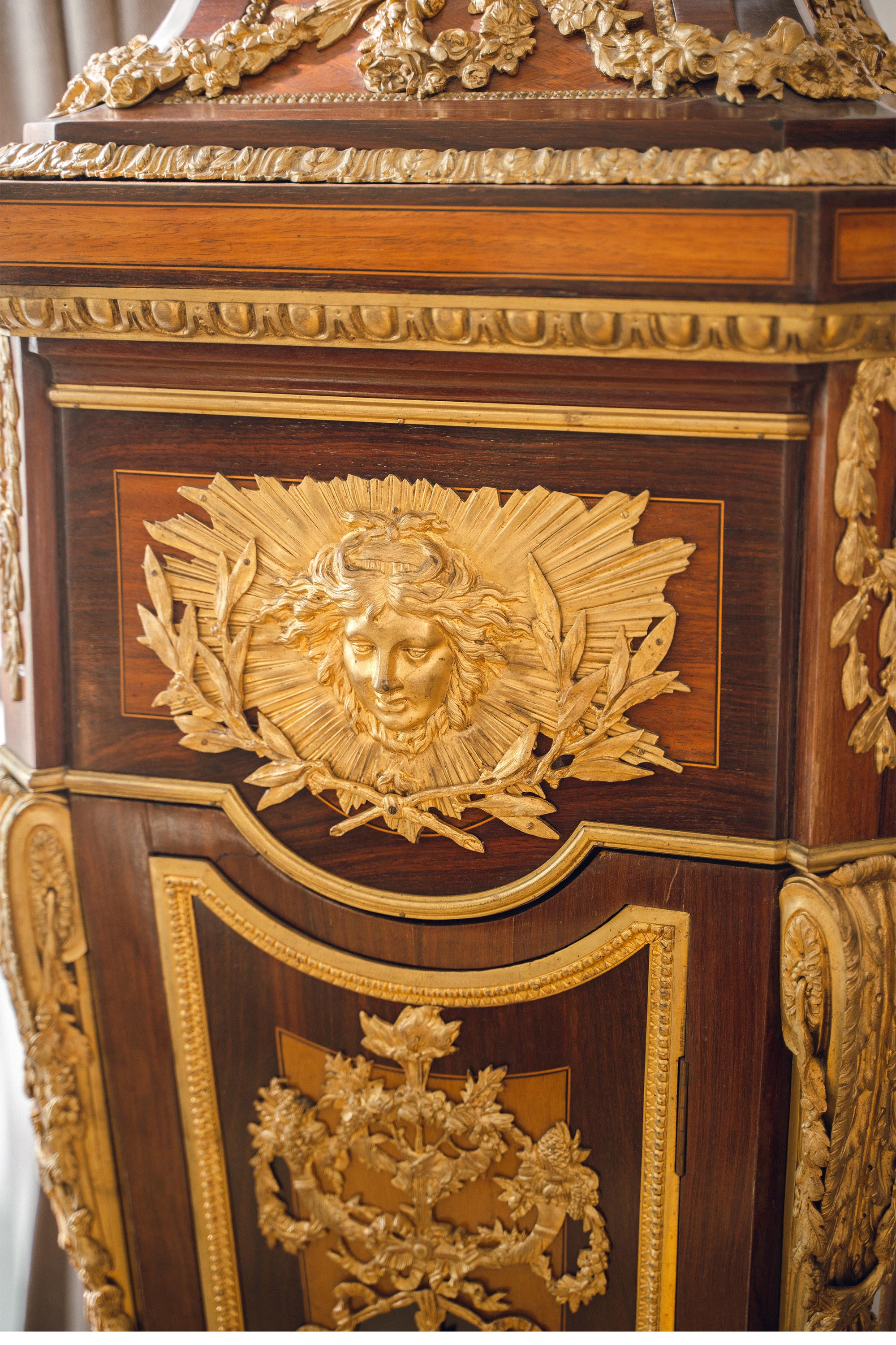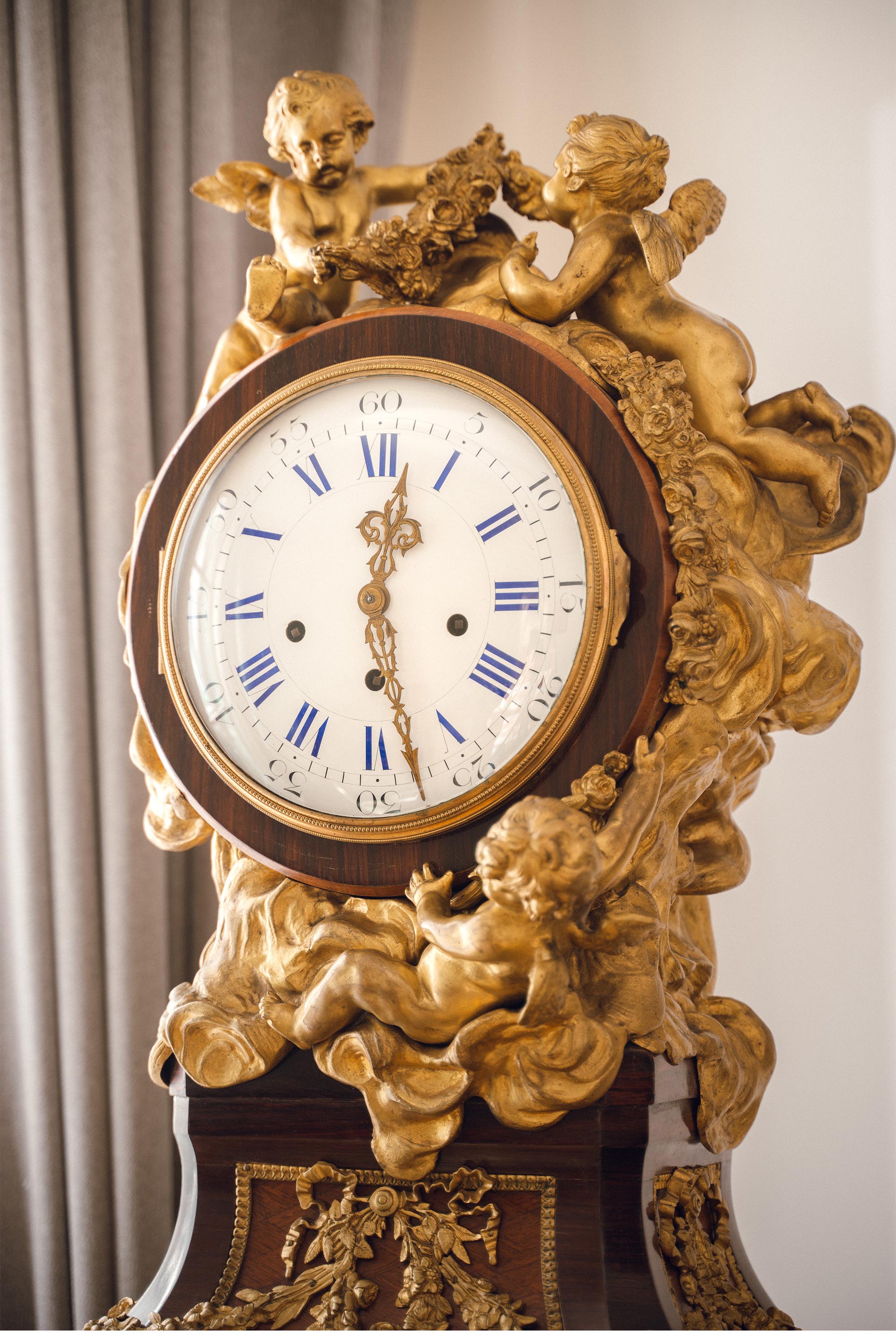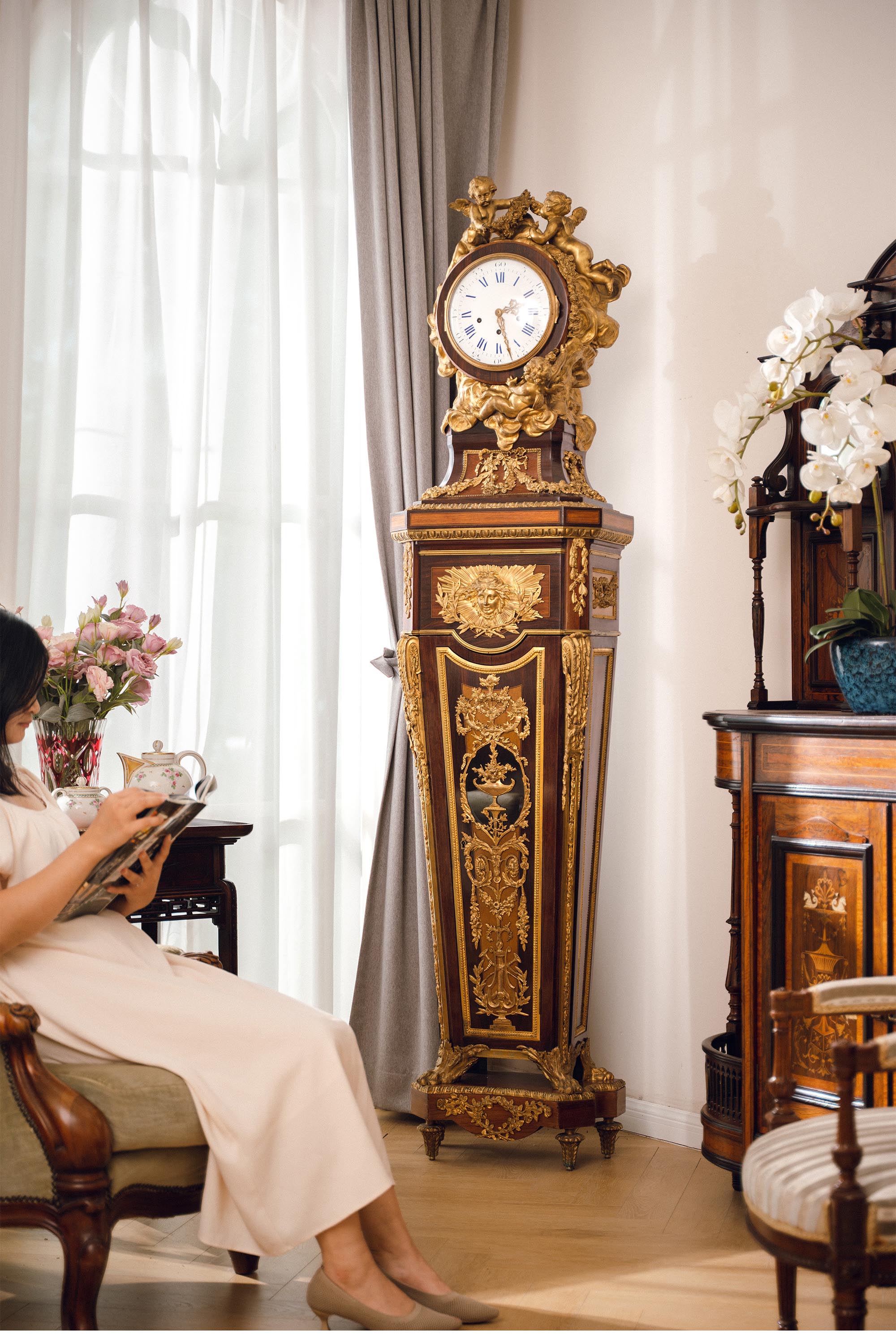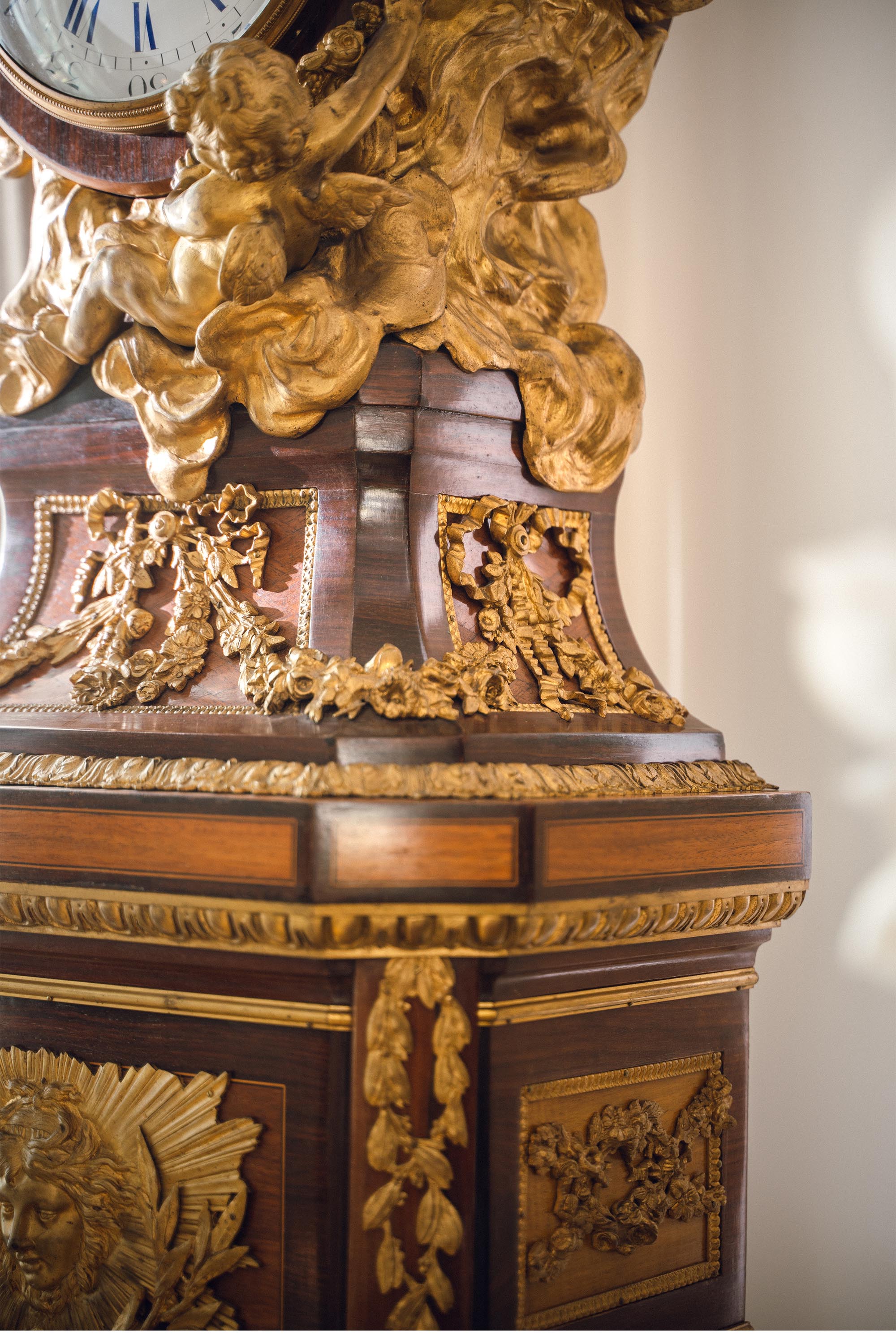 19世纪法国出品路易十五风格铜鎏金精雕装饰硬木镶嵌大型落地钟