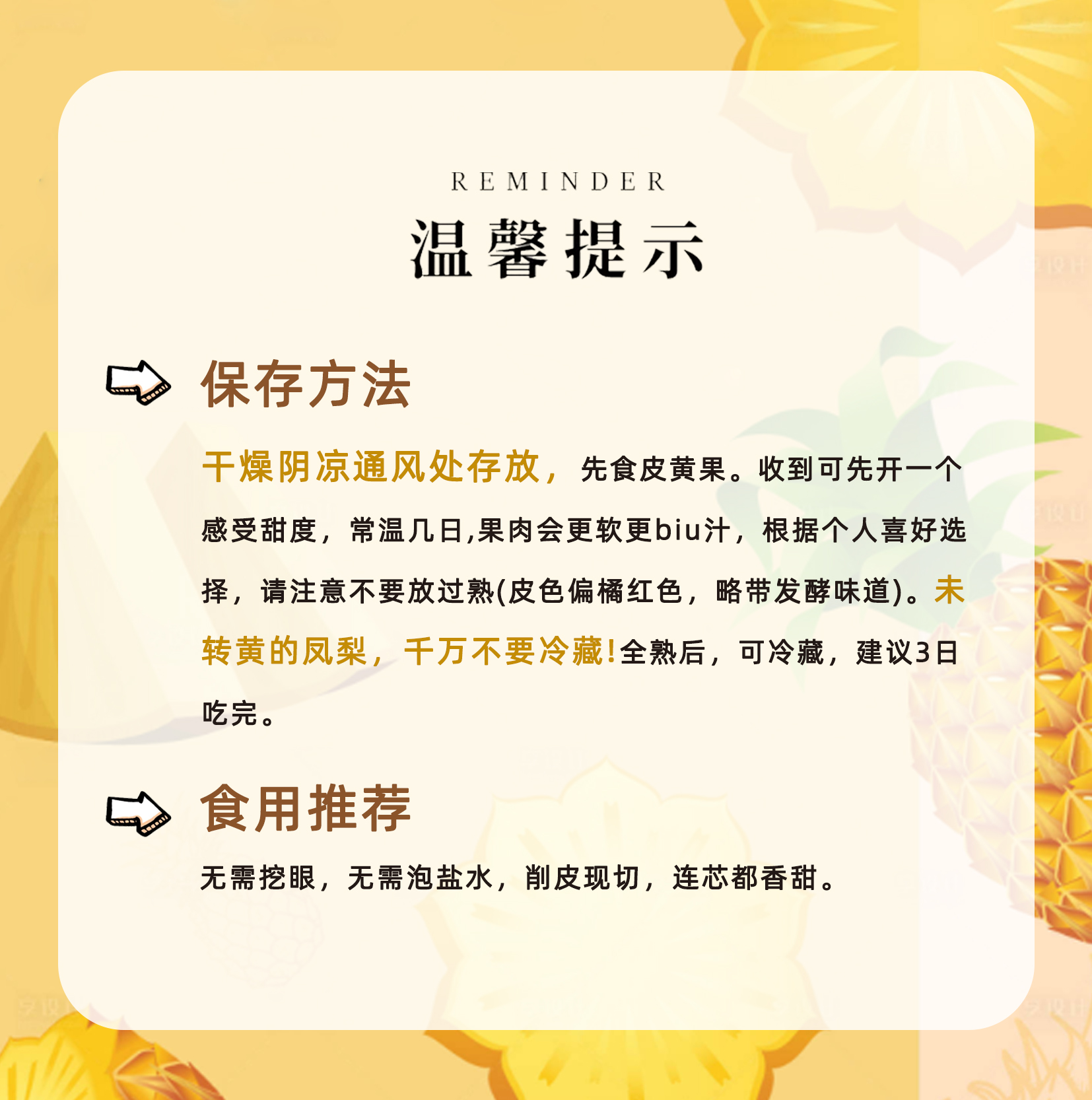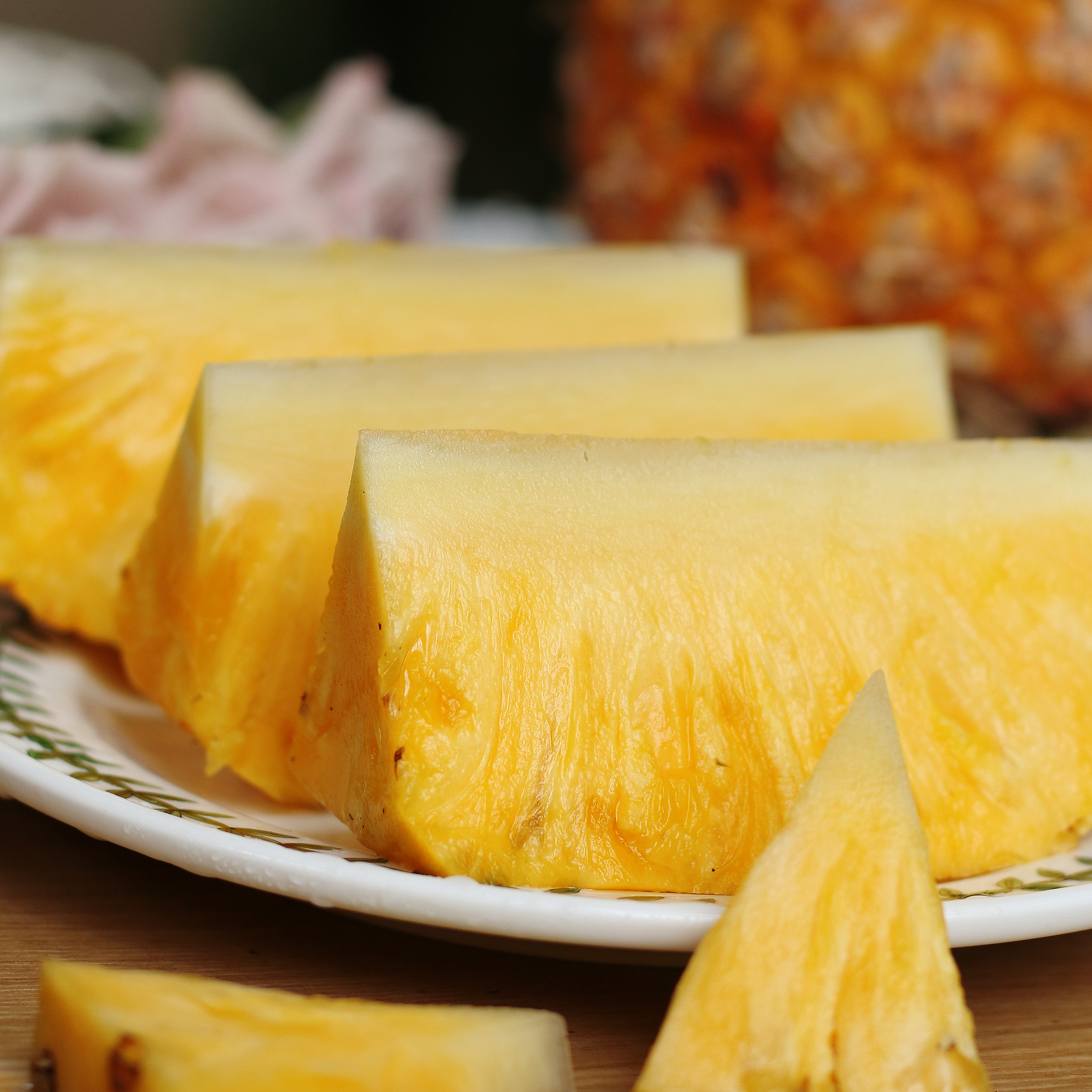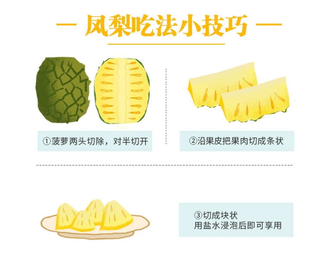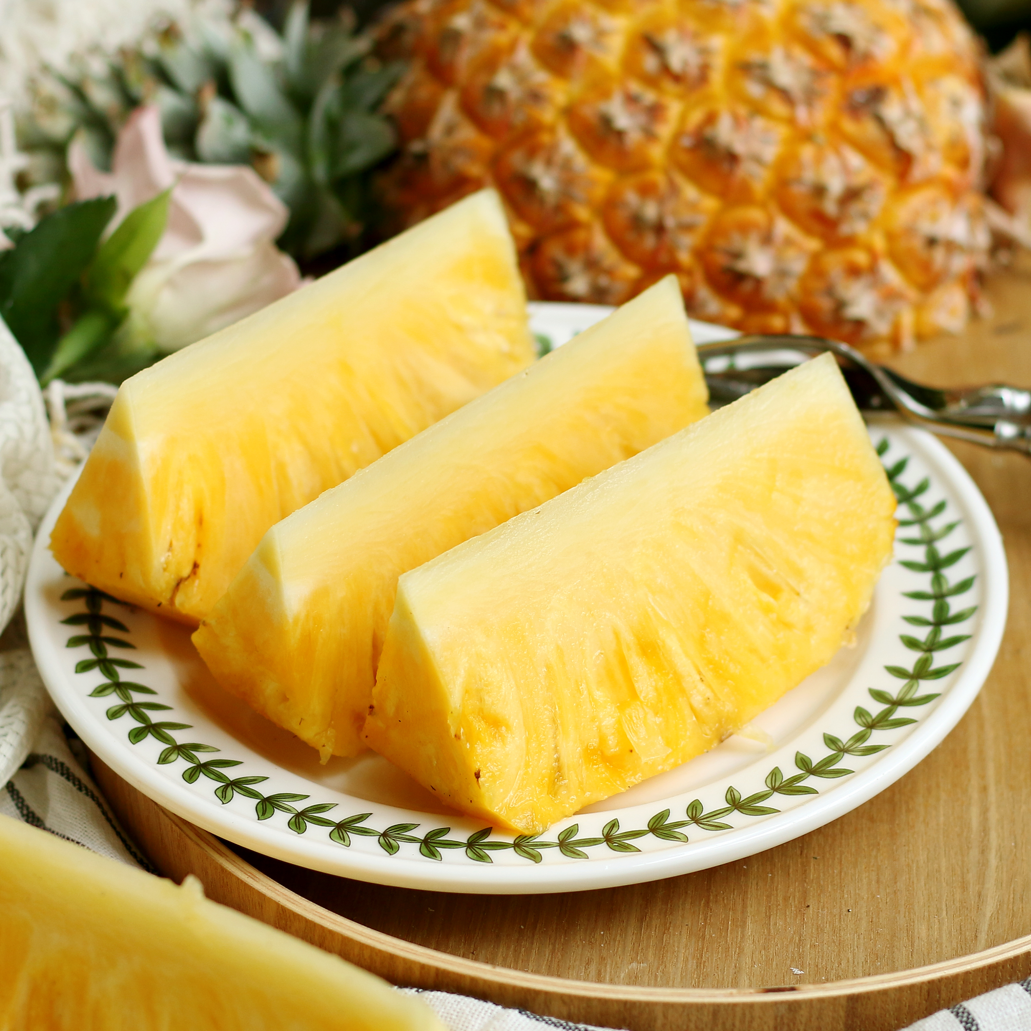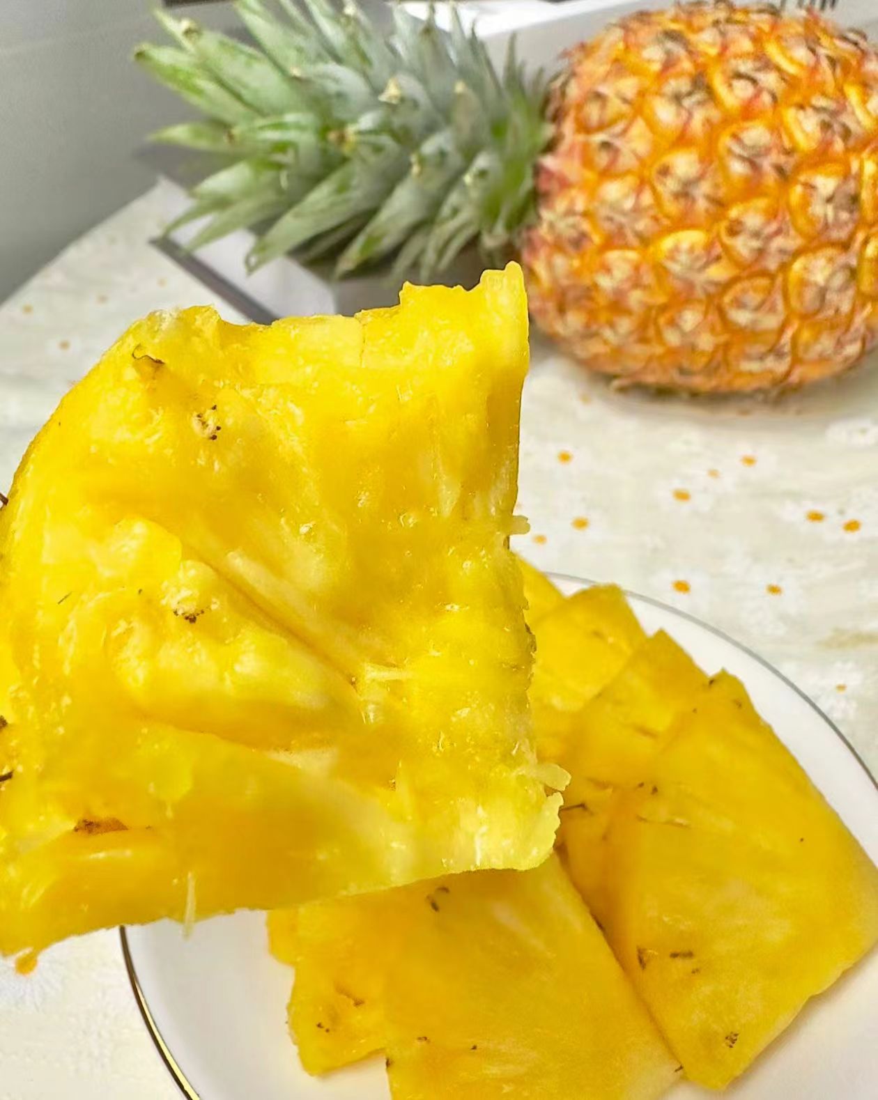 食用率非常高,90%的可食率,不用麻烦的剔毛眼,也不用泡水,像“吃瓜一样吃凤梨”,太畅快了~一口咬下去,只有独特的热带水果的甜蜜,入口没有渣感,稍微嚼两下就化。嘴里就被果肉和果汁填满,不像在吃水果,更像在喝凤梨果汁。
