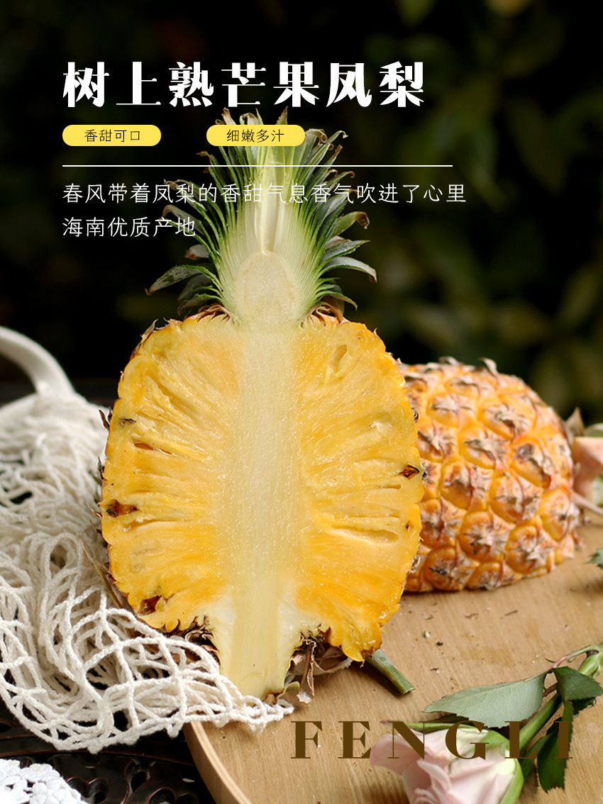 孕育出的凤梨多汁且细腻海南全年温暖湿润,日照充足,土壤以砖红壤为主,土地肥沃,为凤梨的生长提供了得天独厚的环境优势。