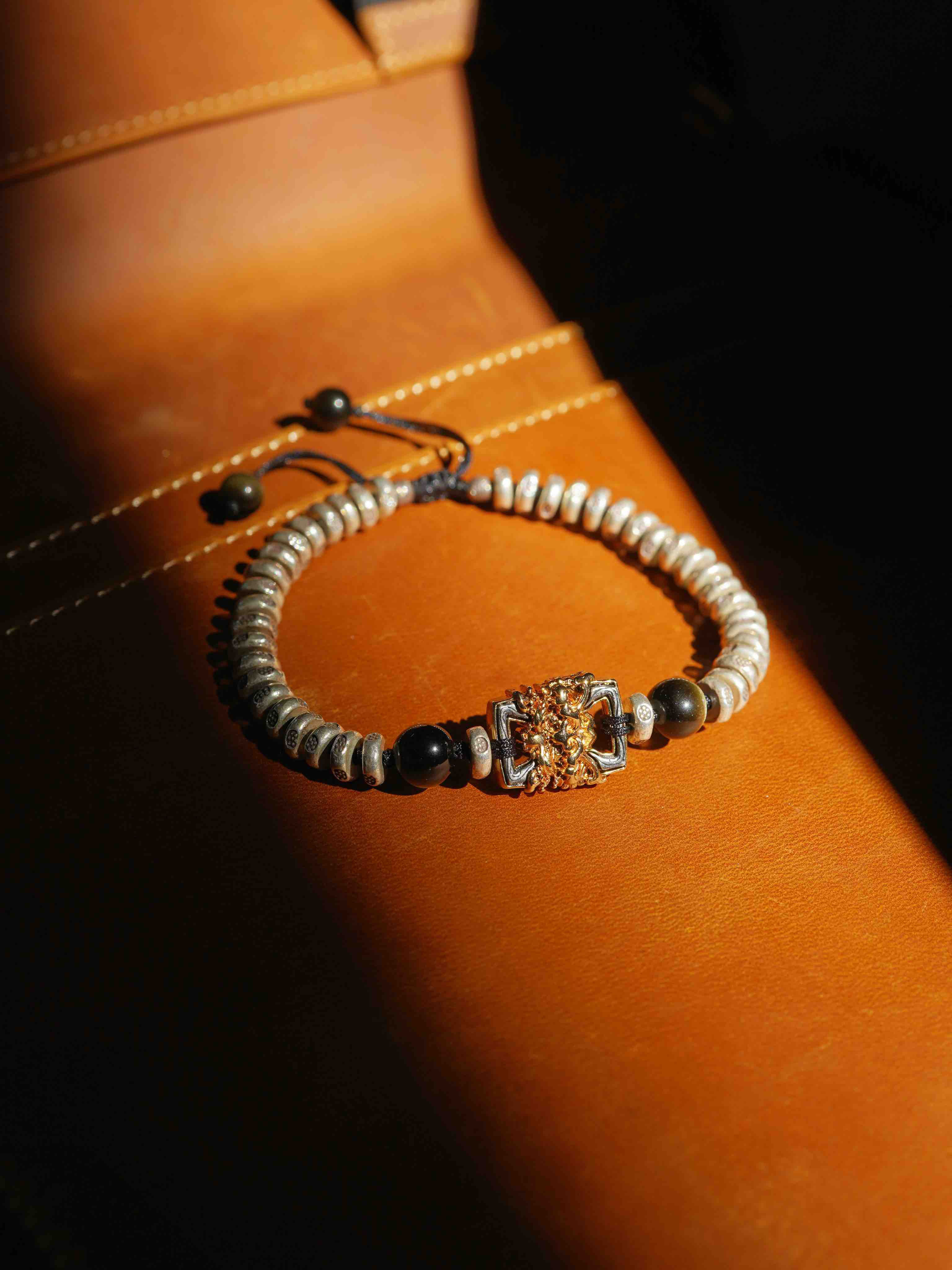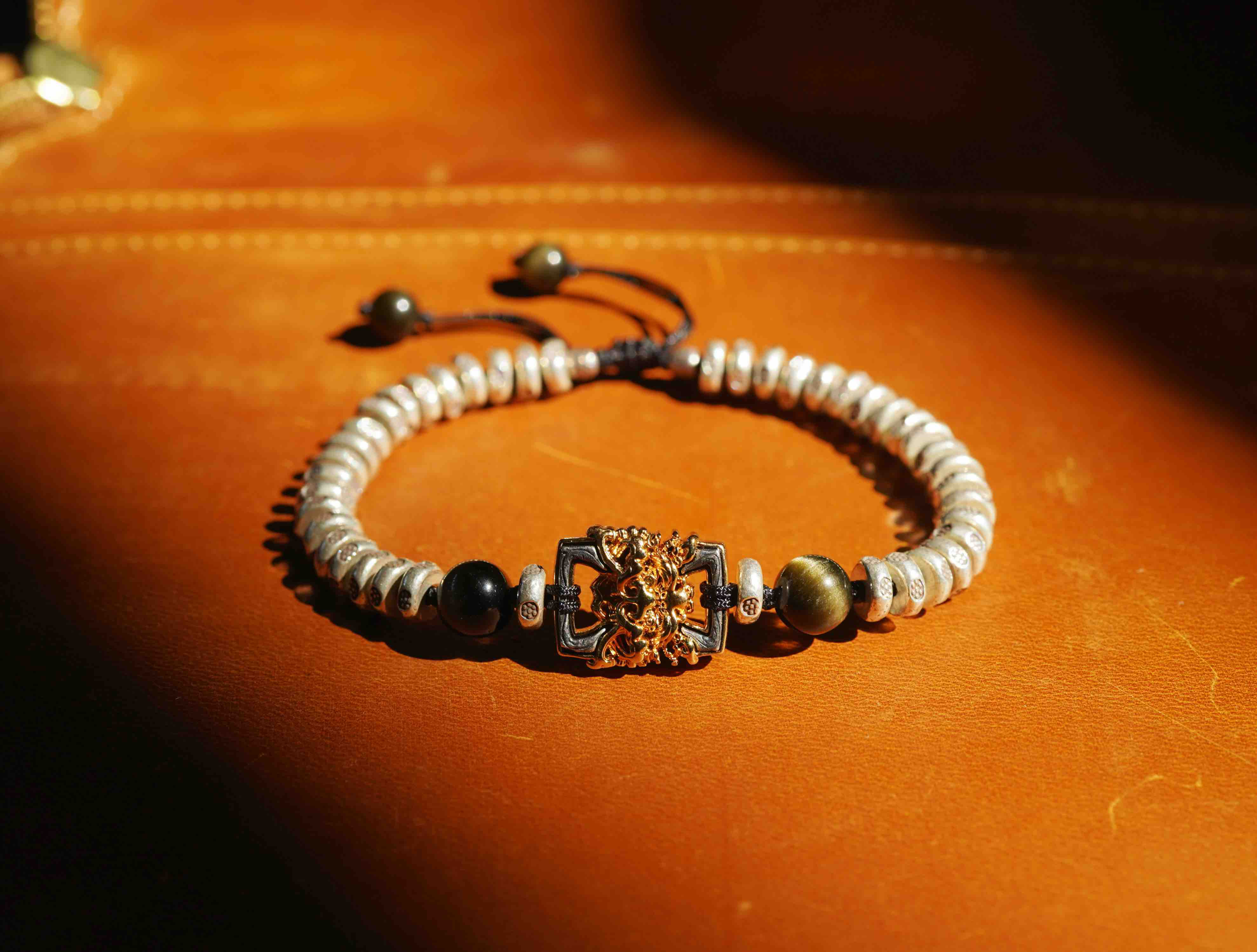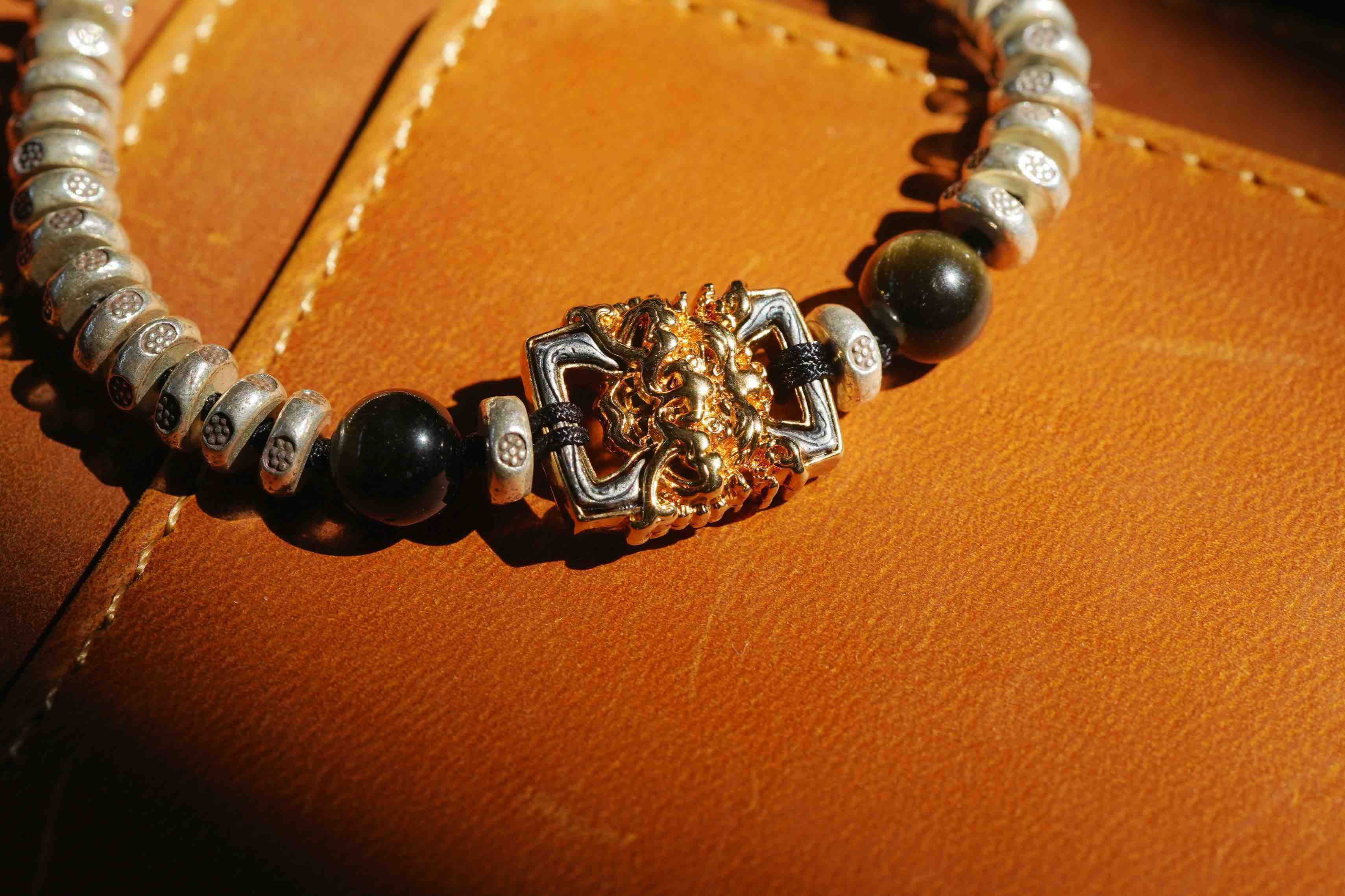 这个月的月历银,男女生都合适。很有力量与分量感,把两种银的工艺做的很极致。一种是泰国手工银的工艺,每一个小花儿都是手工敲打出来的,很细腻。另外一种是18k金相同的银镶嵌工艺,力量感十足的藏式兽面。两种纯银的结合,再用黑曜石牢牢固守住。