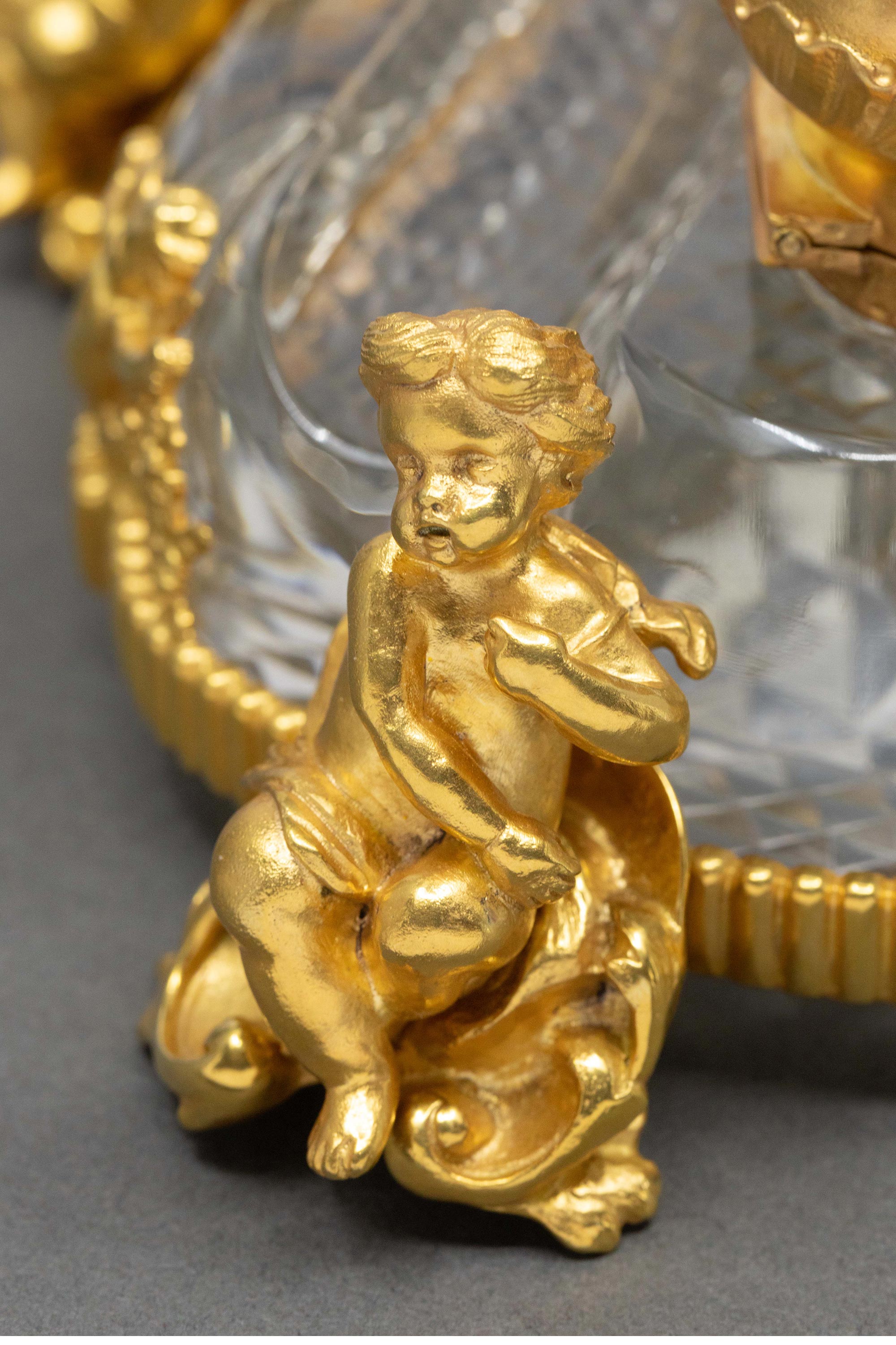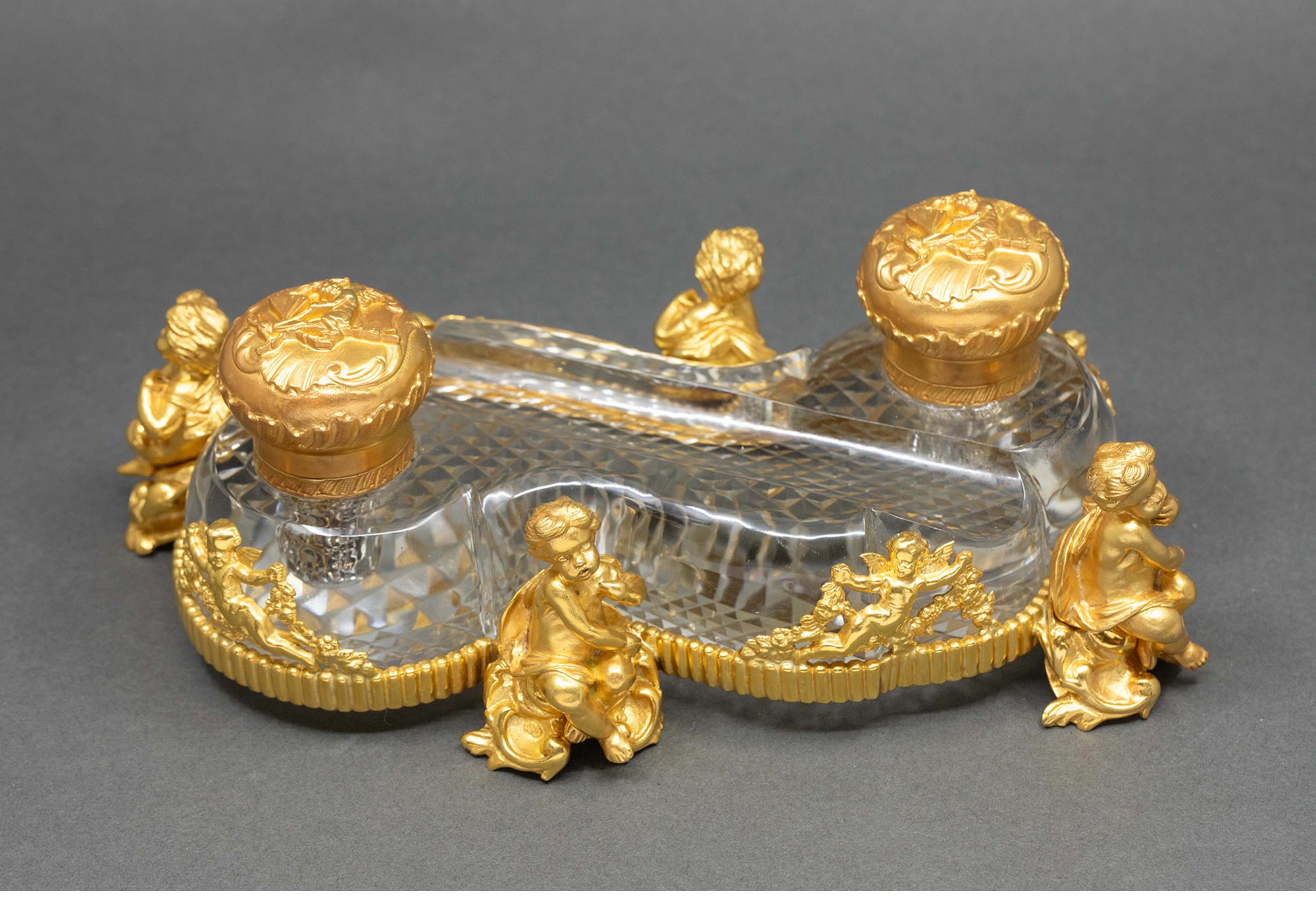 19世纪末法国出品路易十五风格小天使主题铜鎏金精雕装饰水晶墨水瓶