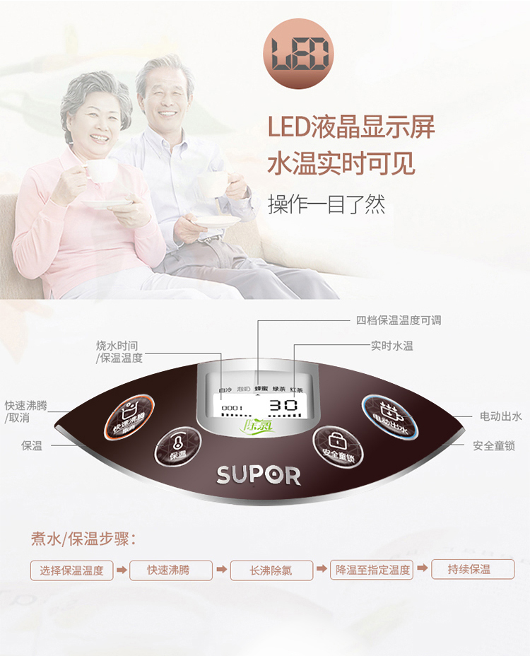 苏泊尔(SUPOR)电热水瓶电水壶电热水壶液晶显温长沸除氯