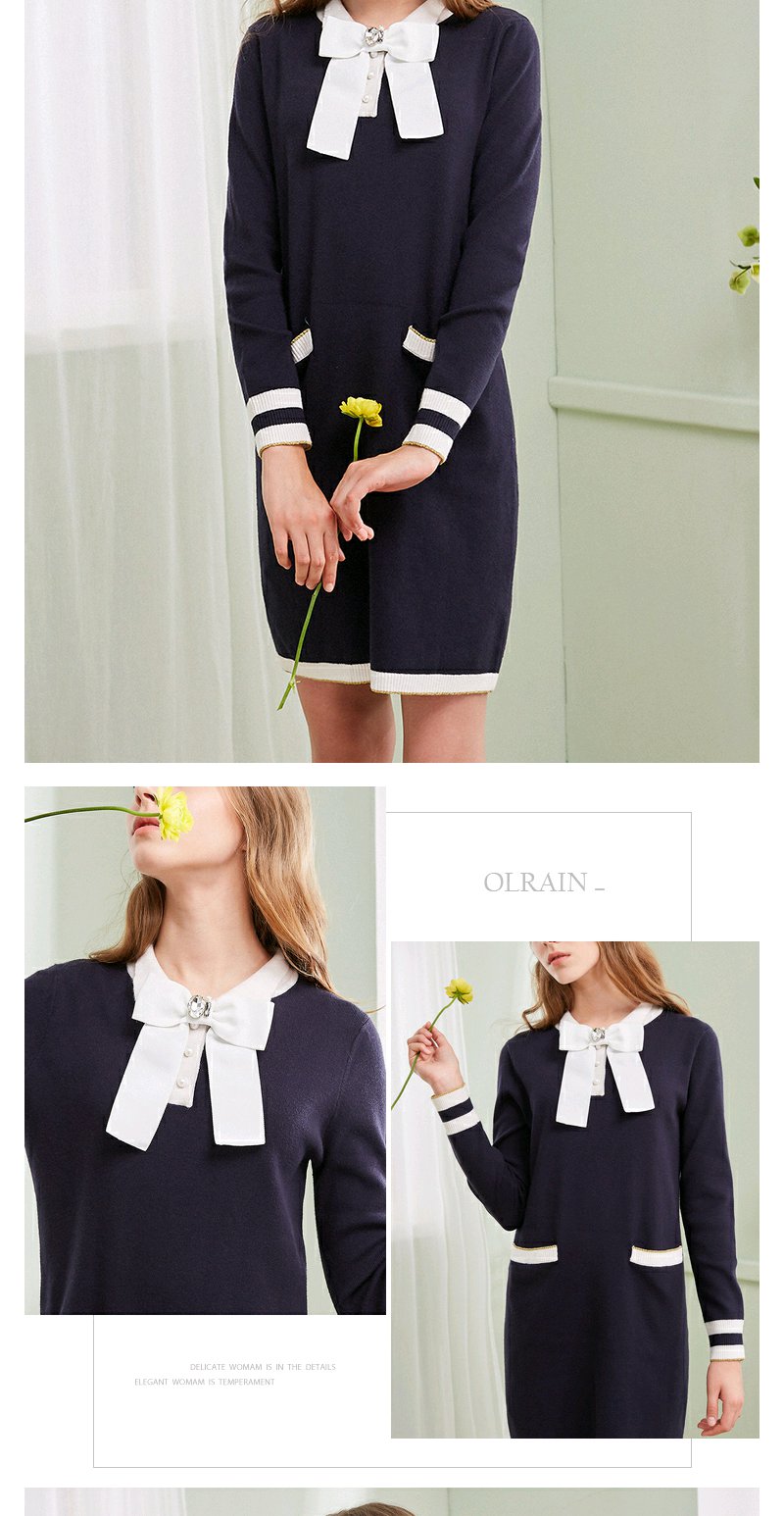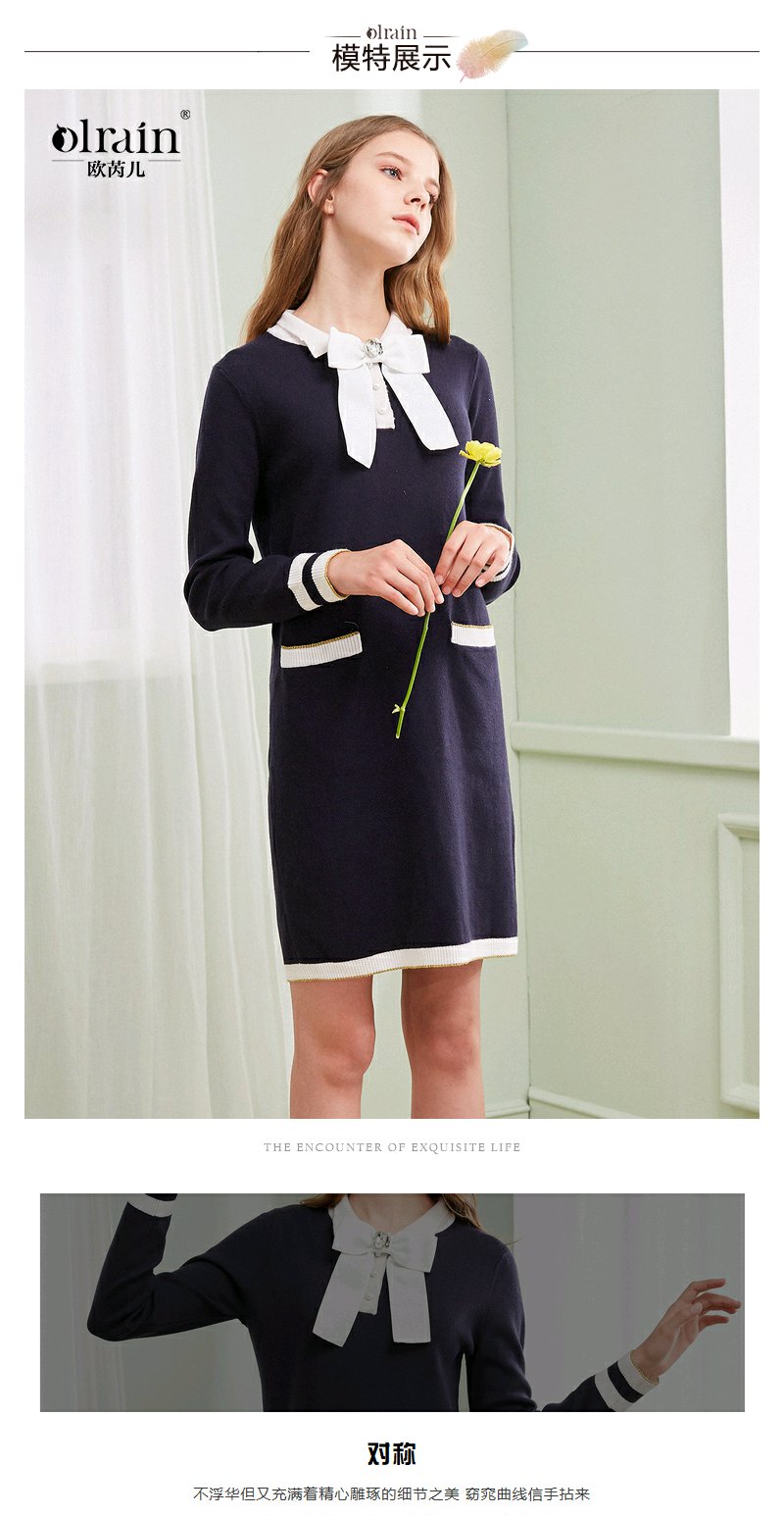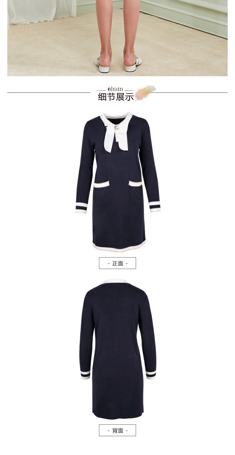 欧芮儿春装新显瘦蝴蝶结系带长袖针织连衣裙女中长款