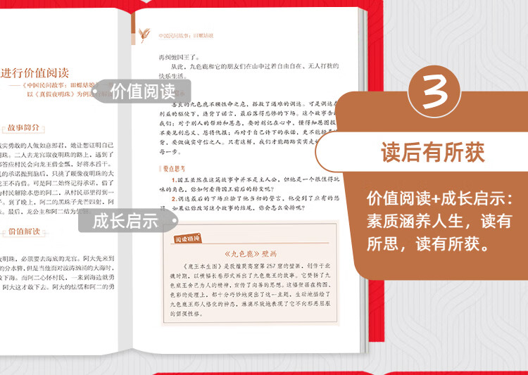 《中国民间故事》收录了许多家喻户晓的民间故事,比如《牛郎织女》《白蛇传》《孟姜女哭长城》《田螺姑娘》《梁山伯与祝英台》等。这些民间故事极具代表性,是劳动人民共同创造的精神财富,也是民族文学的重要组成部分。它有着永恒的艺术魅力,饱含想象力,承载着人们对真善美的执着追求,让我们在享受故事的趣味性时,也能得到精神上的洗礼。