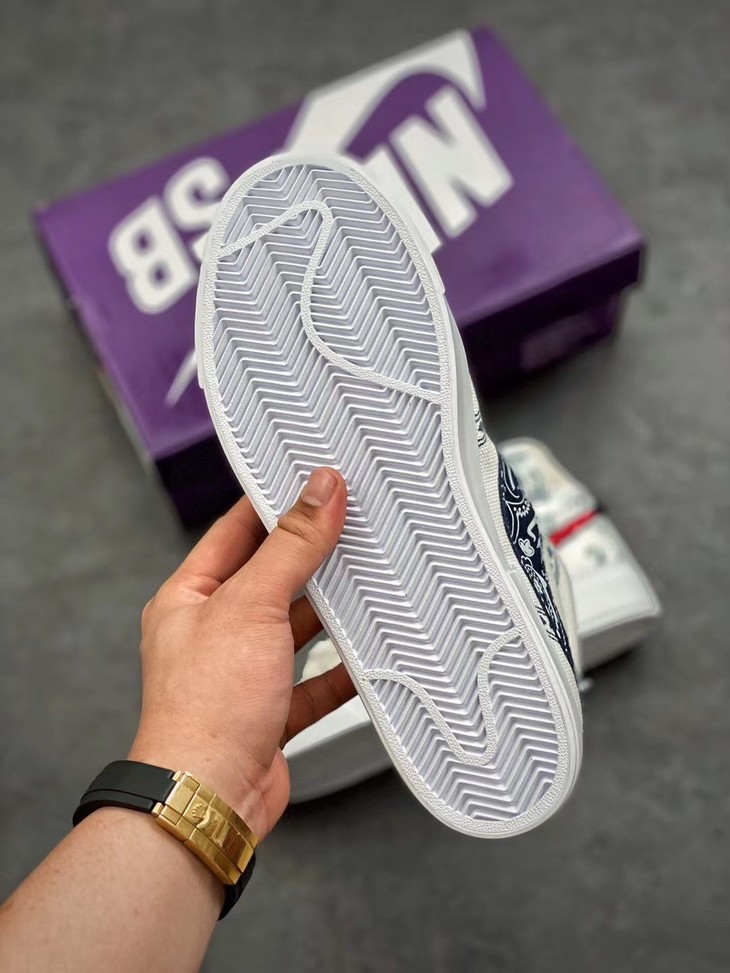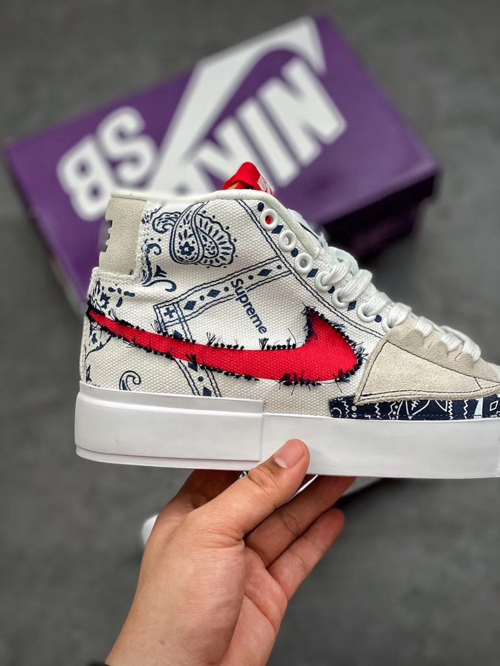 Nike sb Blazer Edge 独特拆线设计 整双鞋采用今年热门的解构设计思路,帆布与麂皮材质的拼接呈现在 Blazer 鞋身上。独特的双鞋舌设计表现相当抢眼最大亮点当属侧身的拆线