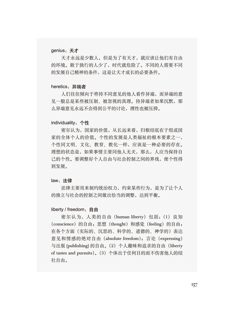 《论自由》被誉为“肯定人类个体的个性不可泯灭的价值*优雅,意义*重大,影响*为深远的宣言”,对它的解读从出版时就一直处于辩论和争议之中。书中论述了资本主义制度下的公民自由权利,阐明“社会所能合法施用于个人的权力的性质和限度”,并提出了自由的各项“原则”。