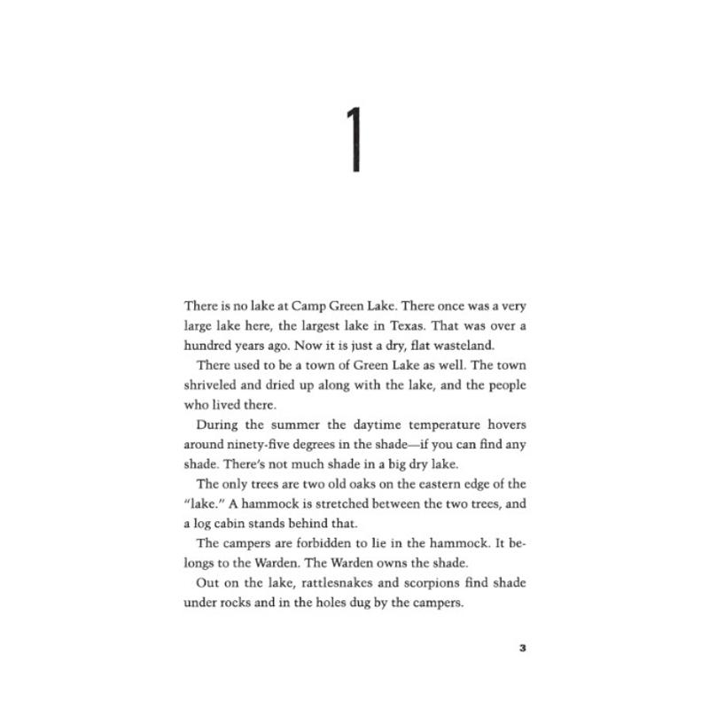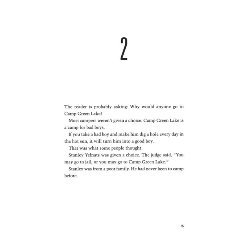 Stanley Yelnats is under a curse. A curse that began with his no-good-dirty-rotten-pig-stealing-great-great-grandfather and has since followed generations of Yelnatses. Now Stanley has been unjustly sent to a boys’ detention center, Camp Green Lake, where the boys build character by spending all day, every day digging holes exactly five feet wide and five feet deep. There is no lake at Camp Green Lake. But there are an awful lot of holes.