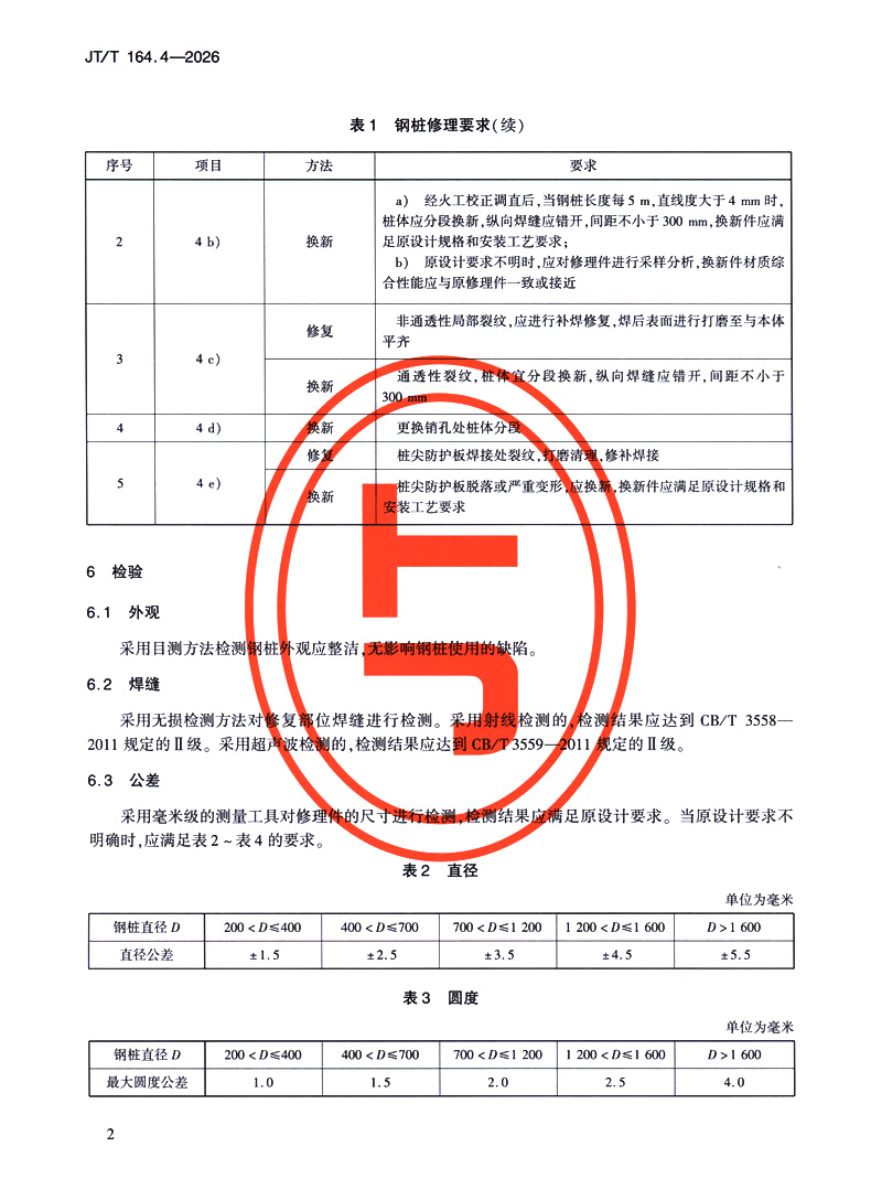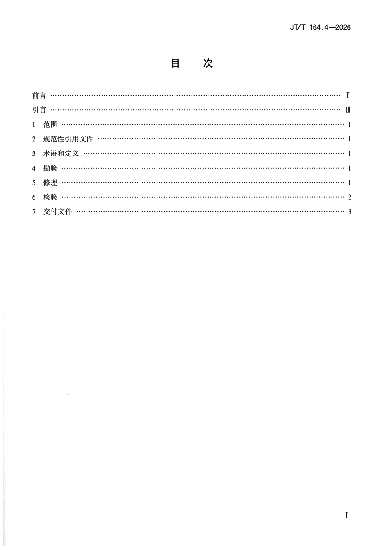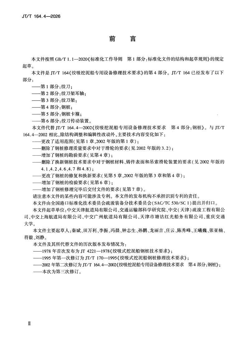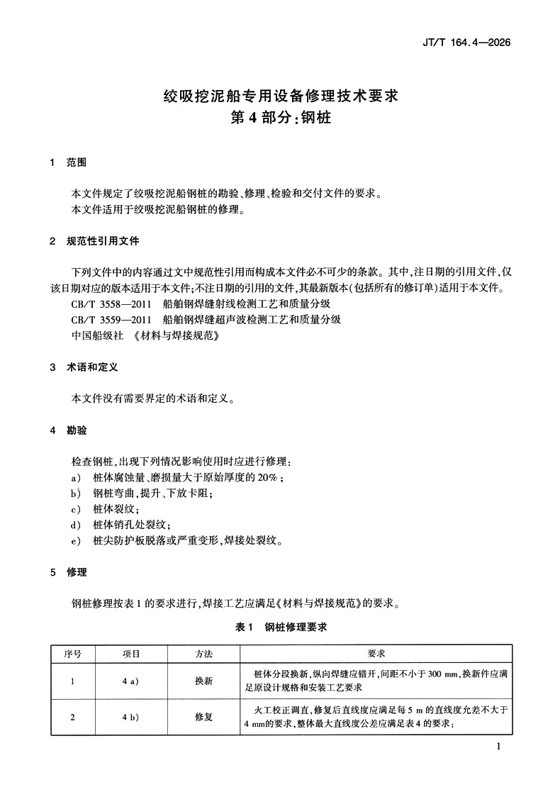 书名:绞吸挖泥船专用设备修理技术要求 第4部分:钢桩(JT/T 164.4—2026)