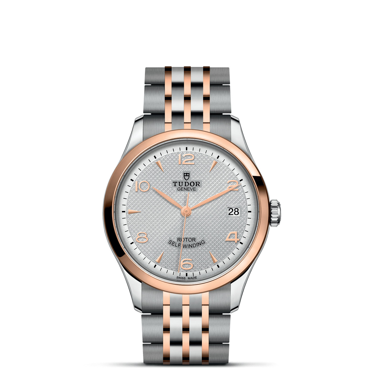 玫瑰金首排中央链节位于6点钟及12点钟位置;其他精钢中央链节覆有0.2毫米18K玫瑰金薄层