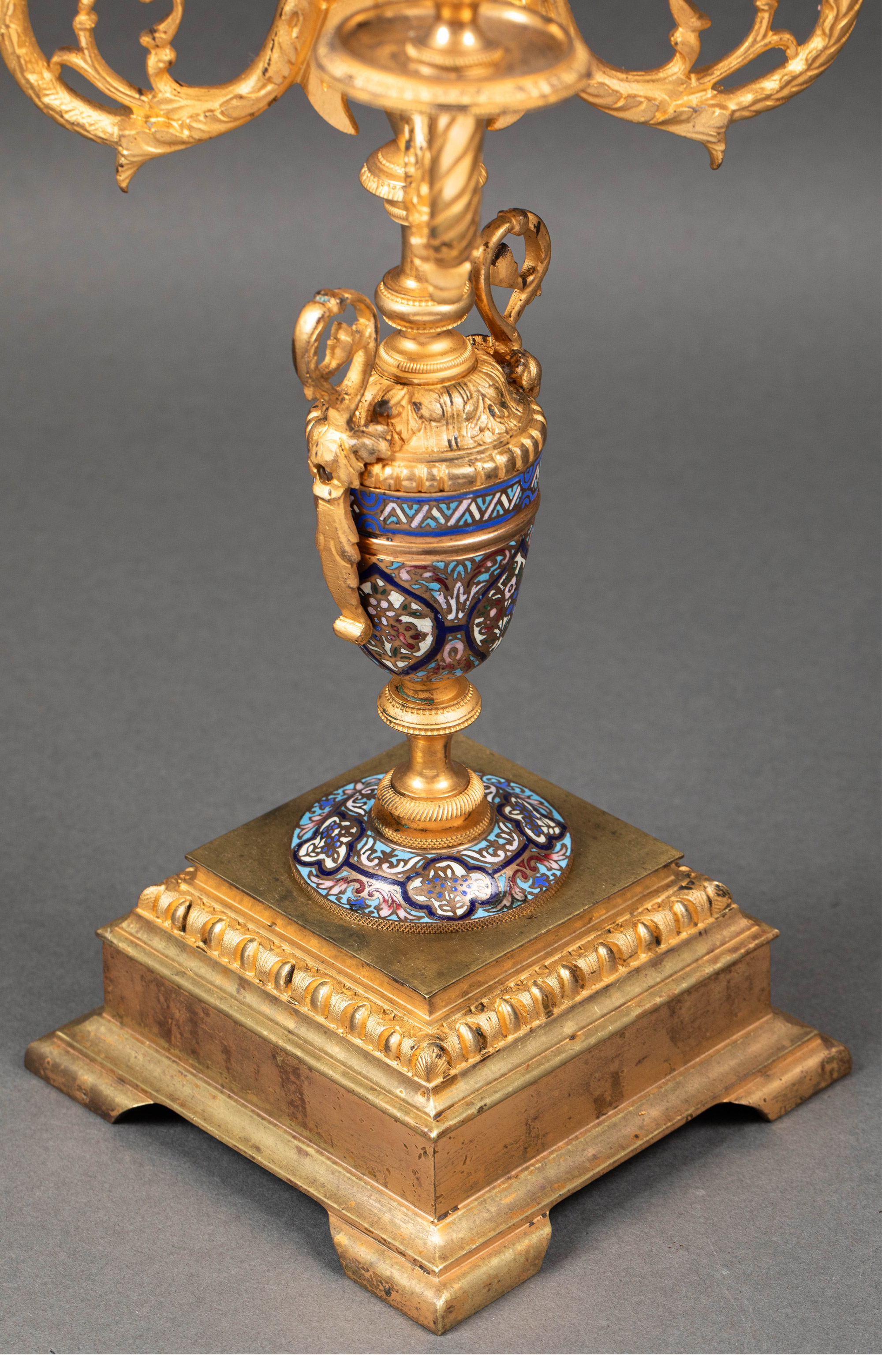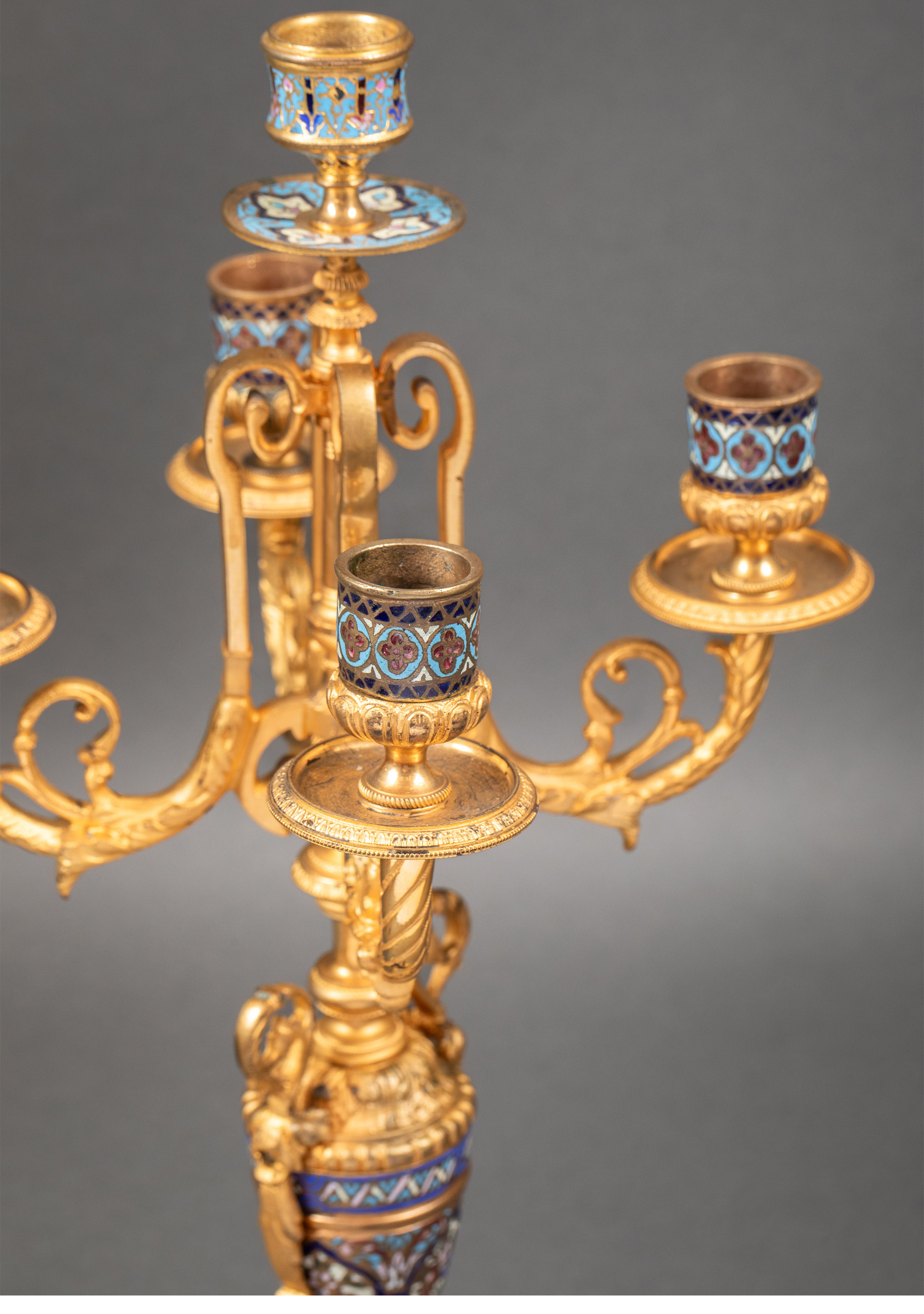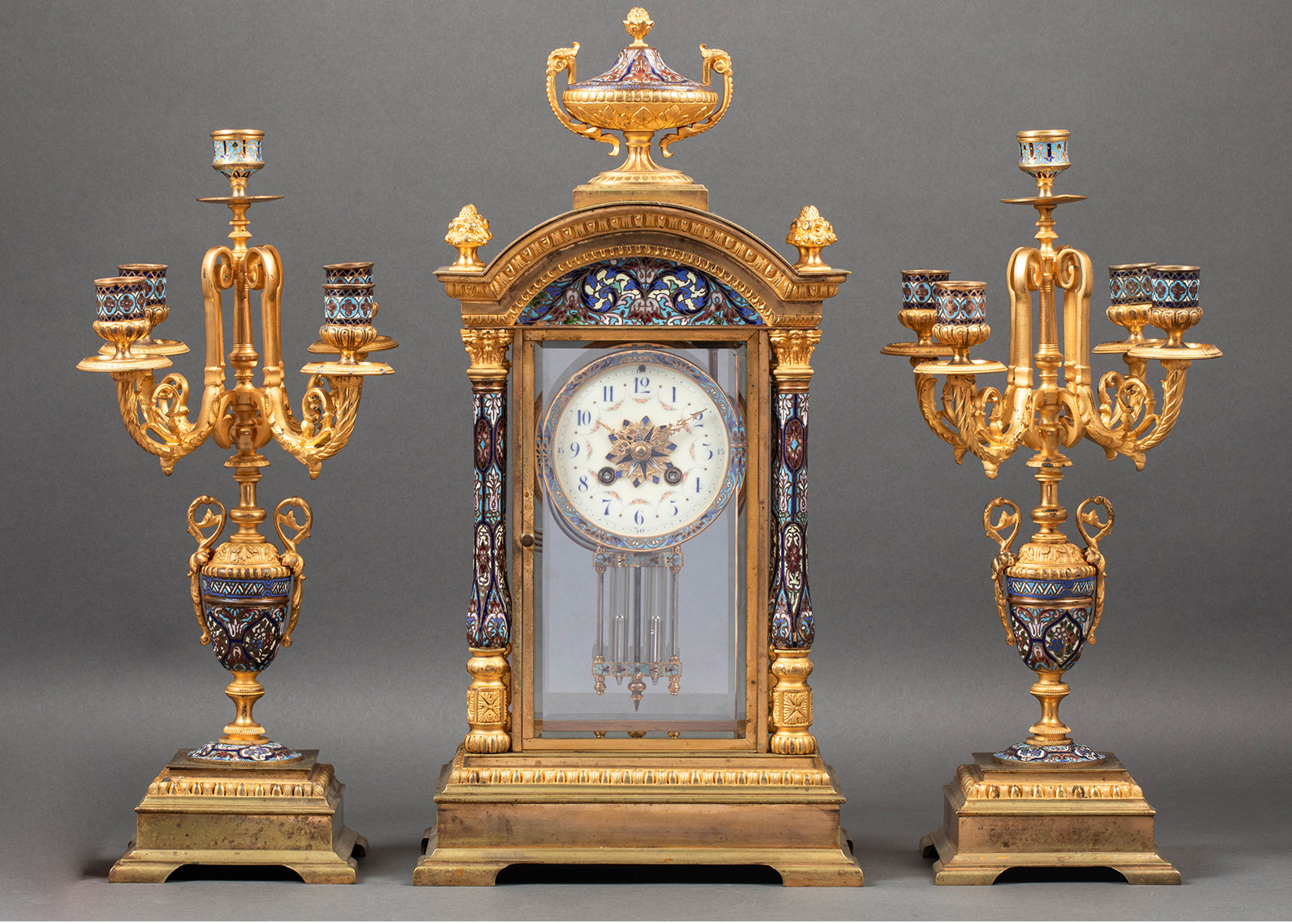 19世纪末法国出品新古典主义风格铜鎏金精雕镶嵌錾胎珐琅座钟烛台三件套
