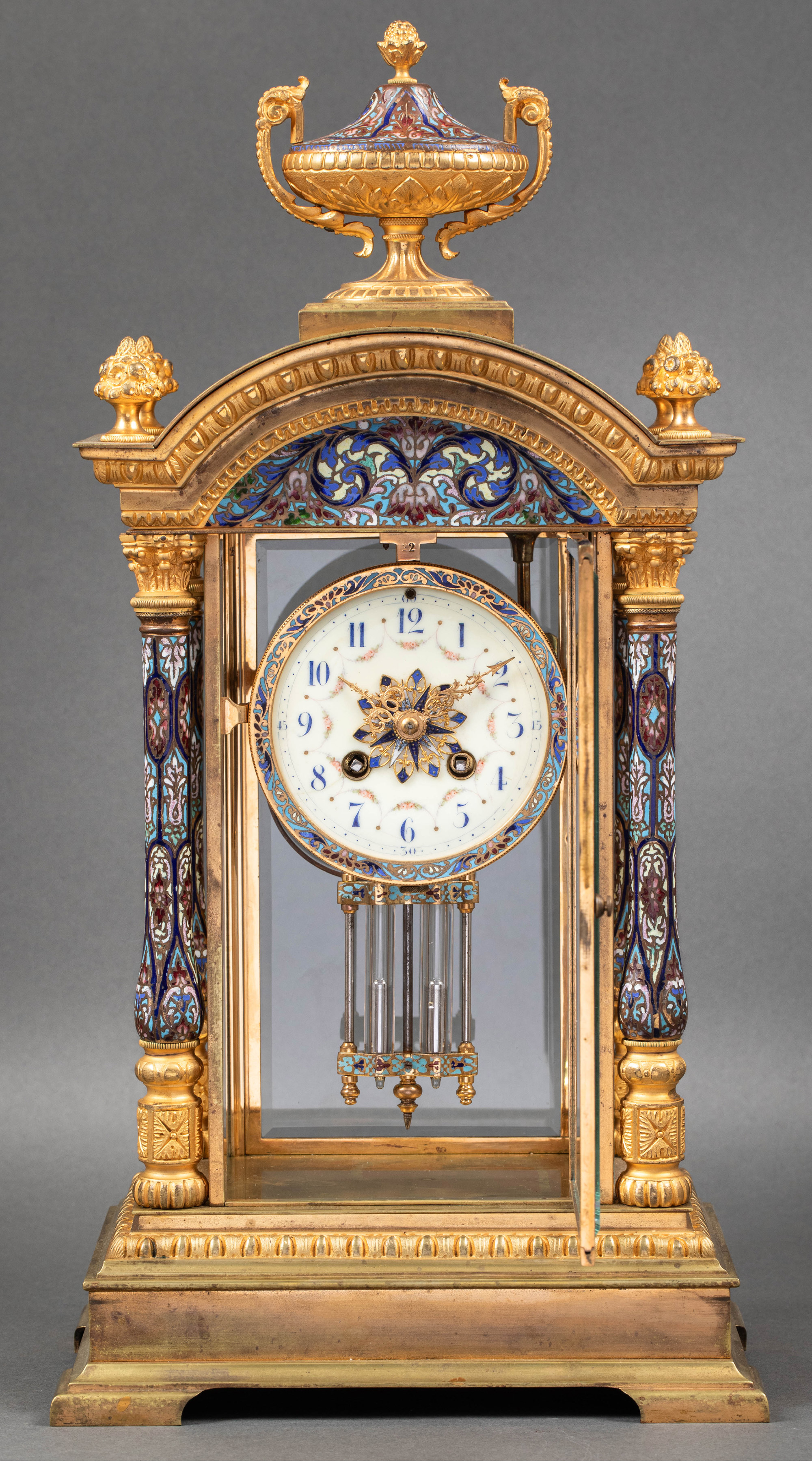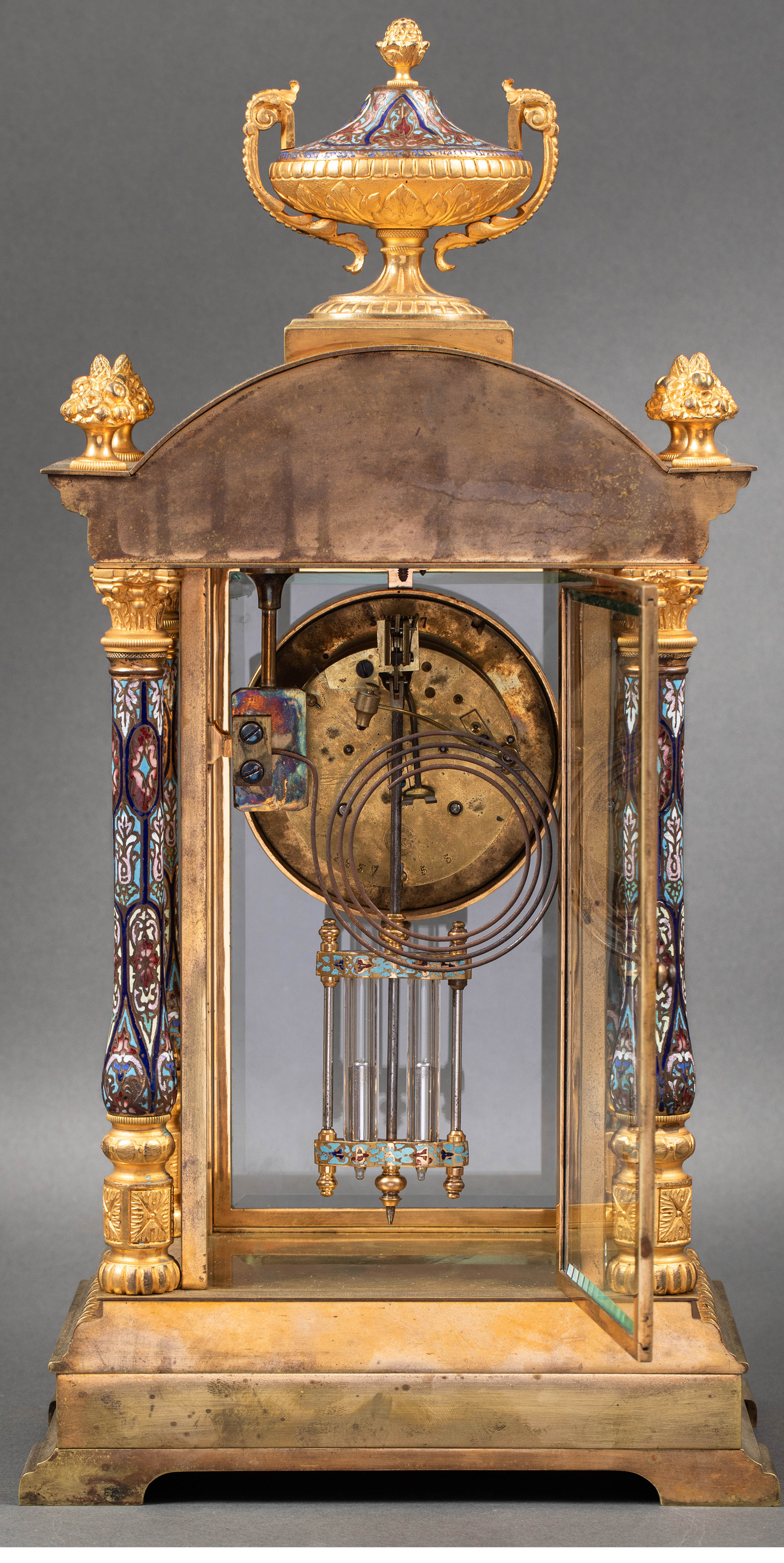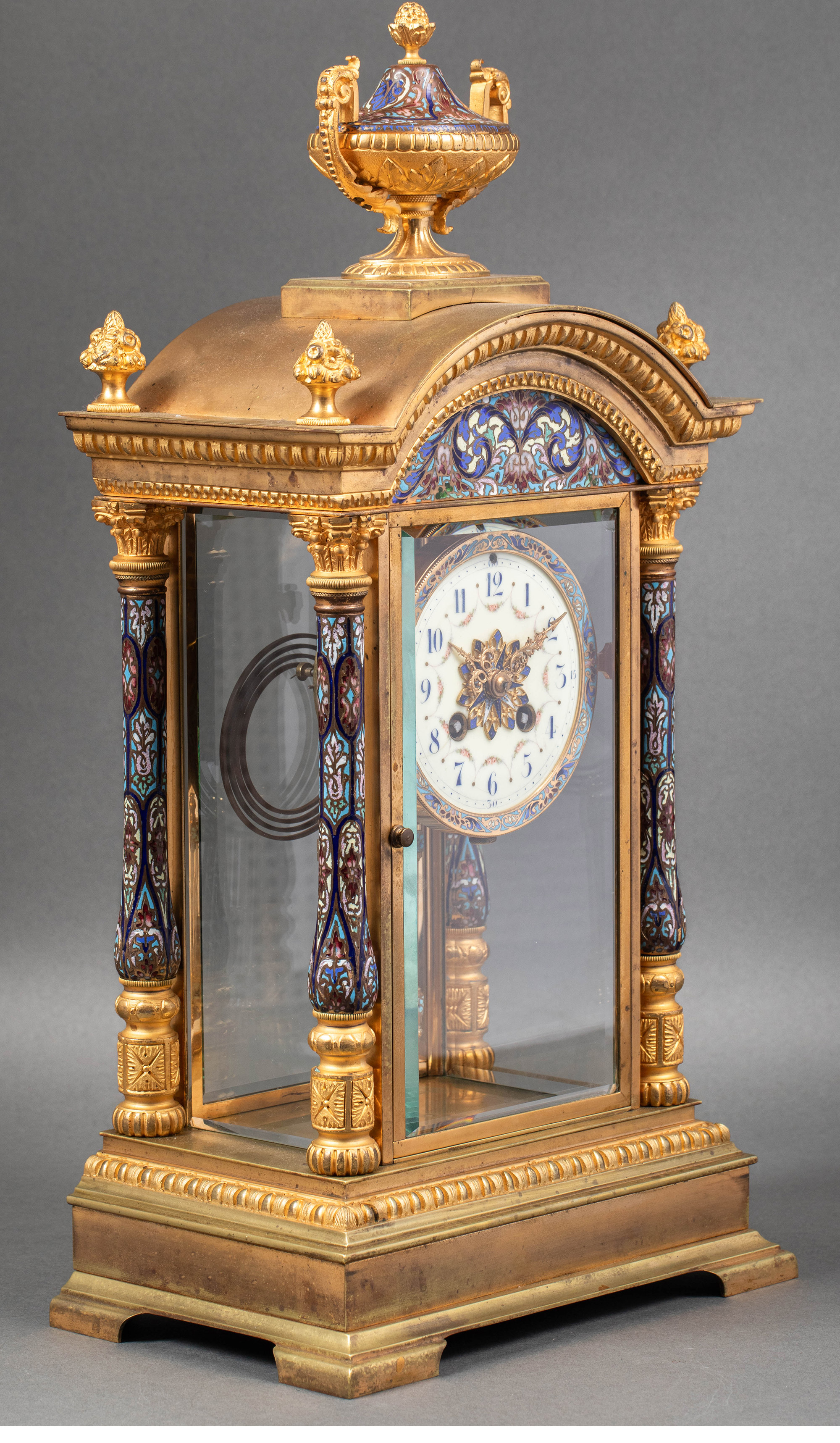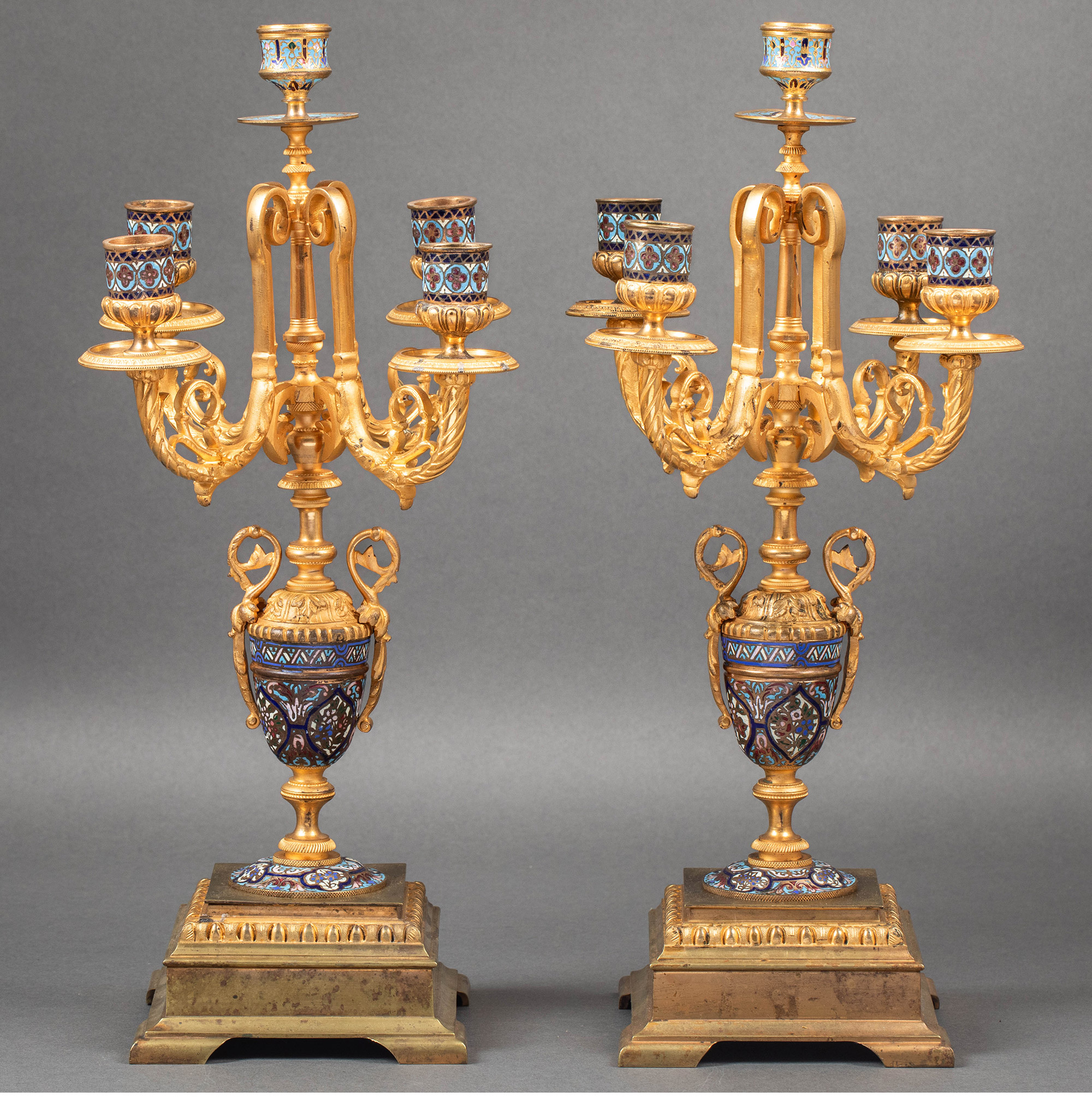 19世纪末法国出品新古典主义风格铜鎏金精雕镶嵌錾胎珐琅座钟烛台三件套