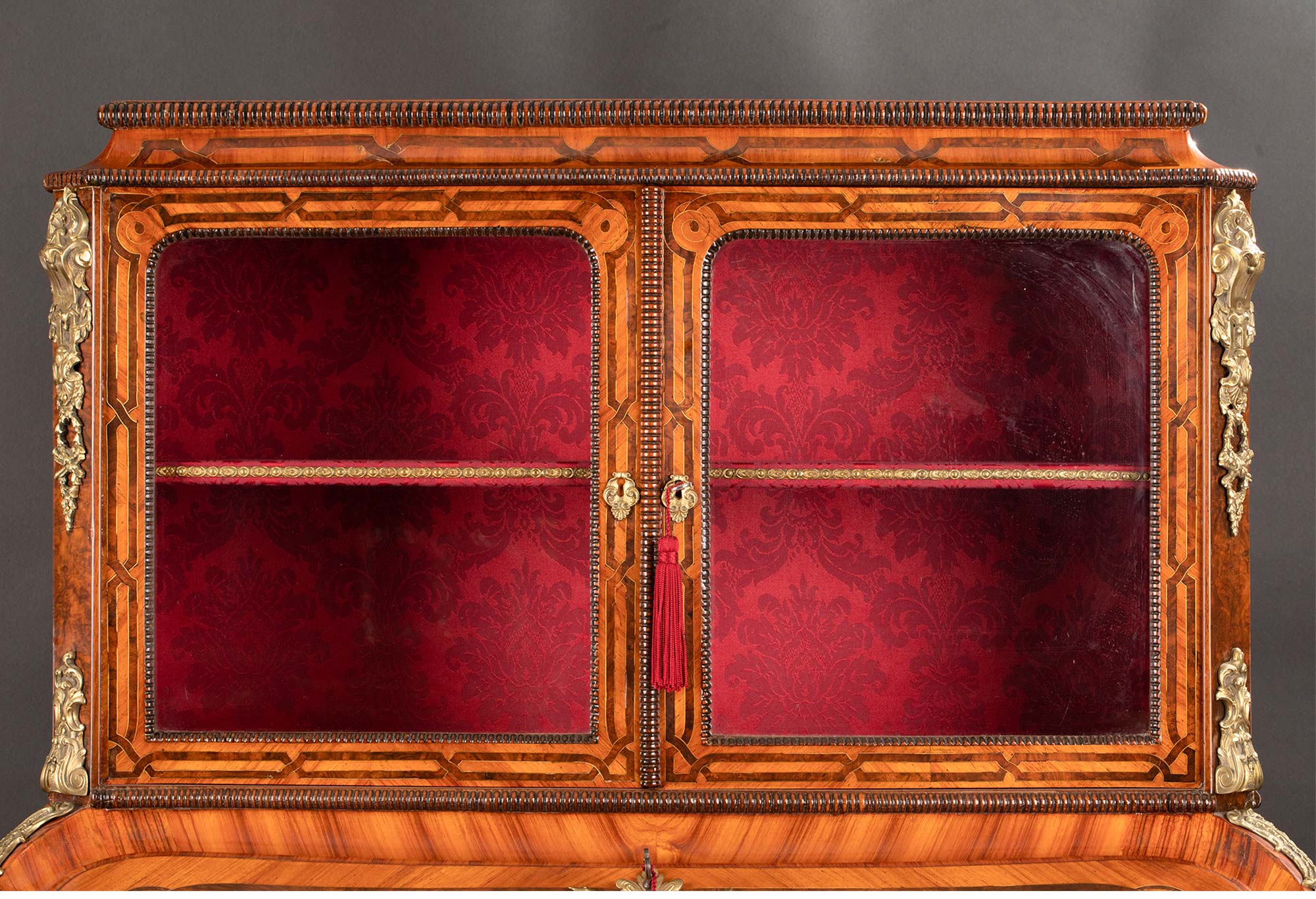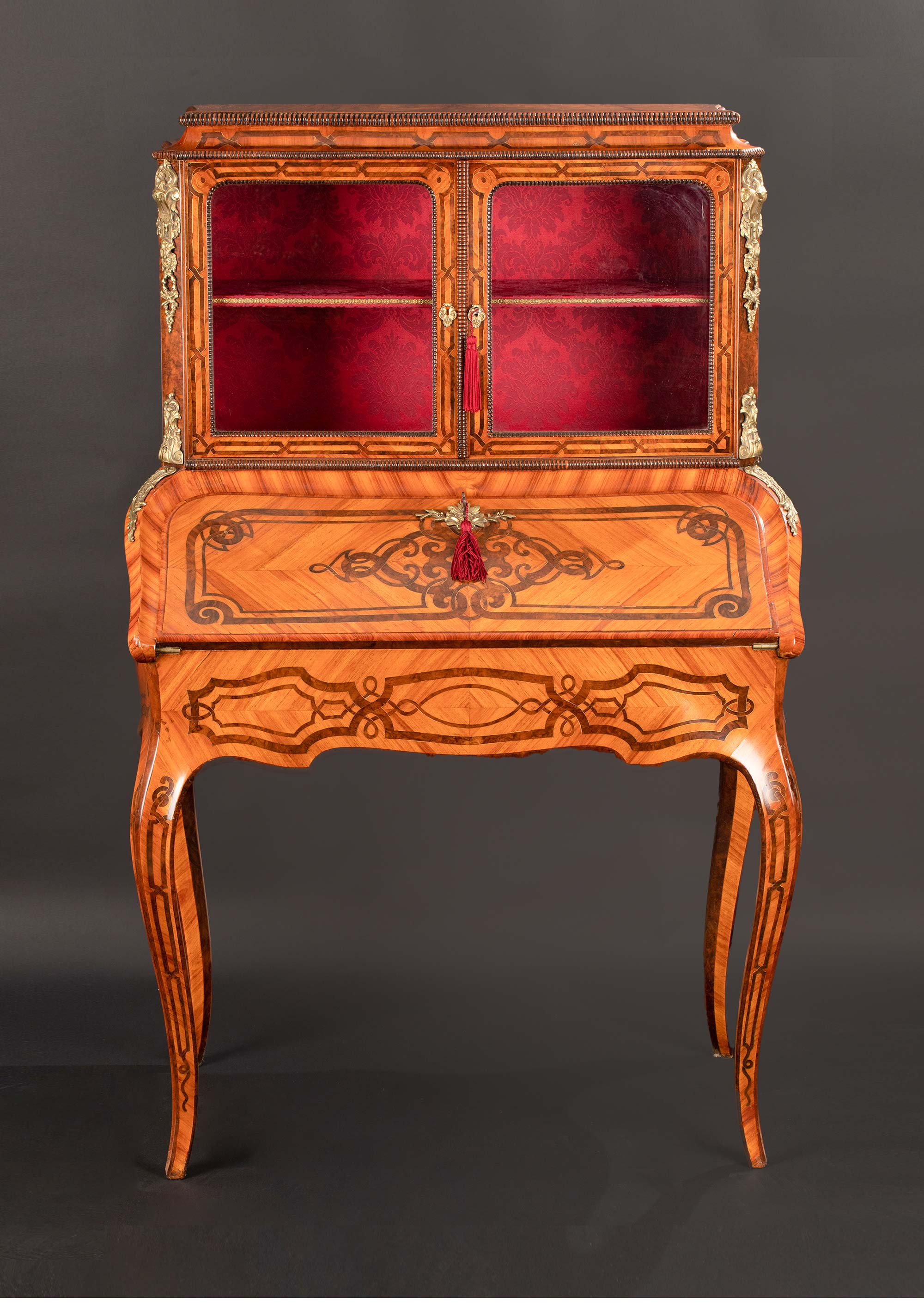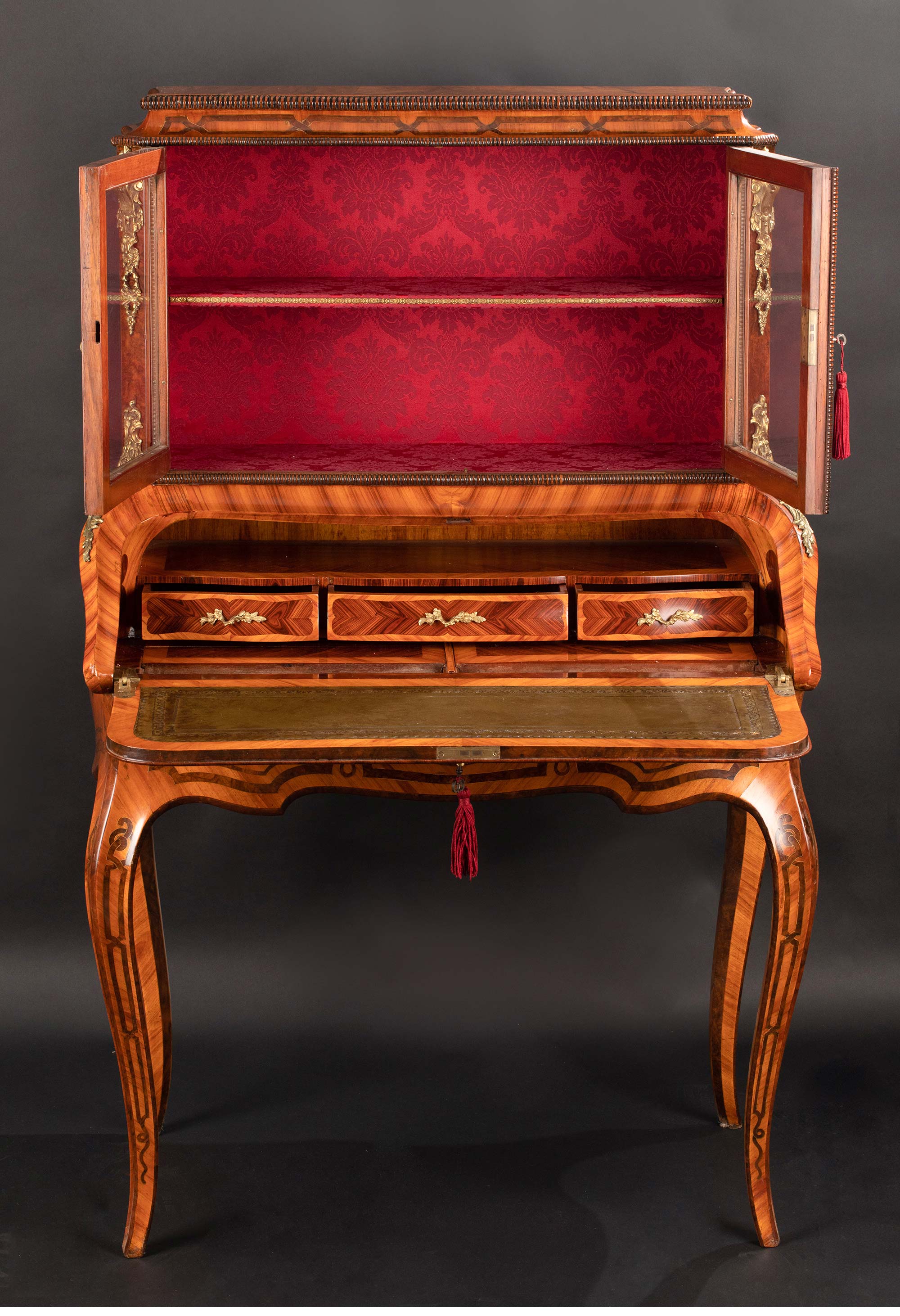 材质:硬木,国王木及紫心木贴皮,铜鎏金,锦缎,皮革,玻璃
