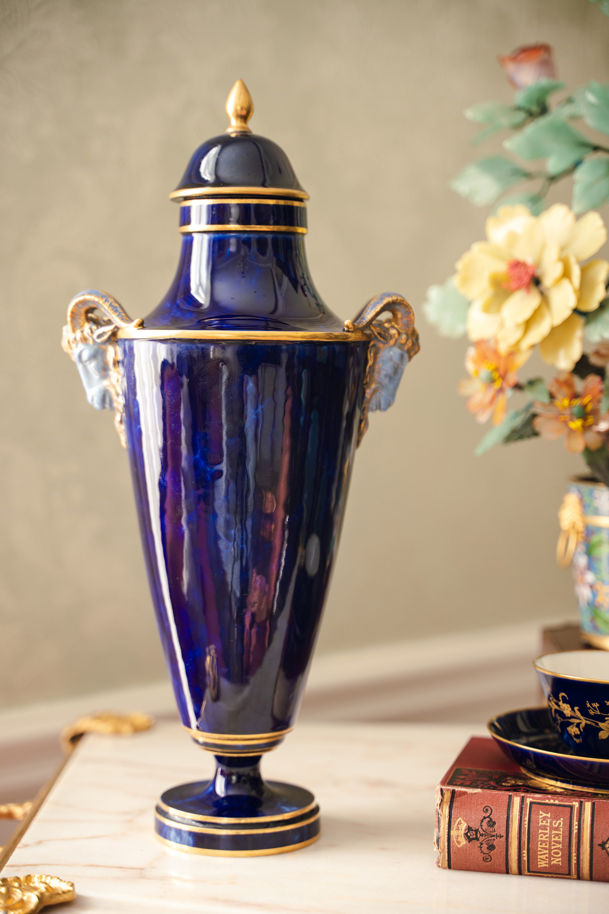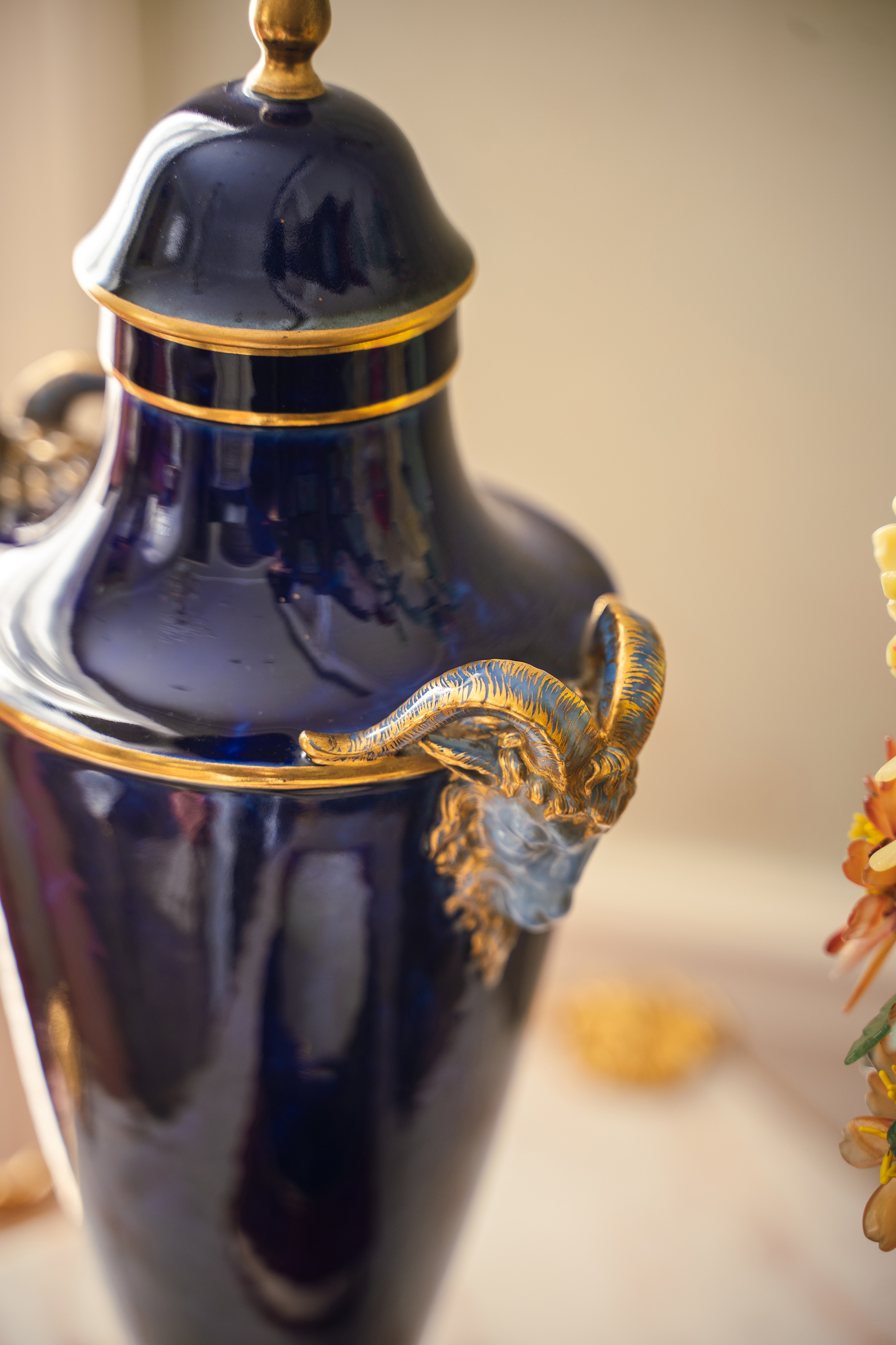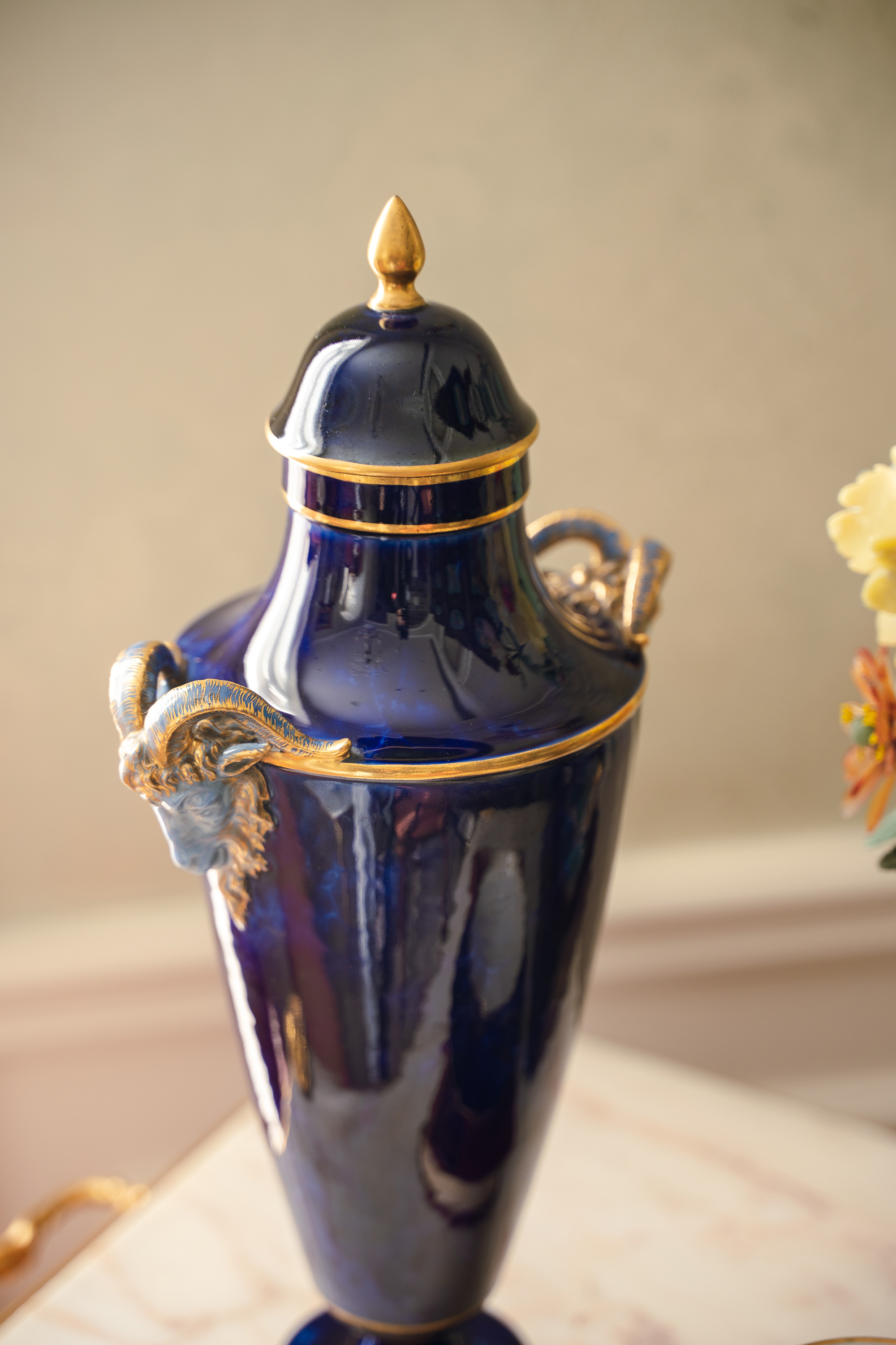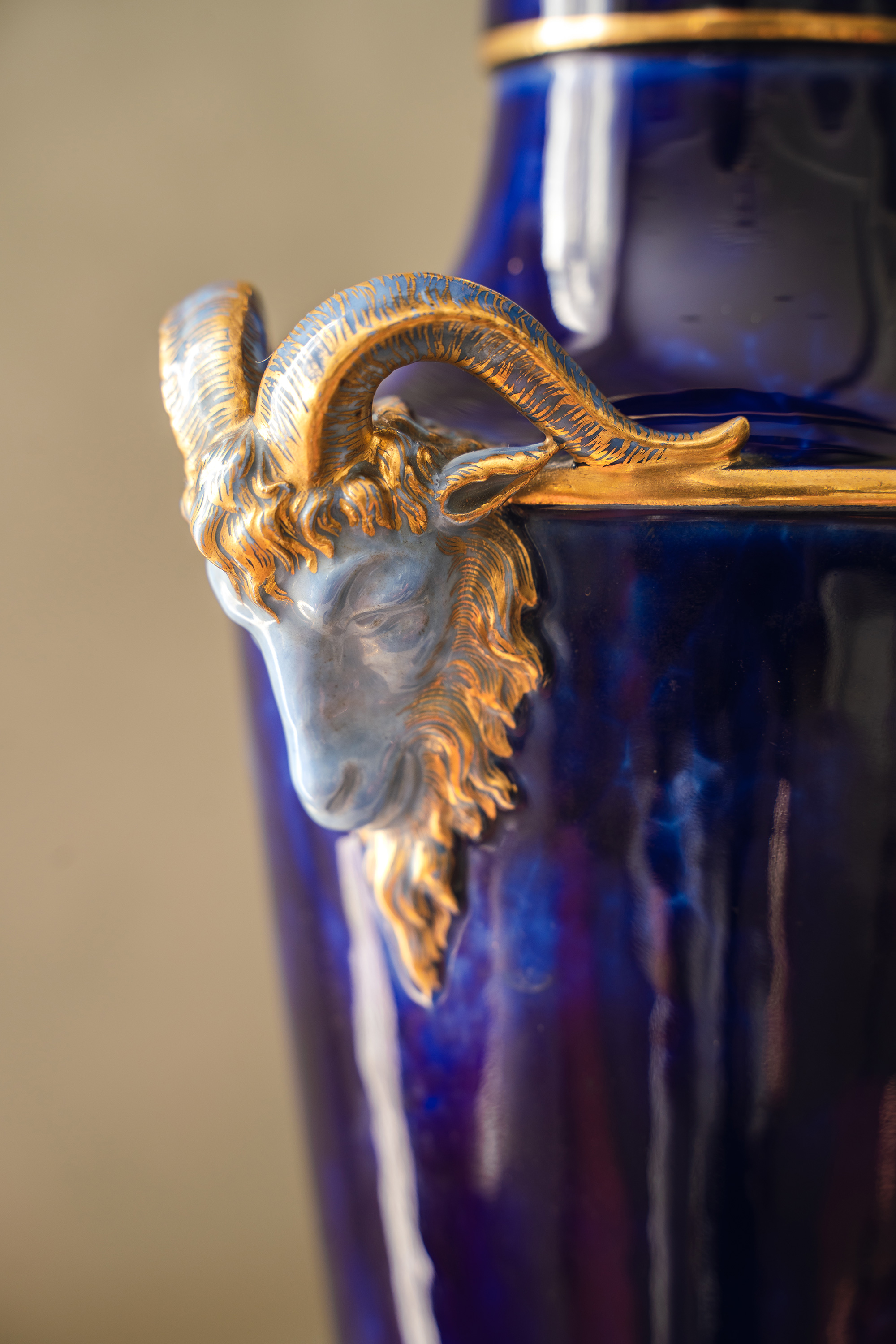 1879年代法国御窑塞弗尔签名出品手绘描金装饰羊首双耳云朵蓝釉带盖瓷瓶