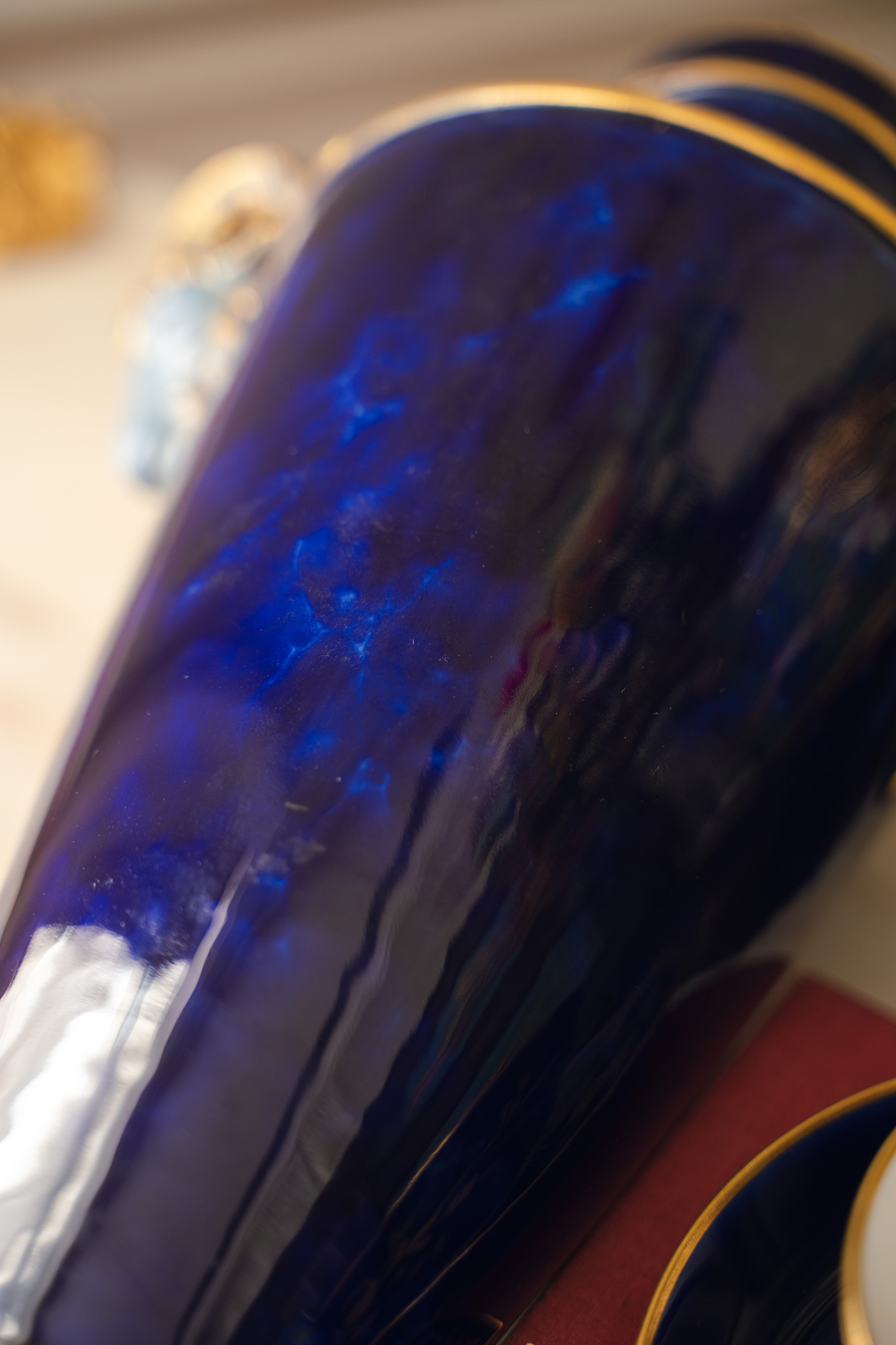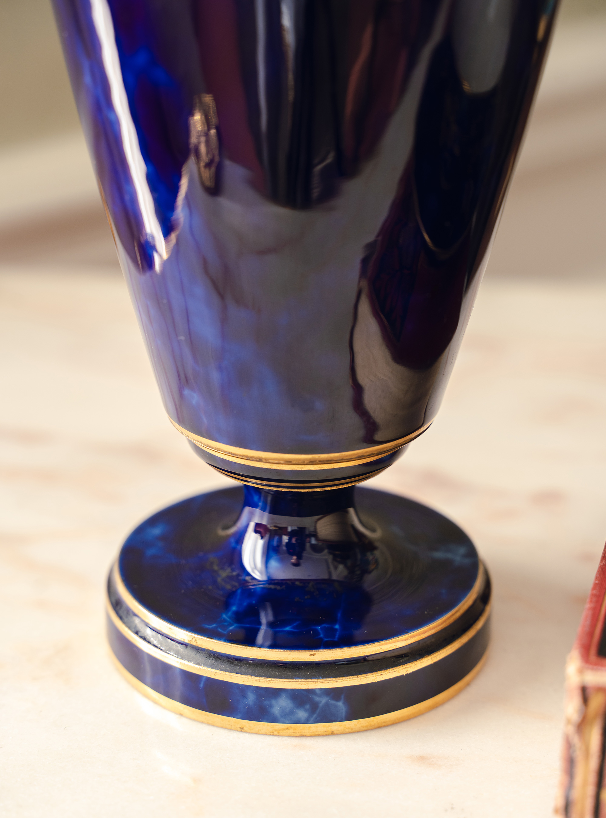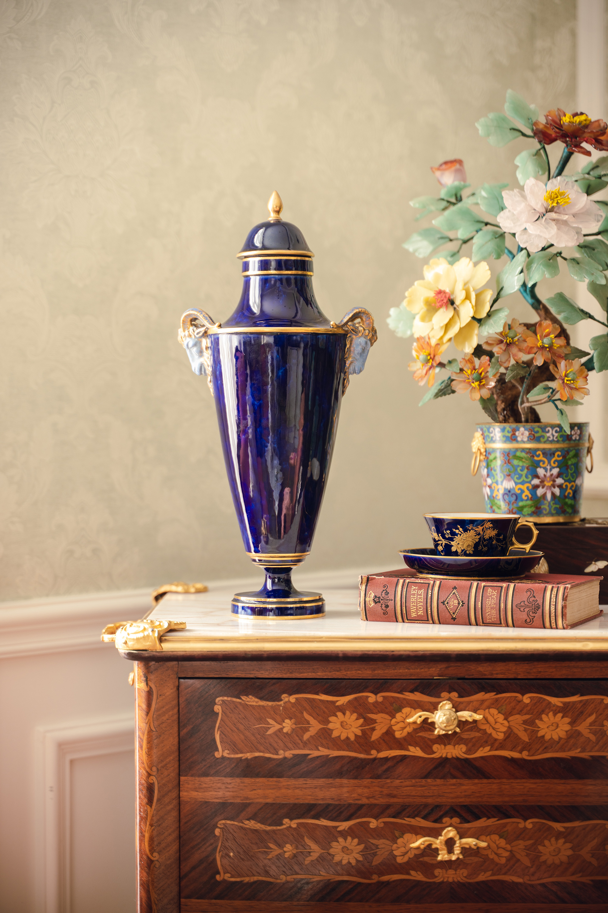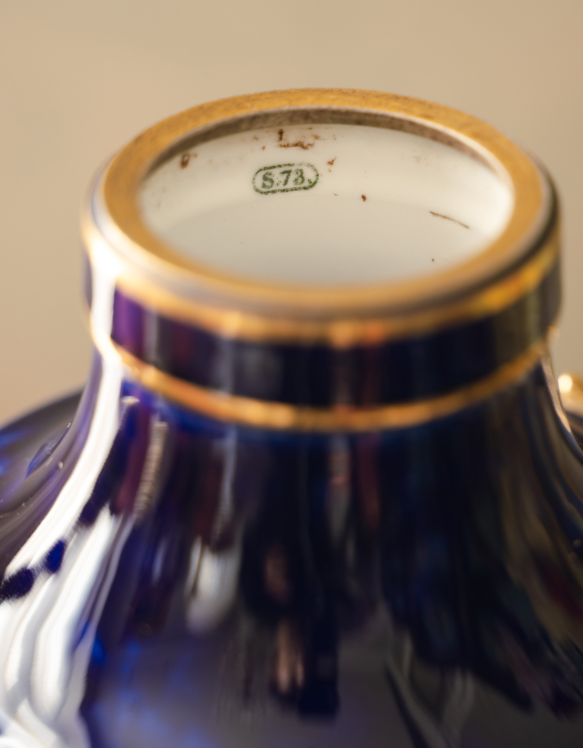 1879年代法国御窑塞弗尔签名出品手绘描金装饰羊首双耳云朵蓝釉带盖瓷瓶