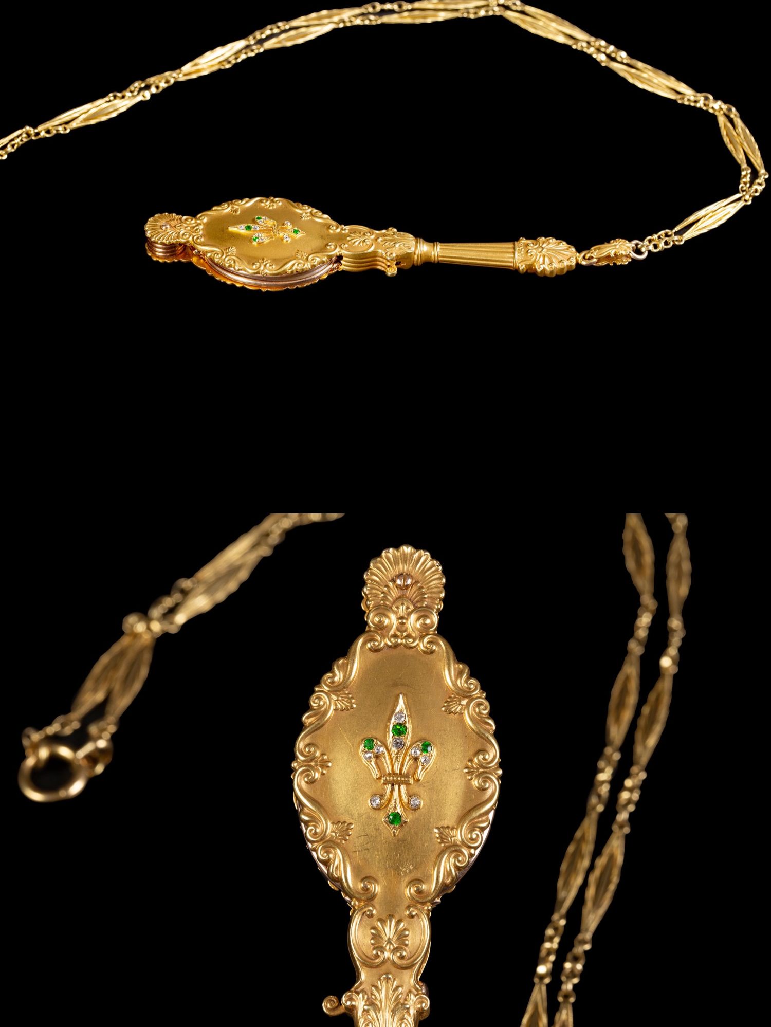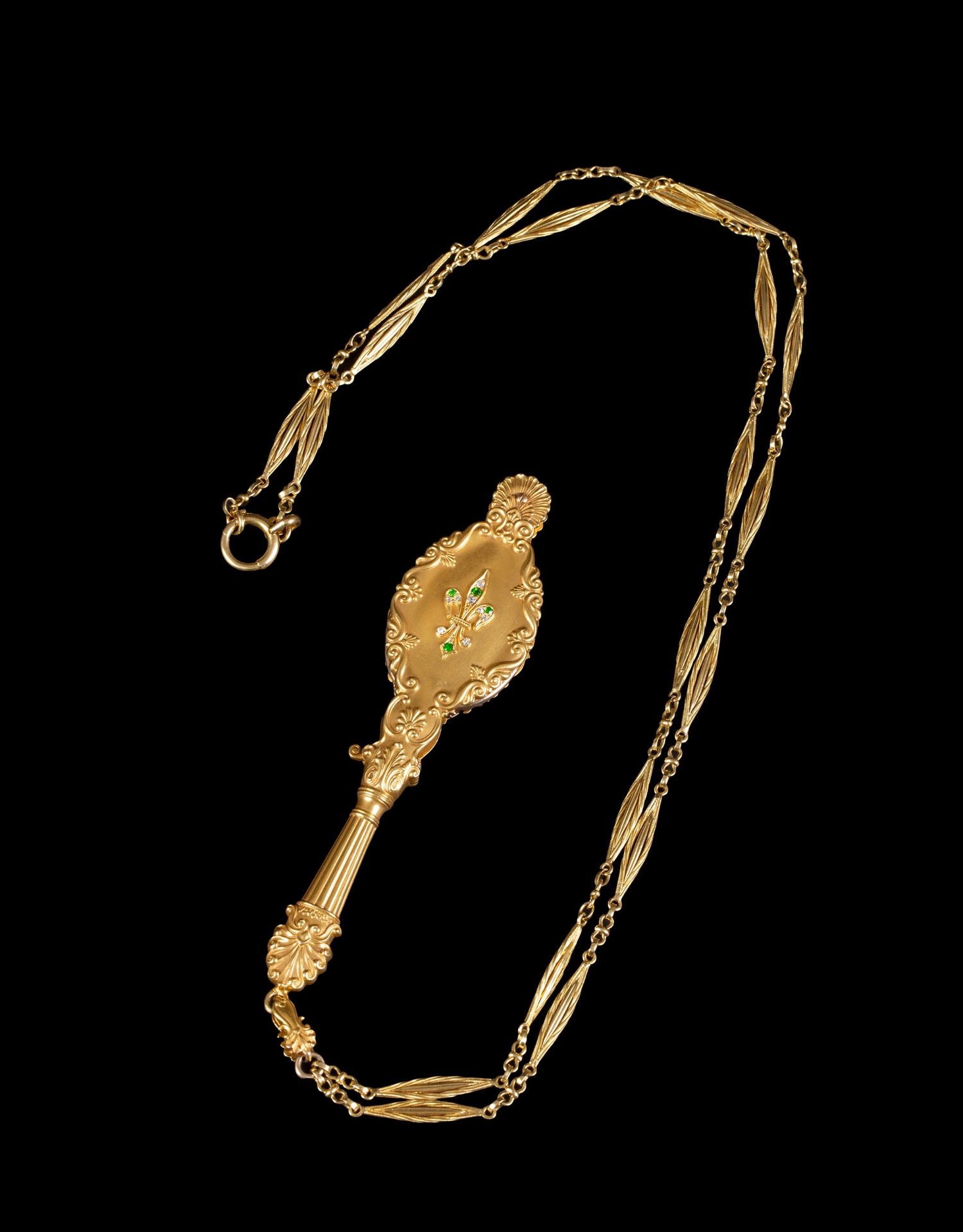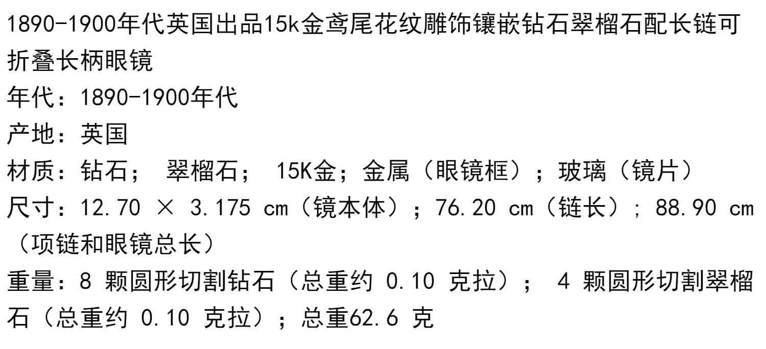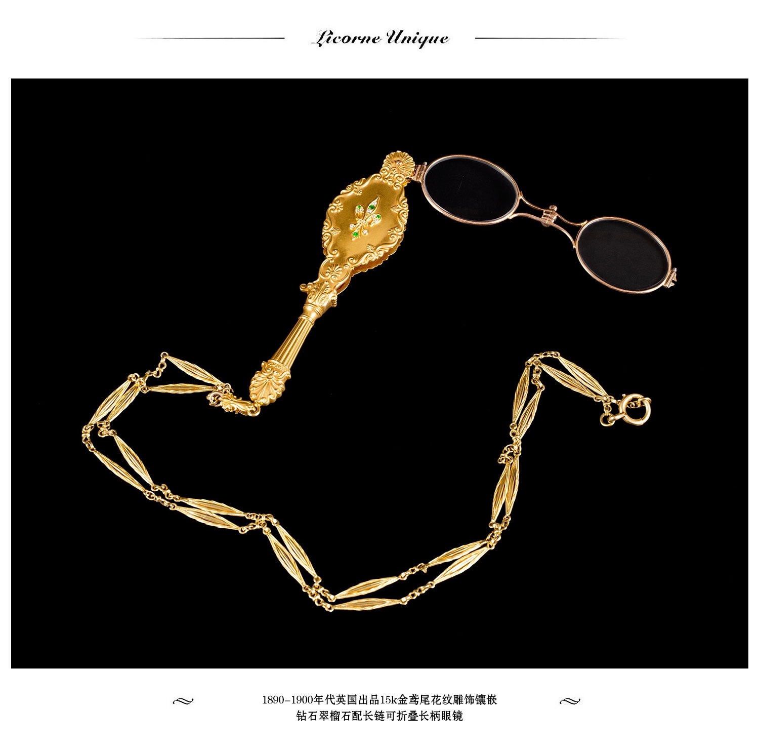独角鹿西洋古董15K金鸢尾花雕饰镶钻石翠榴石长链可折叠长柄眼镜