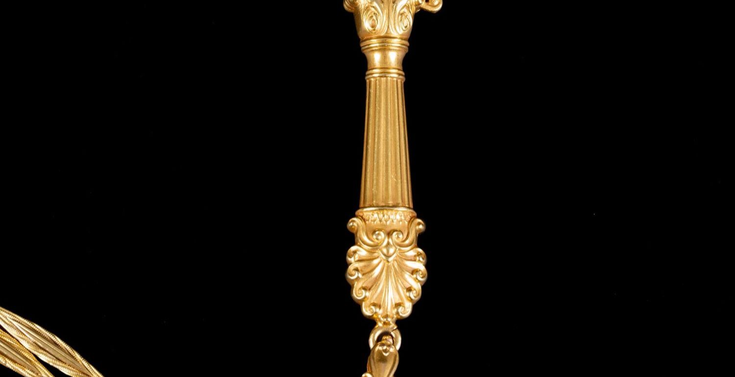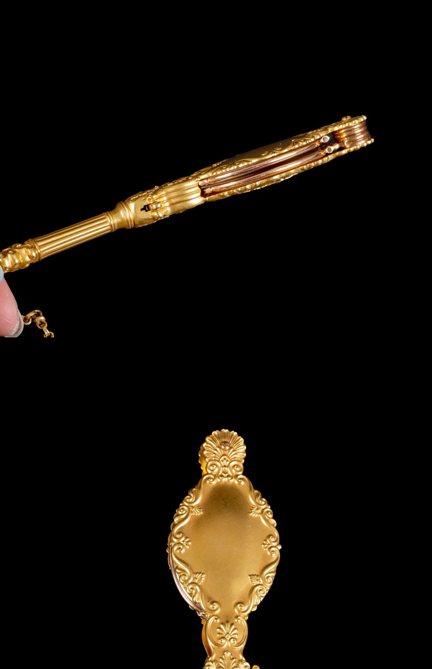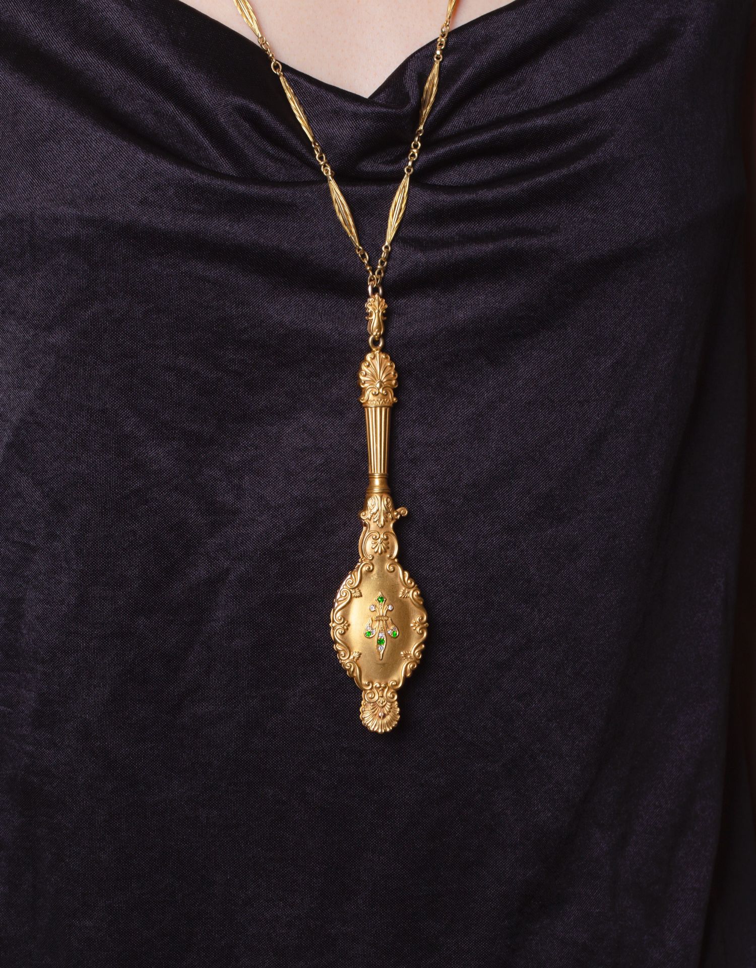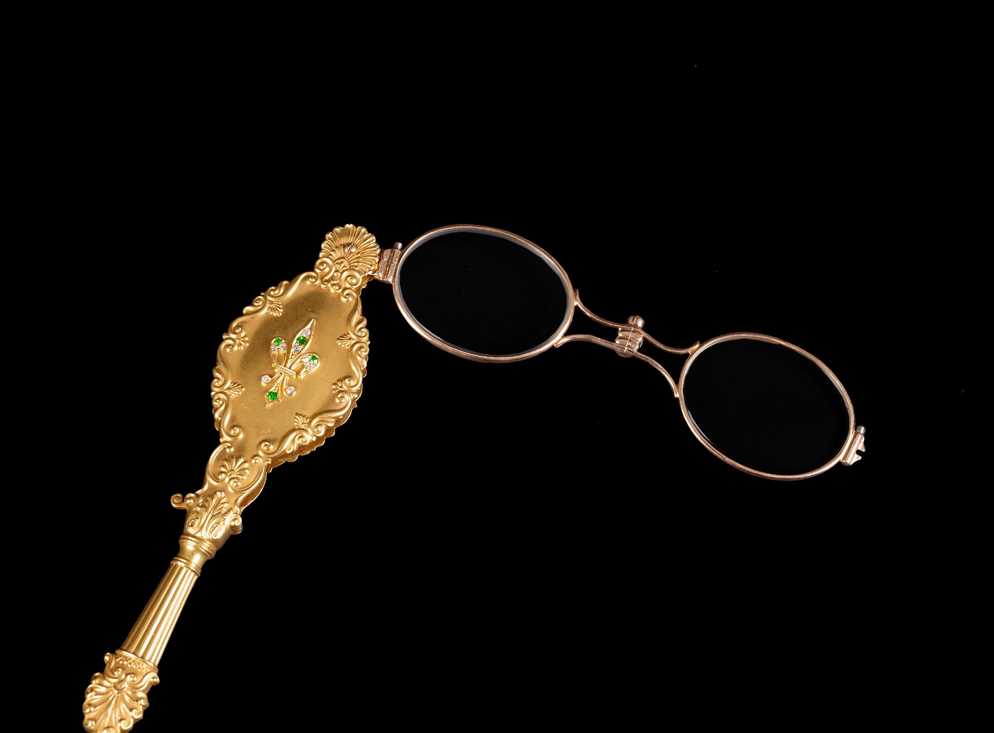 独角鹿西洋古董15K金鸢尾花雕饰镶钻石翠榴石长链可折叠长柄眼镜