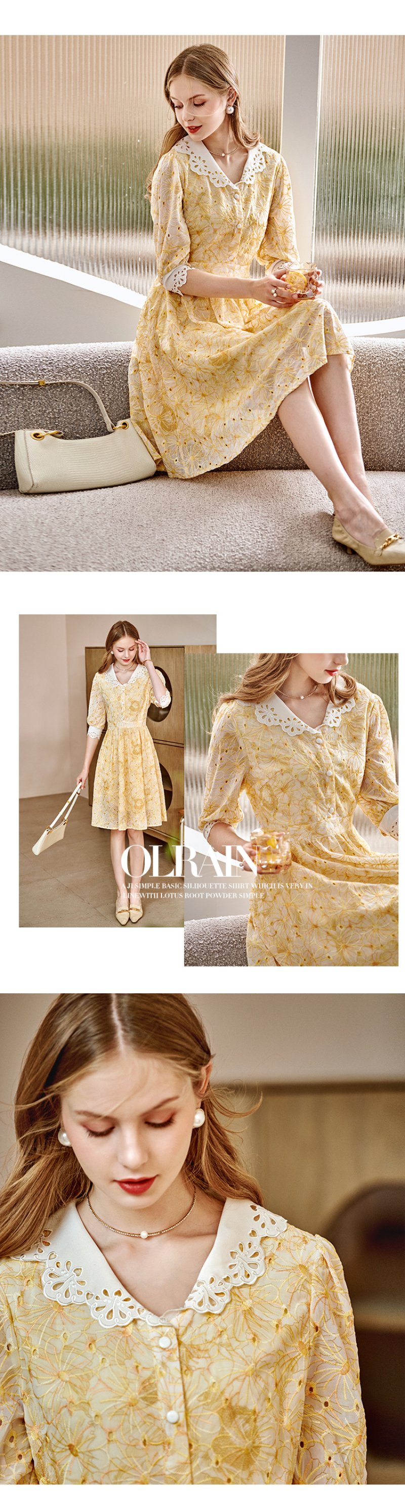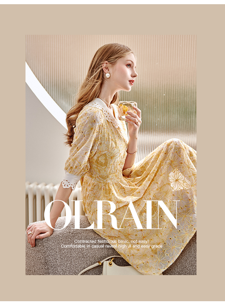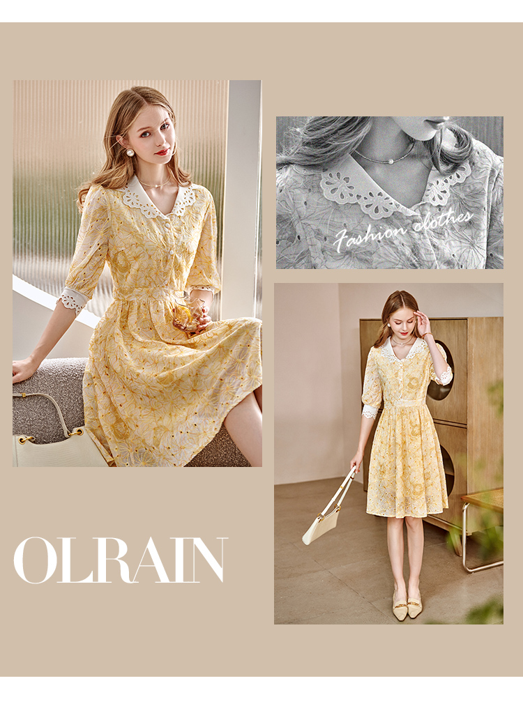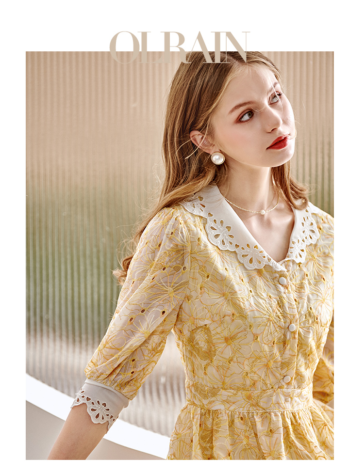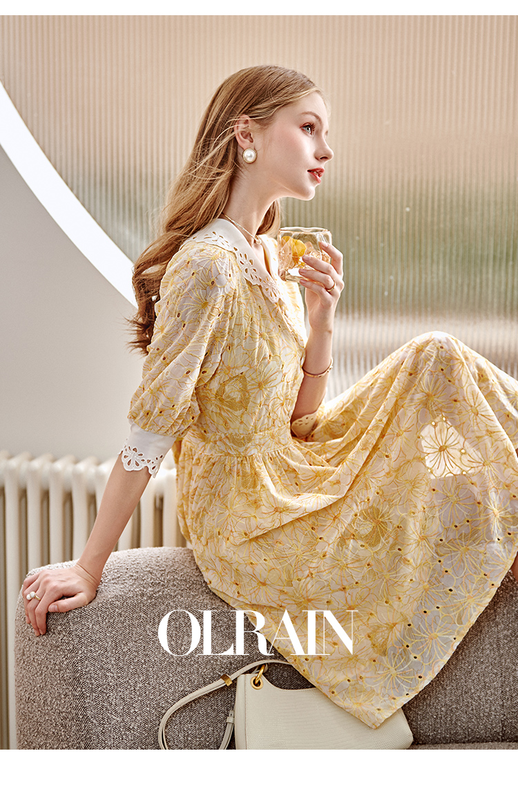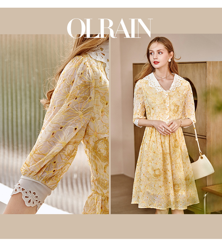 欧芮儿雪纺绣花连衣裙2021春季新款收腰显瘦复古优雅黄色裙子