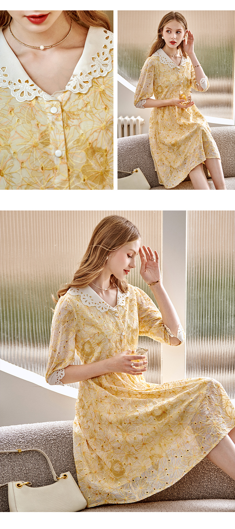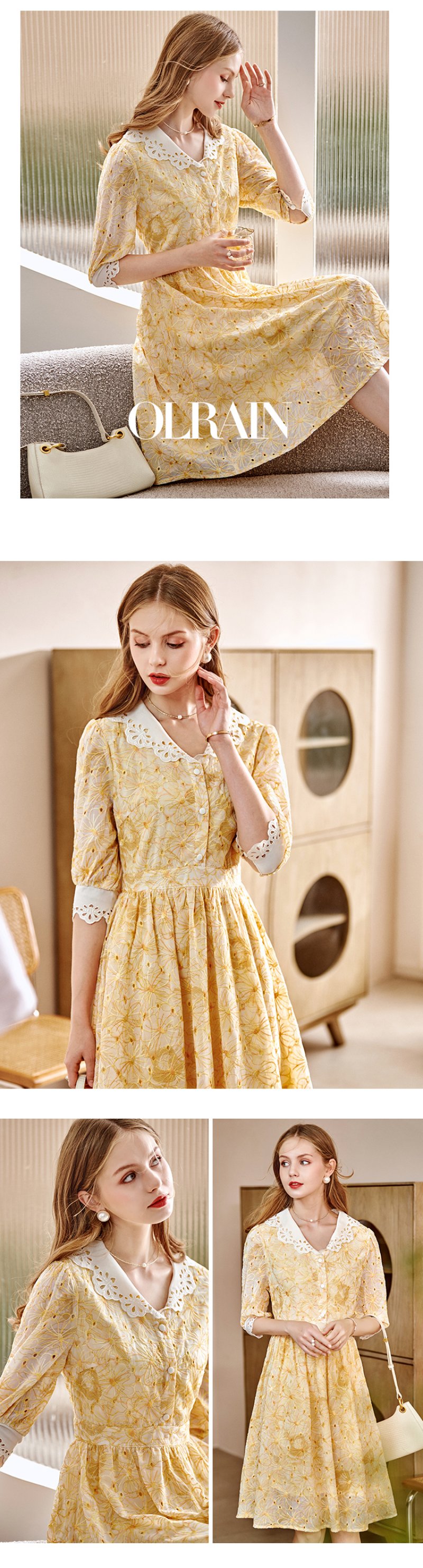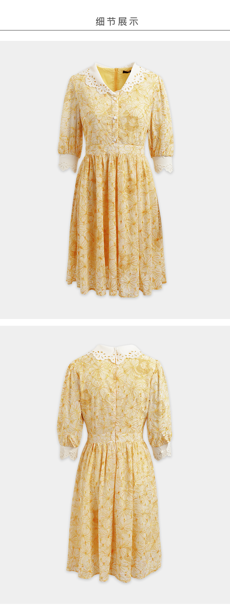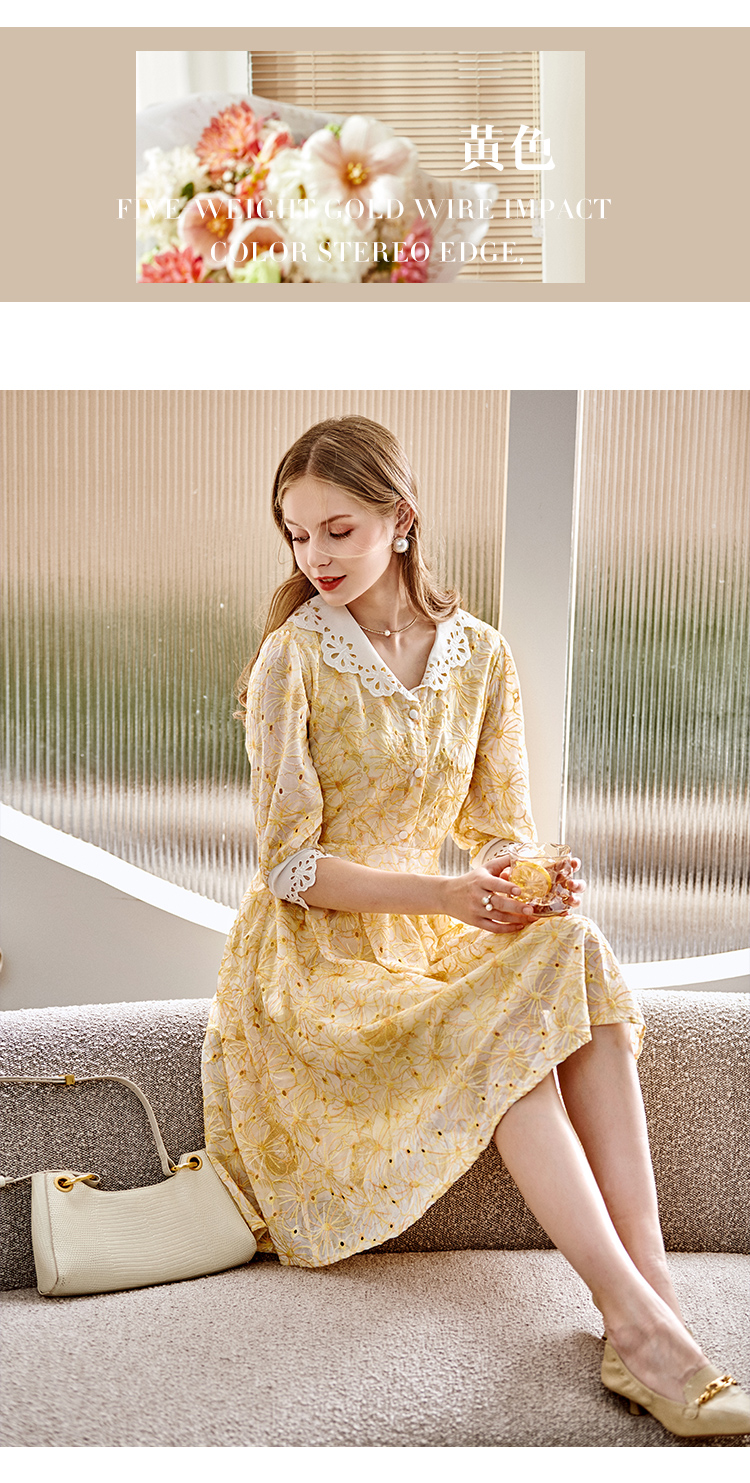 欧芮儿雪纺绣花连衣裙2021春季新款收腰显瘦复古优雅黄色裙子