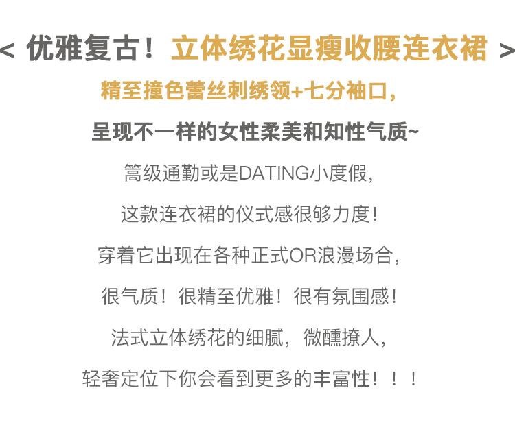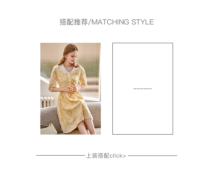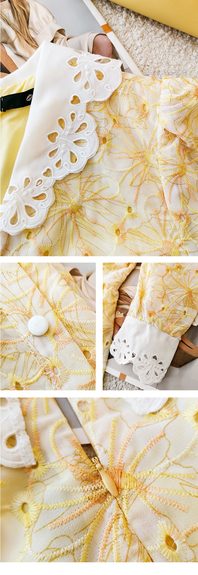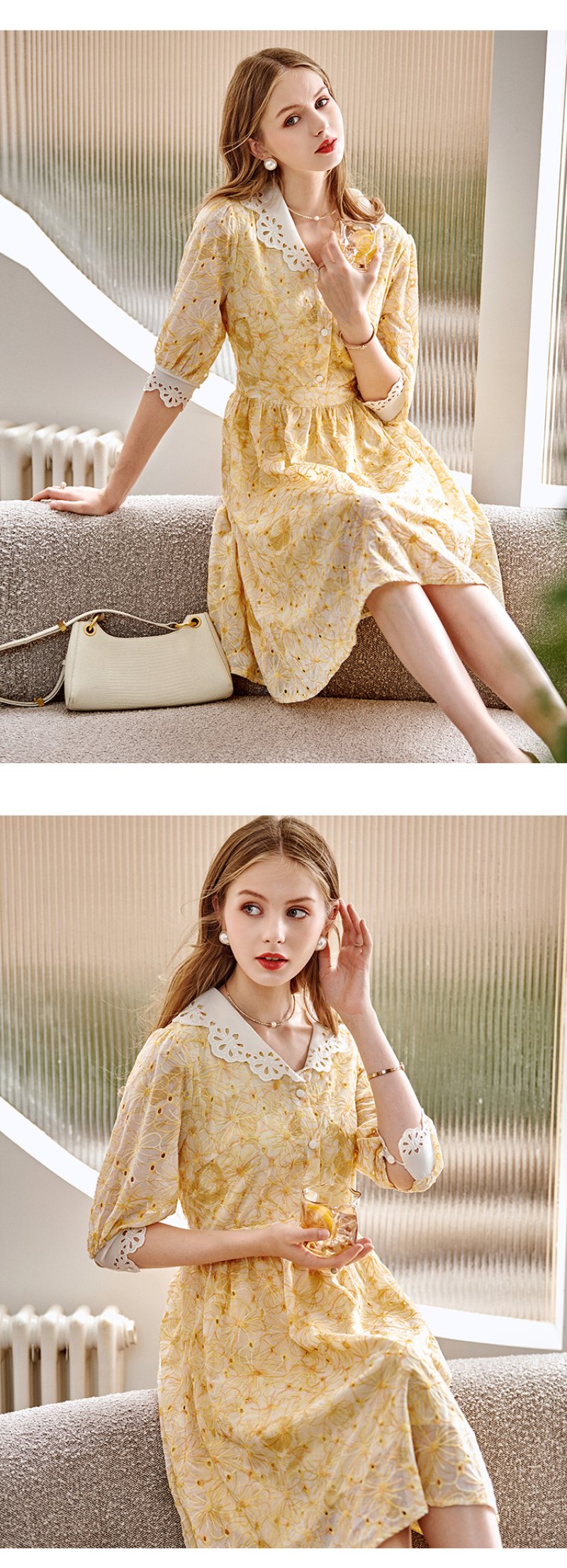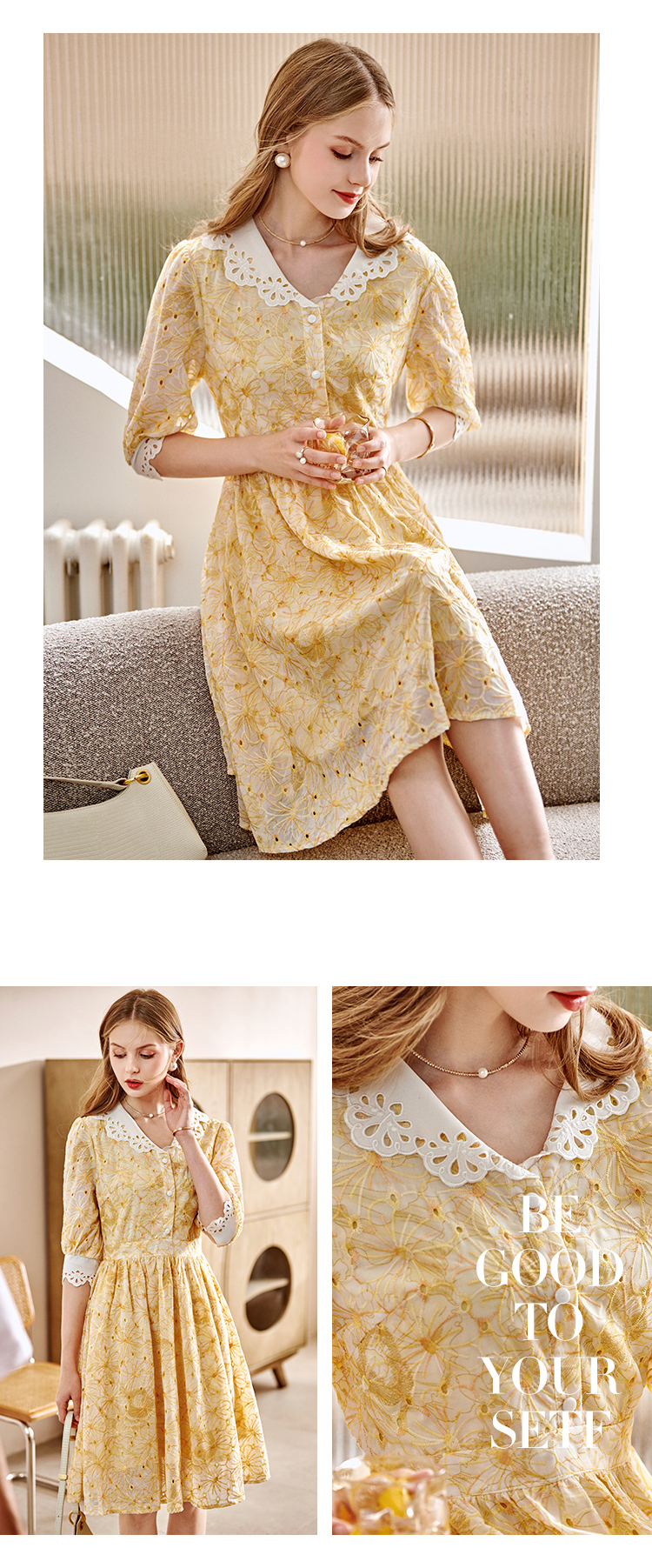 欧芮儿雪纺绣花连衣裙2021春季新款收腰显瘦复古优雅黄色裙子